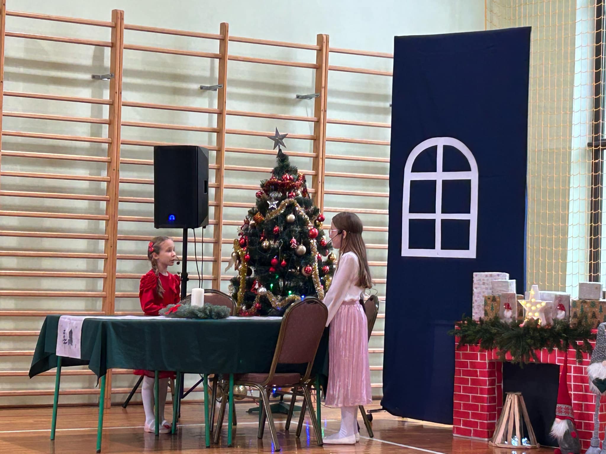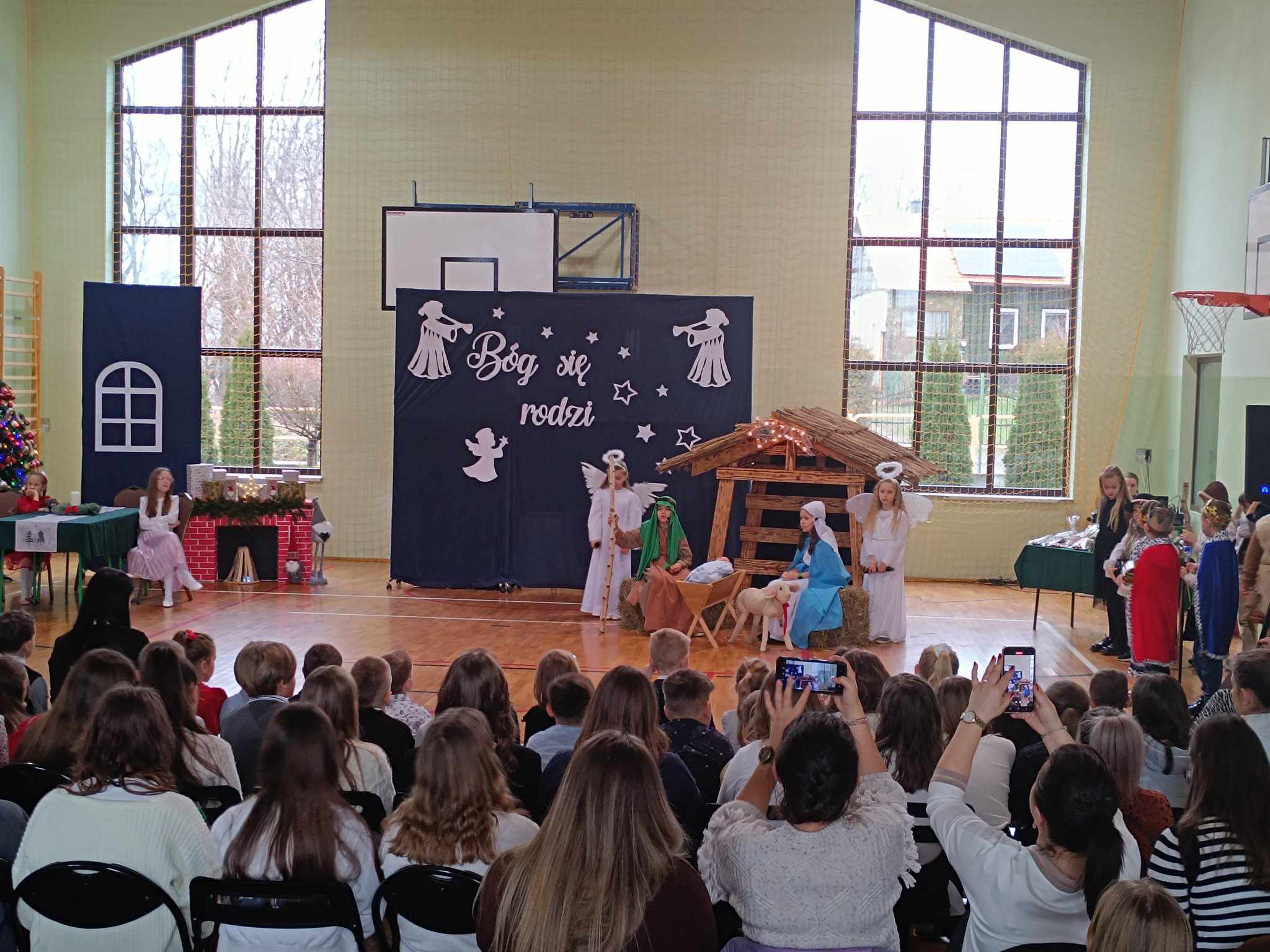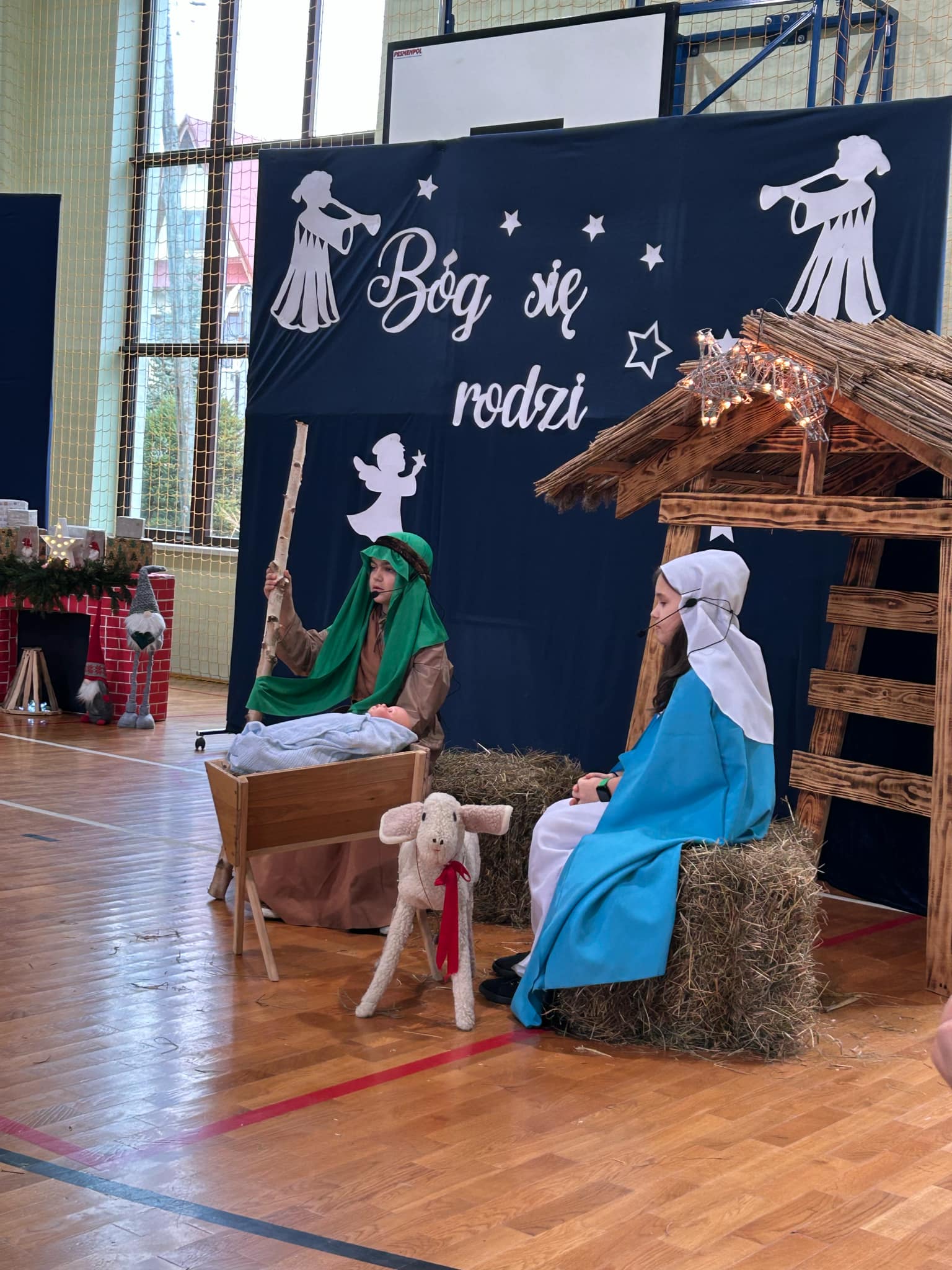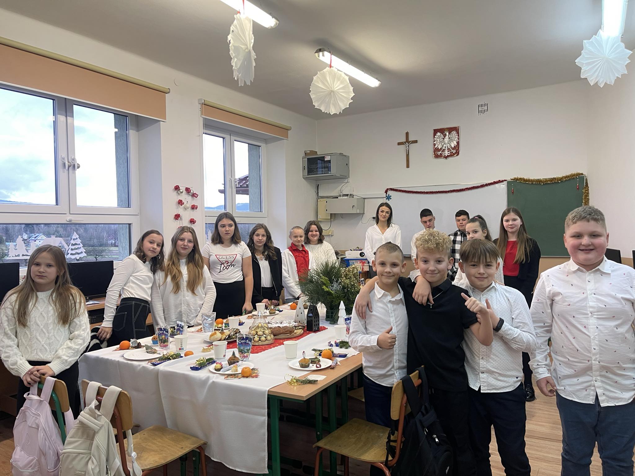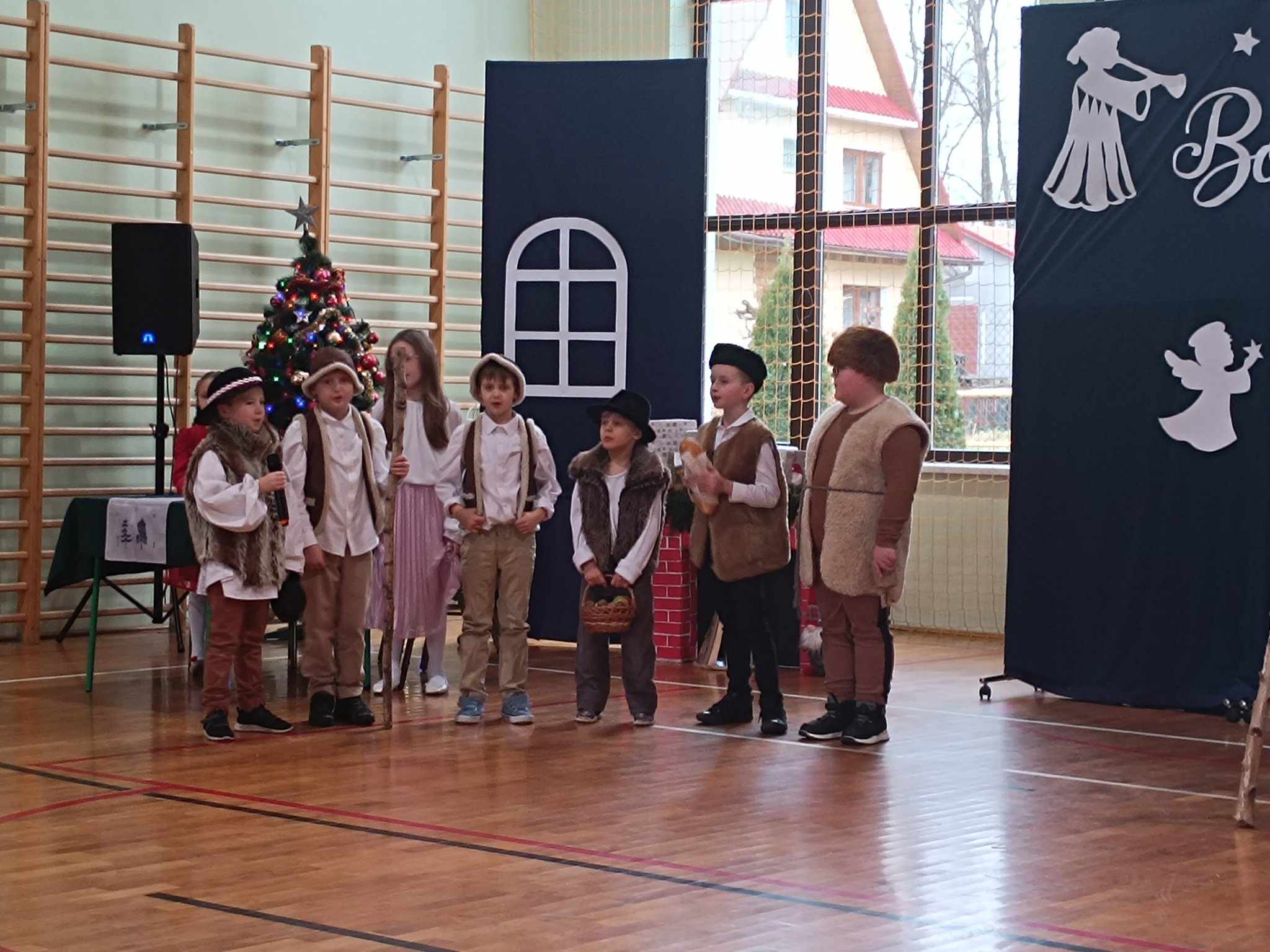 Miniony piątek był w naszej szkole inny niż na co dzień, niezwykły i wyjątkowy. Ponieważ piękne, długo wyczekiwane ŚWIĘTA BOŻEGO NARODZENIA tuż, tuż odbył się uroczysty apel bożonarodzeniowy oraz wigilie klasowe. Wesoły nastrój było czuć już od samego rana. Uczniowie, nauczyciele i rodzice ochoczo przygotowywali sale do spotkań opłatkowych. Zapach pierniczków, pomarańczy oraz choinki poprawiał każdemu nastrój w ten pochmurny dzień. Kiedy już wszystkie klasy zakończyły radosne biesiadowanie rozpoczęły się tradycyjne JASEŁKA. Uczniowie klasy drugiej i trzeciej pod opieką Pani Kingi Stabrawy przedstawiły widowisko słowno- muzyczne „Historia Cudownej Nocy”. Akcja rozgrywała się dwutorowo (współczesność i czasy narodzenia Chrystusa). Sceny związane z domowymi przygotowaniami do wieczerzy wigilijnej miały na celu wprowadzenie świątecznej atmosfery, przypomnienie tradycji i zwyczajów związanych z obchodami Bożego Narodzenia. Pokazywały także wspaniałą relację matki z córką. Występowali: mama i córka, Maryja i Józef, aniołowie, pastuszkowie, królowie i narratorzy. Oczywiście nie zabrakło pięknej dekoracji, świetnie dopracowanych strojów i rekwizytów, a cudnym podsumowaniem wspólnego świętowania był śpiew znanym wszystkim kolęd i pastorałek. Na koniec apelu Pani Dyrektor złożyła wszystkim nauczycielom, pracownikom szkoły i uczniom najserdeczniejsze świąteczne życzenia. Przedstawiciele Samorządu Uczniowskiego również tradycyjnie skierowali słowa życzeń oraz upominki dla pedagogów i pracowników obsługi.