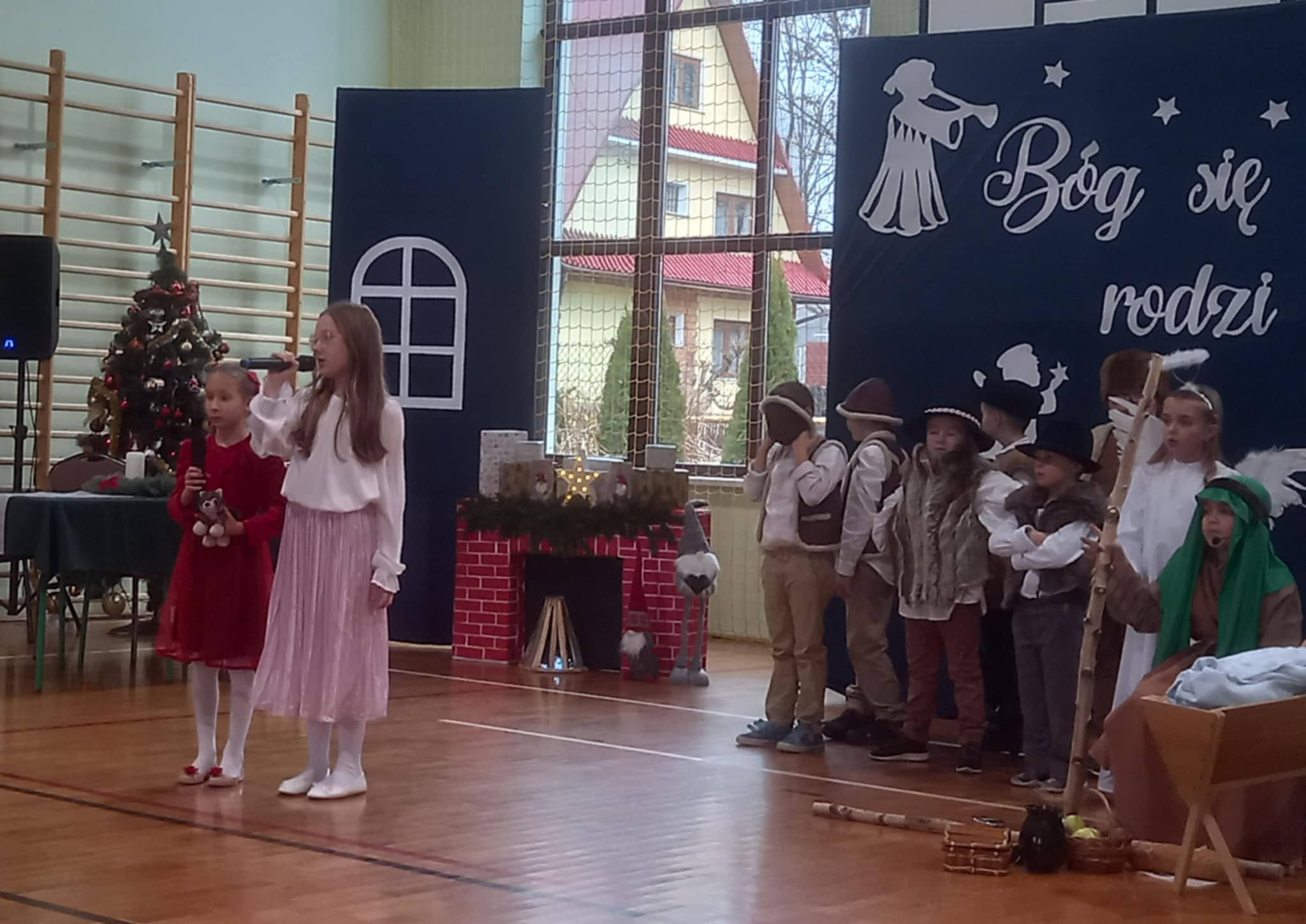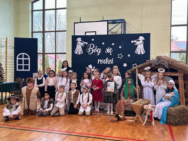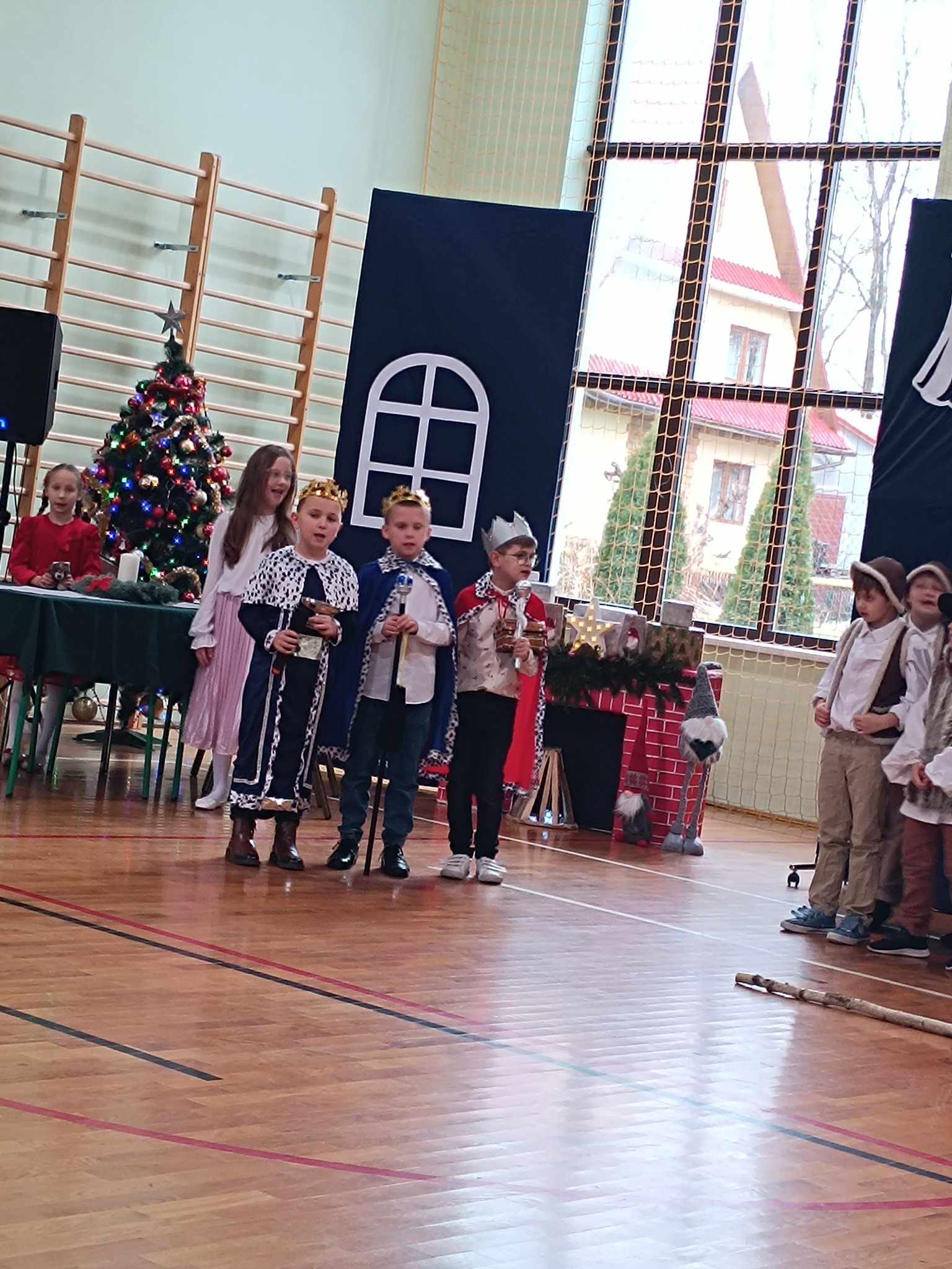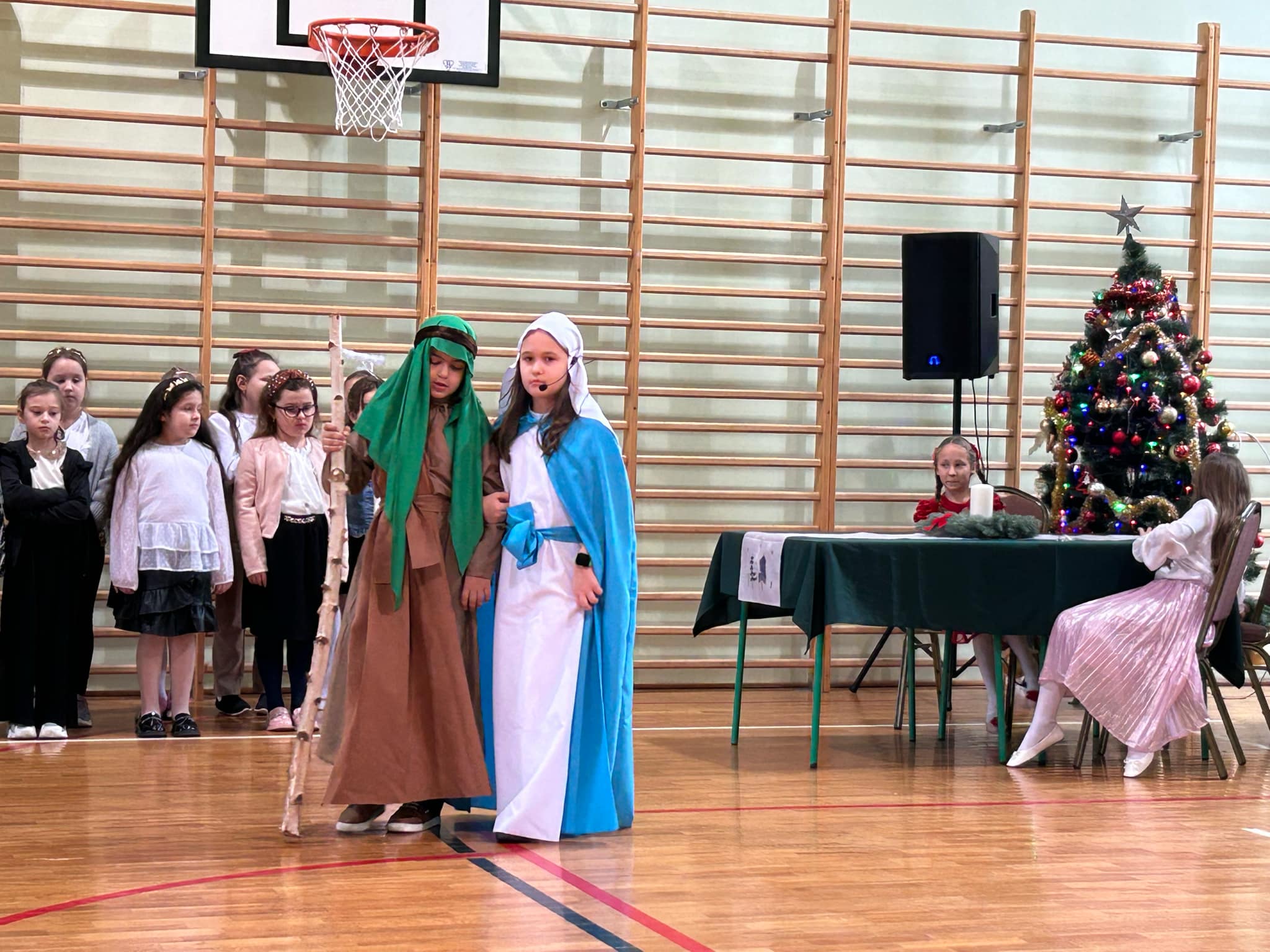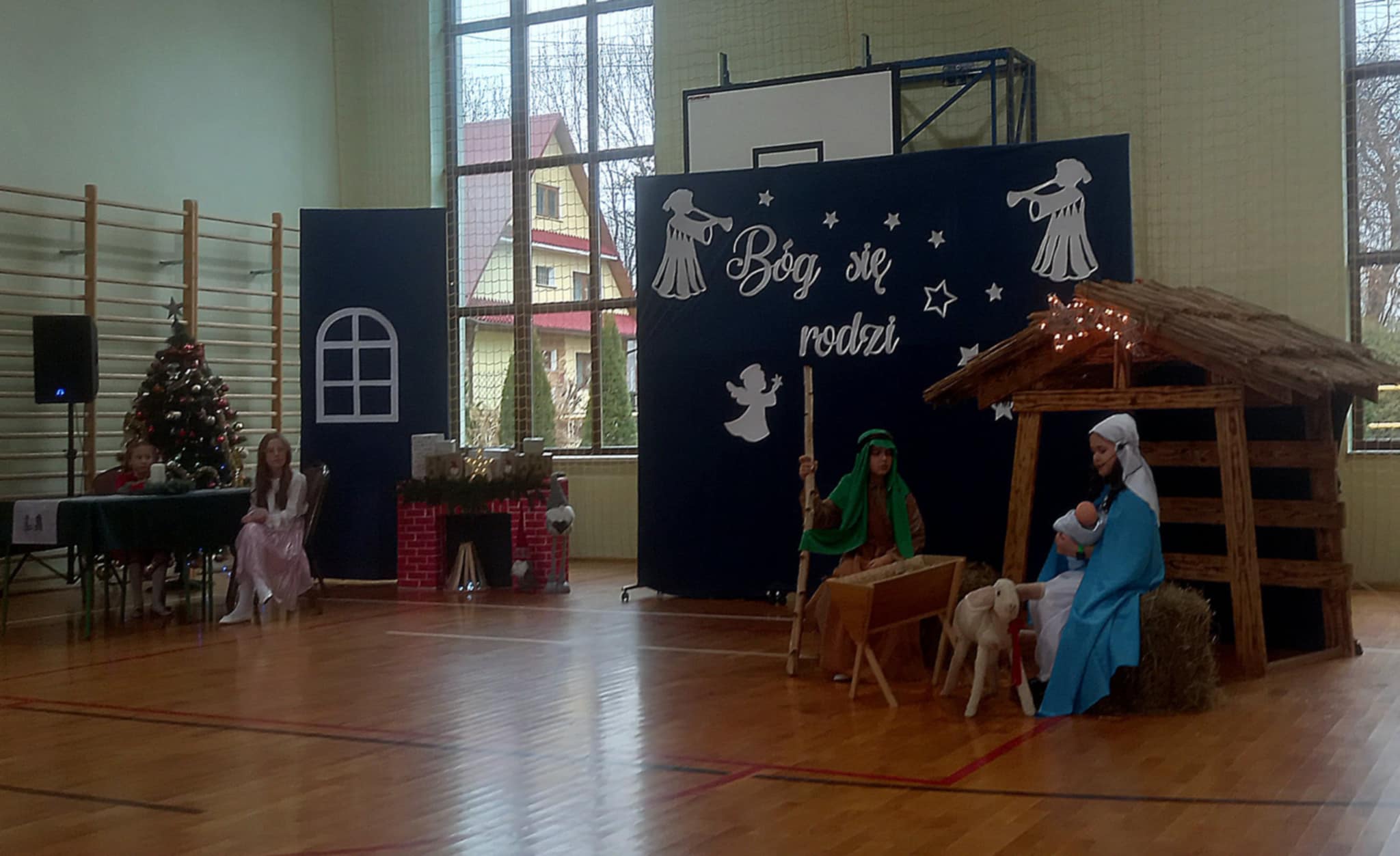 Miniony piątek był w naszej szkole inny niż na co dzień, niezwykły i wyjątkowy. Ponieważ piękne, długo wyczekiwane ŚWIĘTA BOŻEGO NARODZENIA tuż, tuż odbył się uroczysty apel bożonarodzeniowy oraz wigilie klasowe. Wesoły nastrój było czuć już od samego rana. Uczniowie, nauczyciele i rodzice ochoczo przygotowywali sale do spotkań opłatkowych. Zapach pierniczków, pomarańczy oraz choinki poprawiał każdemu nastrój w ten pochmurny dzień. Kiedy już wszystkie klasy zakończyły radosne biesiadowanie rozpoczęły się tradycyjne JASEŁKA. Uczniowie klasy drugiej i trzeciej pod opieką Pani Kingi Stabrawy przedstawiły widowisko słowno- muzyczne „Historia Cudownej Nocy”. Akcja rozgrywała się dwutorowo (współczesność i czasy narodzenia Chrystusa). Sceny związane z domowymi przygotowaniami do wieczerzy wigilijnej miały na celu wprowadzenie świątecznej atmosfery, przypomnienie tradycji i zwyczajów związanych z obchodami Bożego Narodzenia. Pokazywały także wspaniałą relację matki z córką. Występowali: mama i córka, Maryja i Józef, aniołowie, pastuszkowie, królowie i narratorzy. Oczywiście nie zabrakło pięknej dekoracji, świetnie dopracowanych strojów i rekwizytów, a cudnym podsumowaniem wspólnego świętowania był śpiew znanym wszystkim kolęd i pastorałek. Na koniec apelu Pani Dyrektor złożyła wszystkim nauczycielom, pracownikom szkoły i uczniom najserdeczniejsze świąteczne życzenia. Przedstawiciele Samorządu Uczniowskiego również tradycyjnie skierowali słowa życzeń oraz upominki dla pedagogów i pracowników obsługi.