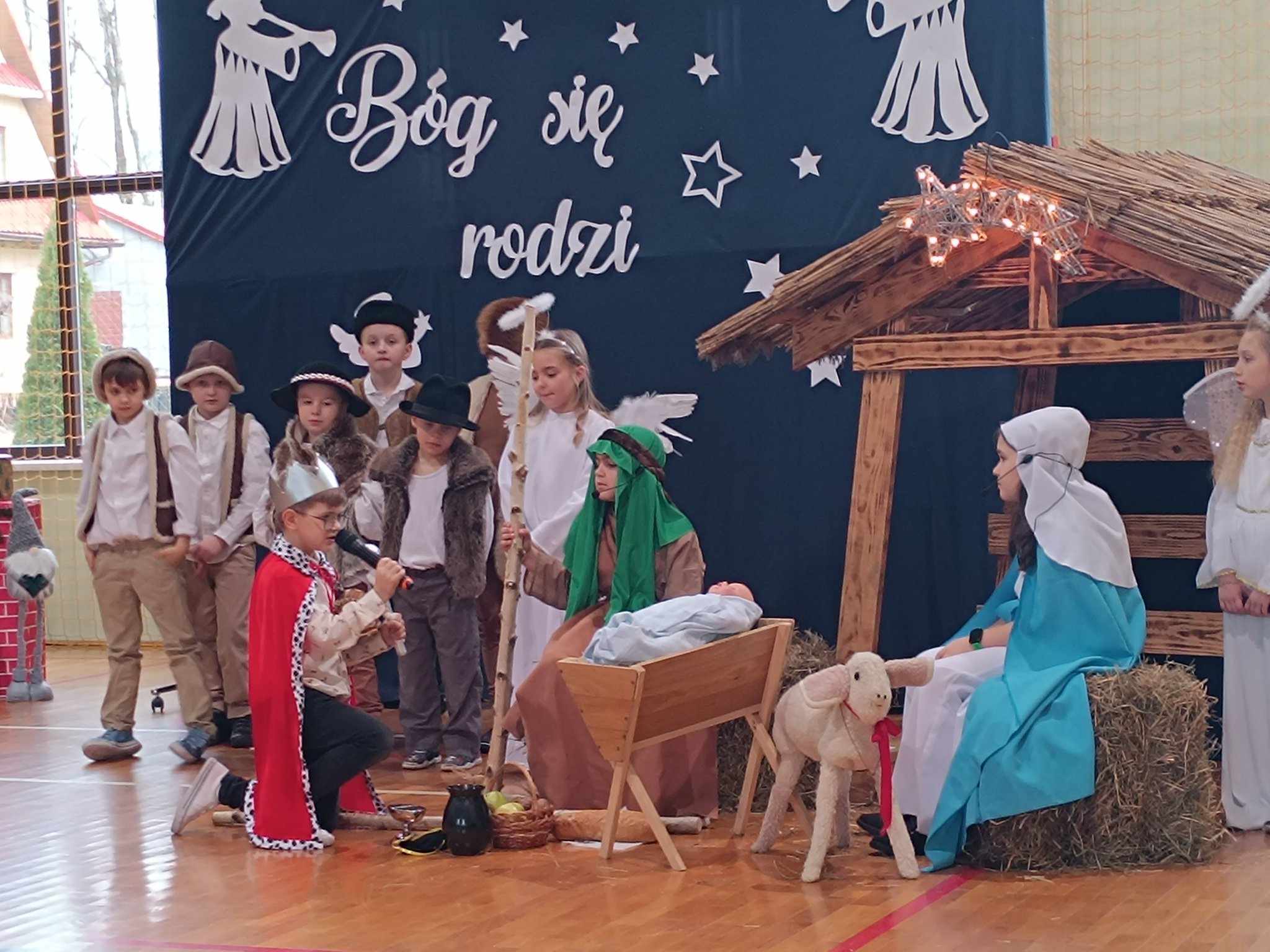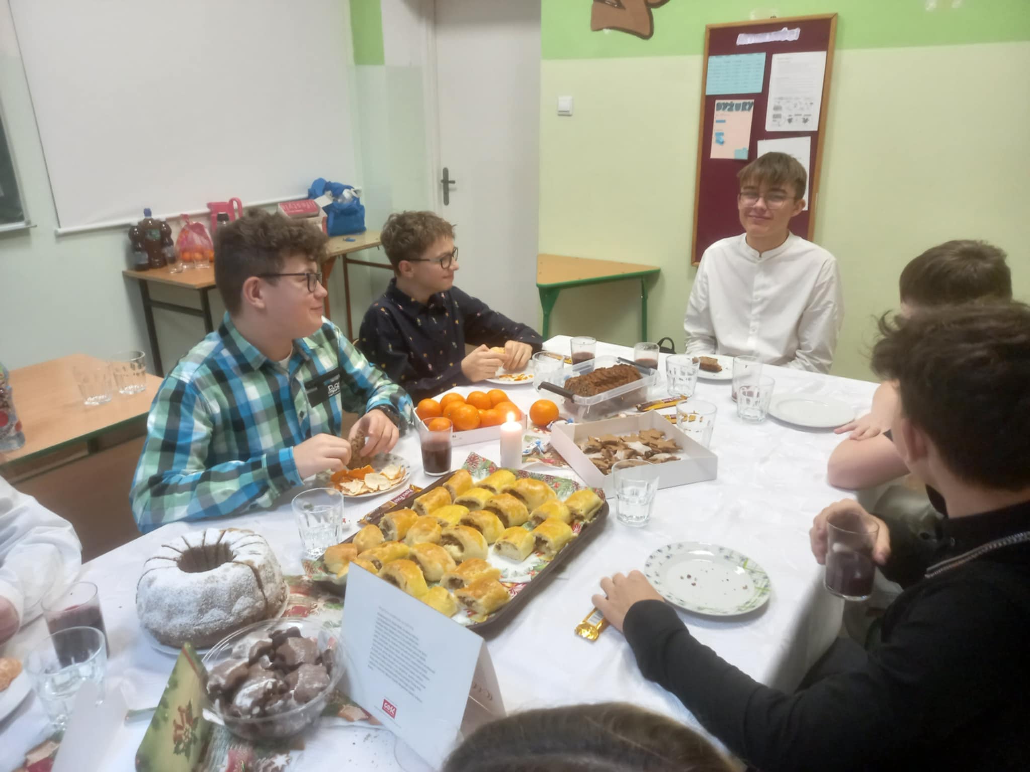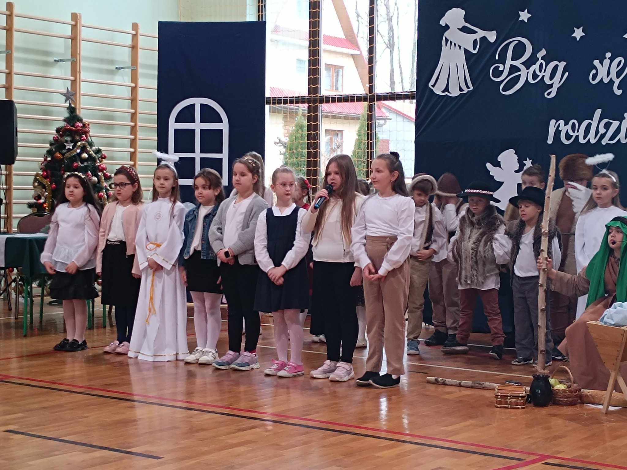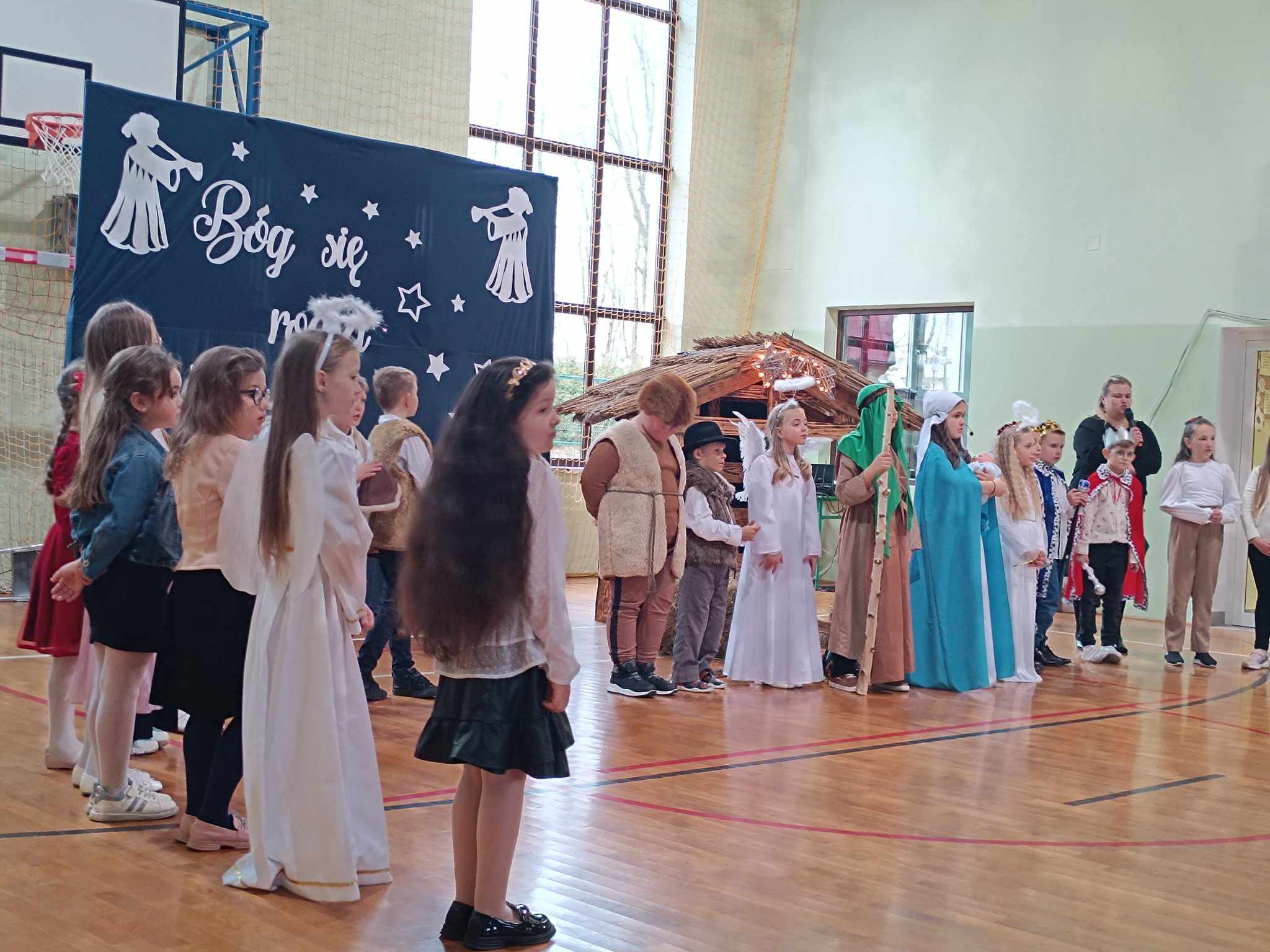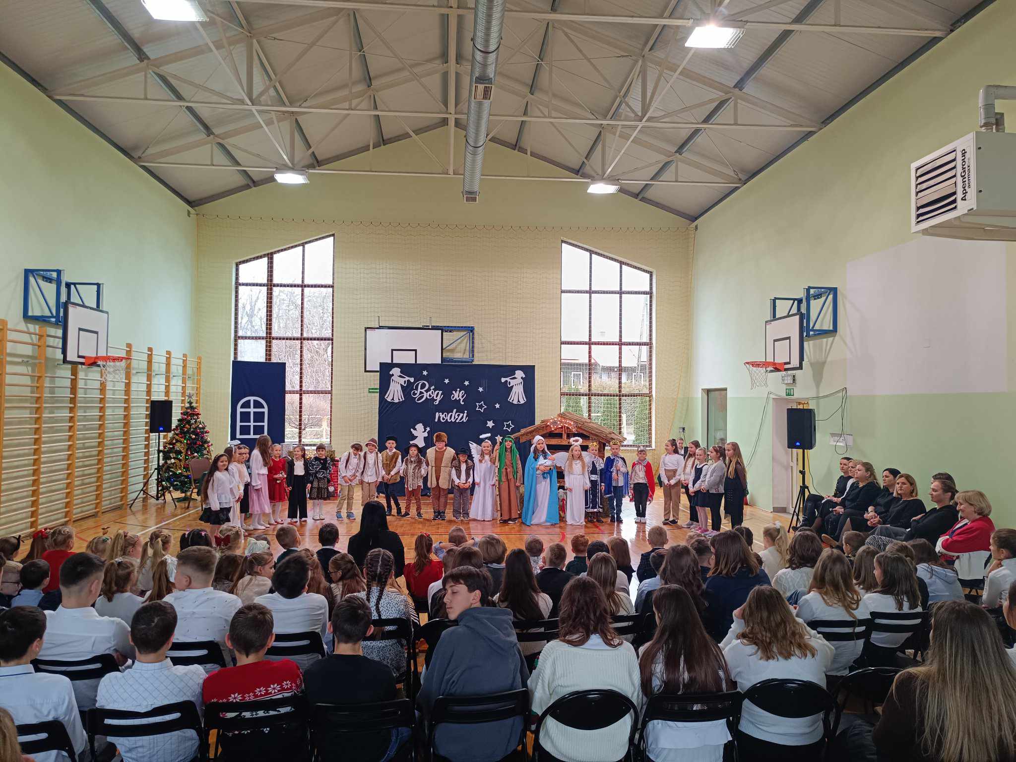 Miniony piątek był w naszej szkole inny niż na co dzień, niezwykły i wyjątkowy. Ponieważ piękne, długo wyczekiwane ŚWIĘTA BOŻEGO NARODZENIA tuż, tuż odbył się uroczysty apel bożonarodzeniowy oraz wigilie klasowe. Wesoły nastrój było czuć już od samego rana. Uczniowie, nauczyciele i rodzice ochoczo przygotowywali sale do spotkań opłatkowych. Zapach pierniczków, pomarańczy oraz choinki poprawiał każdemu nastrój w ten pochmurny dzień. Kiedy już wszystkie klasy zakończyły radosne biesiadowanie rozpoczęły się tradycyjne JASEŁKA. Uczniowie klasy drugiej i trzeciej pod opieką Pani Kingi Stabrawy przedstawiły widowisko słowno- muzyczne „Historia Cudownej Nocy”. Akcja rozgrywała się dwutorowo (współczesność i czasy narodzenia Chrystusa). Sceny związane z domowymi przygotowaniami do wieczerzy wigilijnej miały na celu wprowadzenie świątecznej atmosfery, przypomnienie tradycji i zwyczajów związanych z obchodami Bożego Narodzenia. Pokazywały także wspaniałą relację matki z córką. Występowali: mama i córka, Maryja i Józef, aniołowie, pastuszkowie, królowie i narratorzy. Oczywiście nie zabrakło pięknej dekoracji, świetnie dopracowanych strojów i rekwizytów, a cudnym podsumowaniem wspólnego świętowania był śpiew znanym wszystkim kolęd i pastorałek. Na koniec apelu Pani Dyrektor złożyła wszystkim nauczycielom, pracownikom szkoły i uczniom najserdeczniejsze świąteczne życzenia. Przedstawiciele Samorządu Uczniowskiego również tradycyjnie skierowali słowa życzeń oraz upominki dla pedagogów i pracowników obsługi.