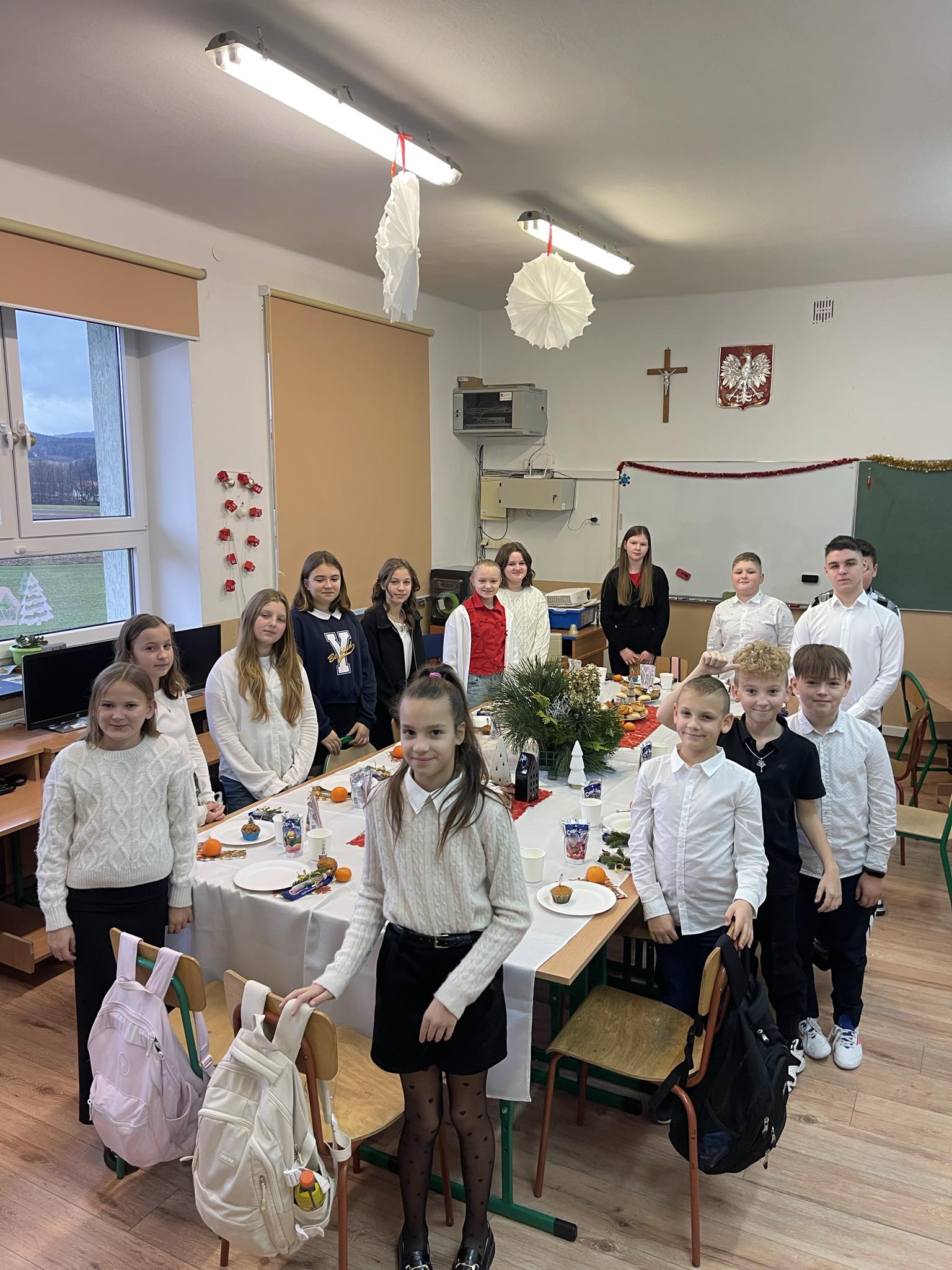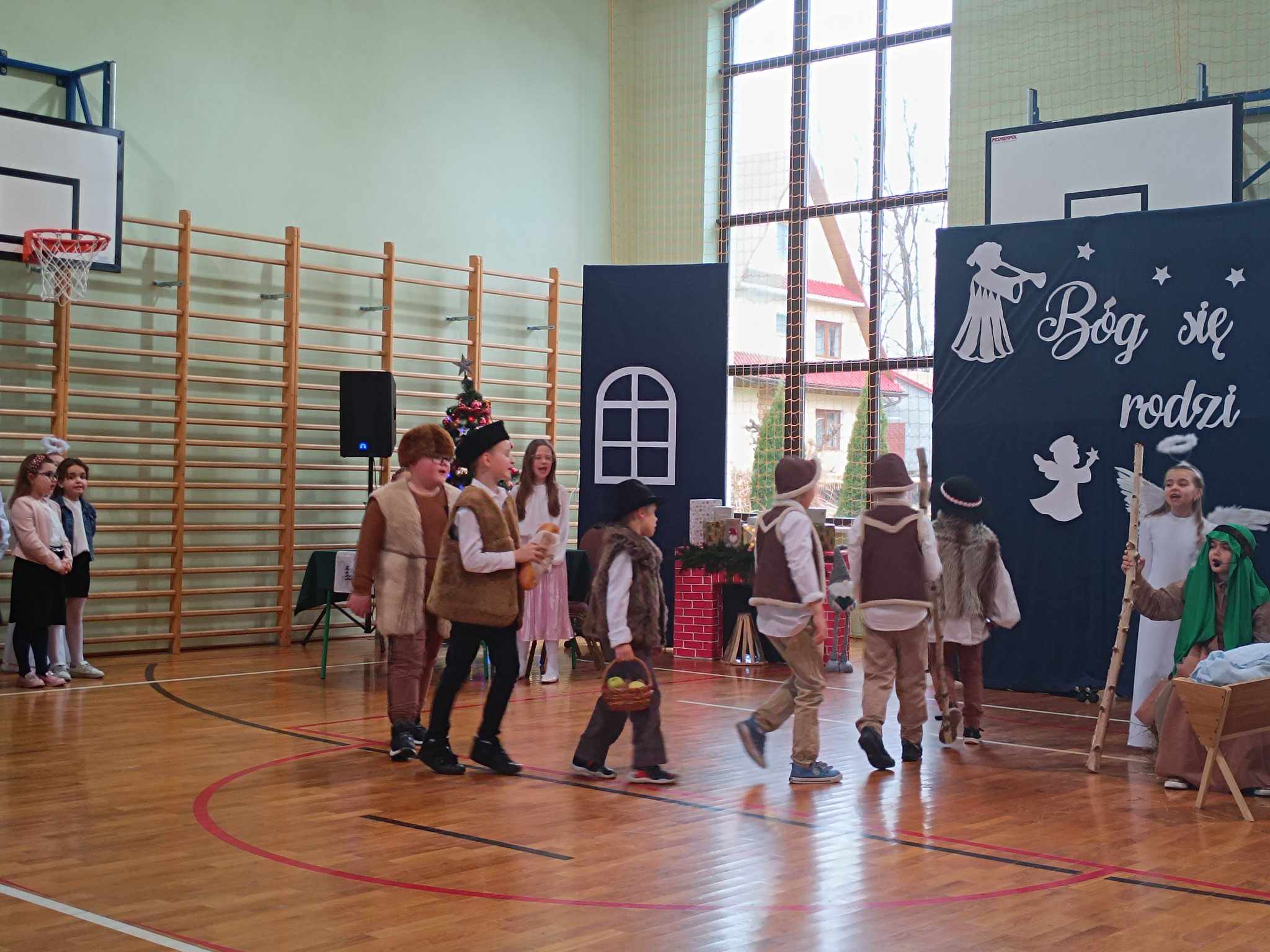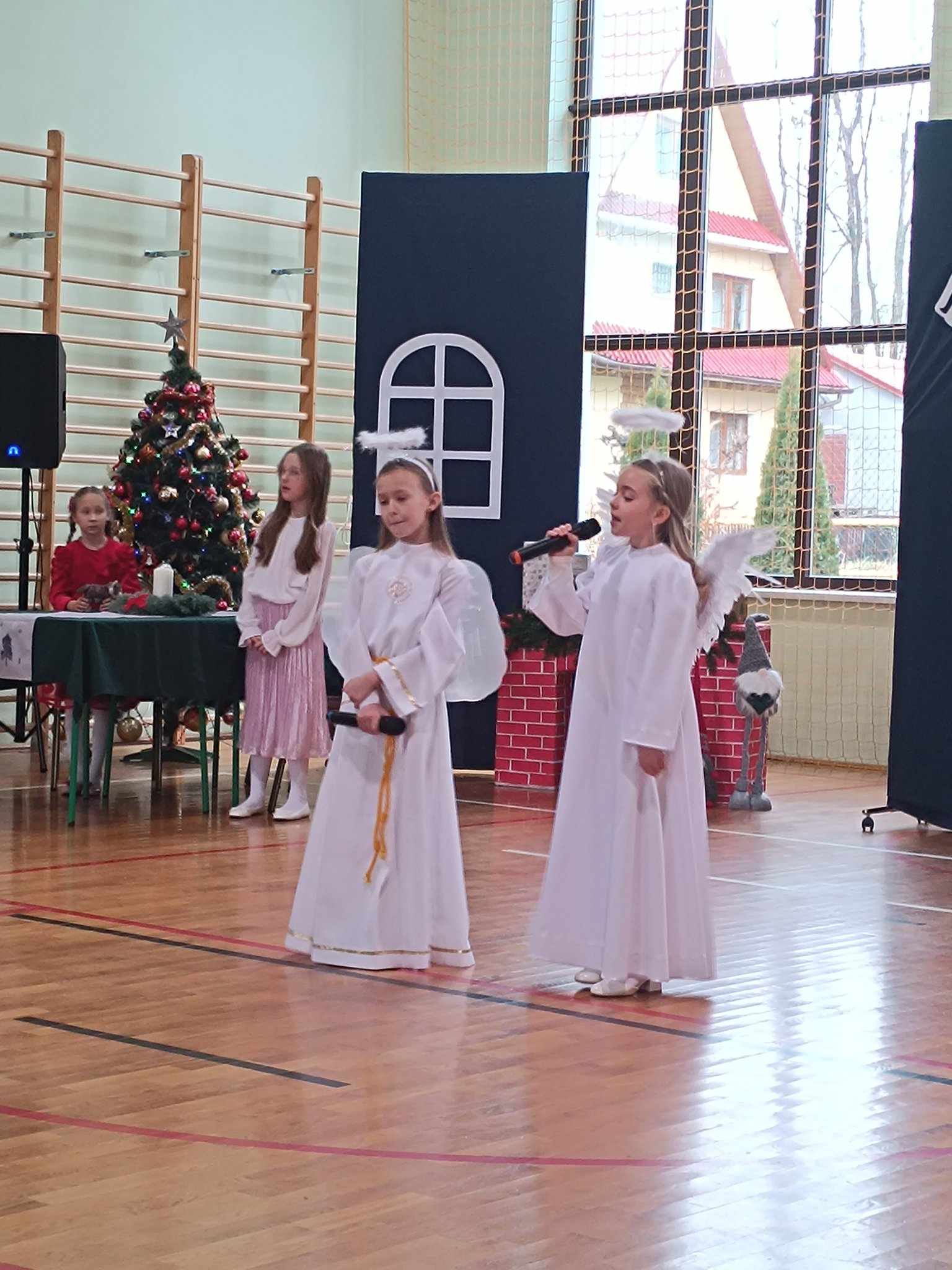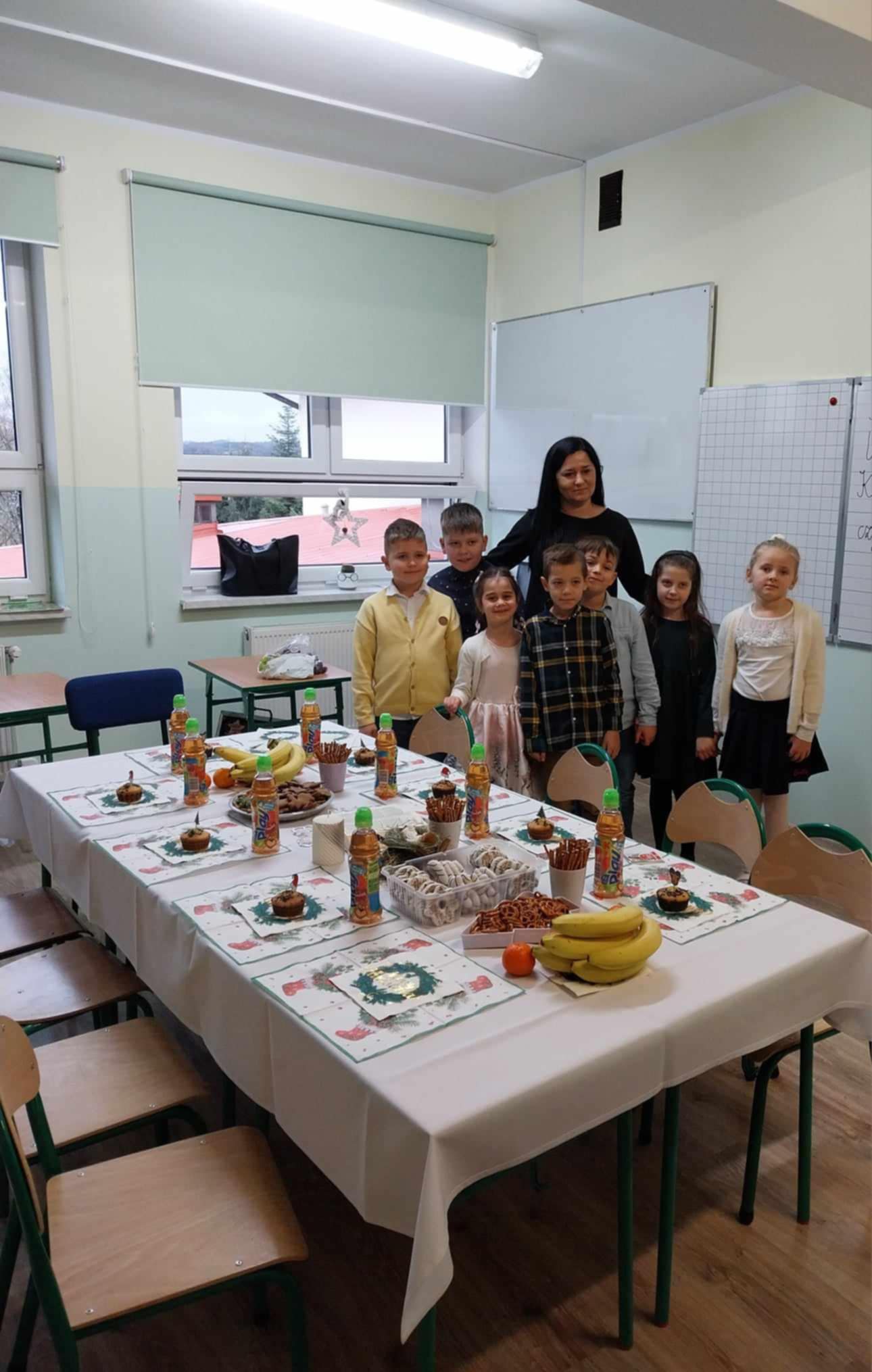 Miniony piątek był w naszej szkole inny niż na co dzień, niezwykły i wyjątkowy. Ponieważ piękne, długo wyczekiwane ŚWIĘTA BOŻEGO NARODZENIA tuż, tuż odbył się uroczysty apel bożonarodzeniowy oraz wigilie klasowe. Wesoły nastrój było czuć już od samego rana. Uczniowie, nauczyciele i rodzice ochoczo przygotowywali sale do spotkań opłatkowych. Zapach pierniczków, pomarańczy oraz choinki poprawiał każdemu nastrój w ten pochmurny dzień. Kiedy już wszystkie klasy zakończyły radosne biesiadowanie rozpoczęły się tradycyjne JASEŁKA. Uczniowie klasy drugiej i trzeciej pod opieką Pani Kingi Stabrawy przedstawiły widowisko słowno- muzyczne „Historia Cudownej Nocy”. Akcja rozgrywała się dwutorowo (współczesność i czasy narodzenia Chrystusa). Sceny związane z domowymi przygotowaniami do wieczerzy wigilijnej miały na celu wprowadzenie świątecznej atmosfery, przypomnienie tradycji i zwyczajów związanych z obchodami Bożego Narodzenia. Pokazywały także wspaniałą relację matki z córką. Występowali: mama i córka, Maryja i Józef, aniołowie, pastuszkowie, królowie i narratorzy. Oczywiście nie zabrakło pięknej dekoracji, świetnie dopracowanych strojów i rekwizytów, a cudnym podsumowaniem wspólnego świętowania był śpiew znanym wszystkim kolęd i pastorałek. Na koniec apelu Pani Dyrektor złożyła wszystkim nauczycielom, pracownikom szkoły i uczniom najserdeczniejsze świąteczne życzenia. Przedstawiciele Samorządu Uczniowskiego również tradycyjnie skierowali słowa życzeń oraz upominki dla pedagogów i pracowników obsługi.