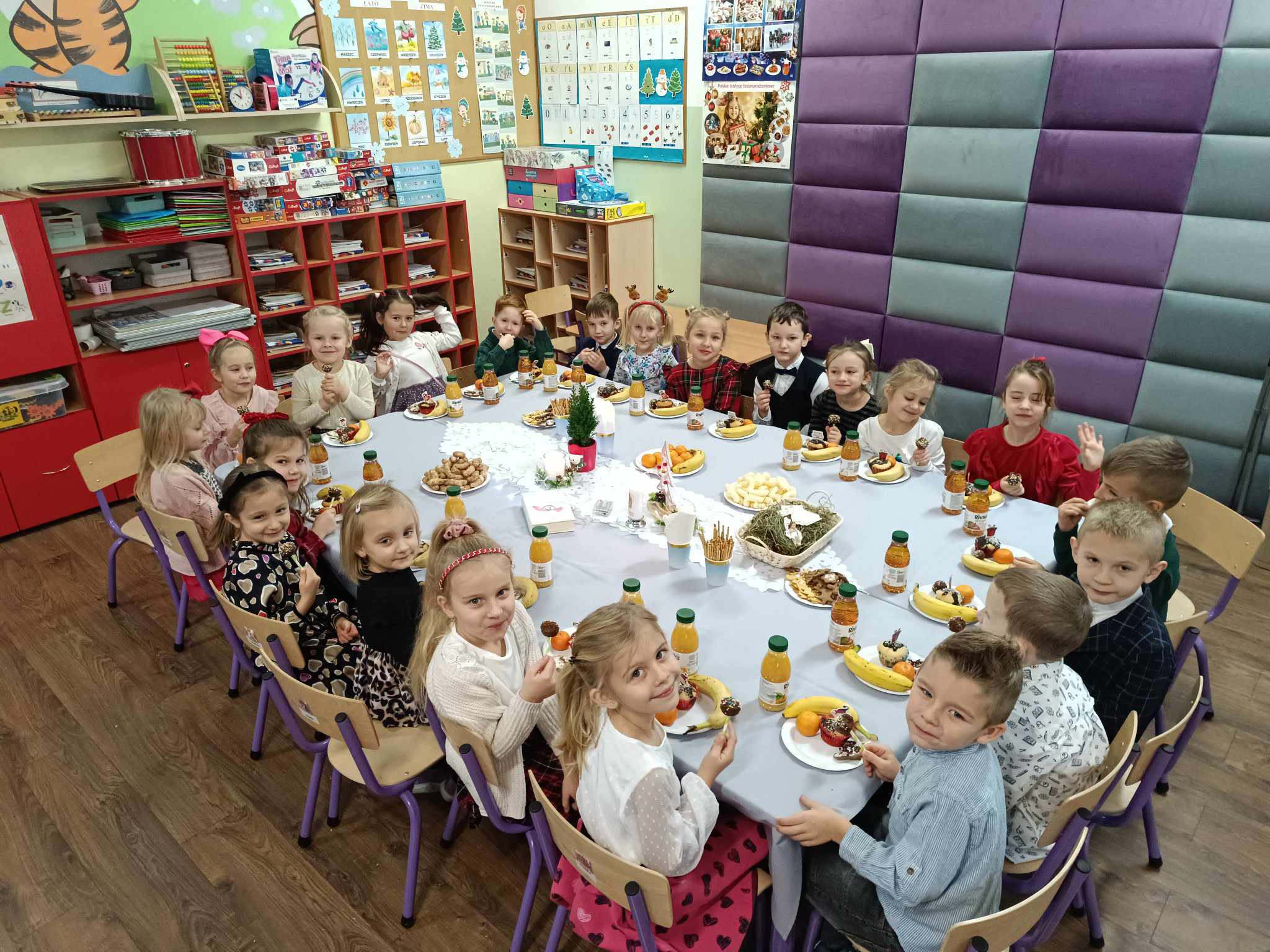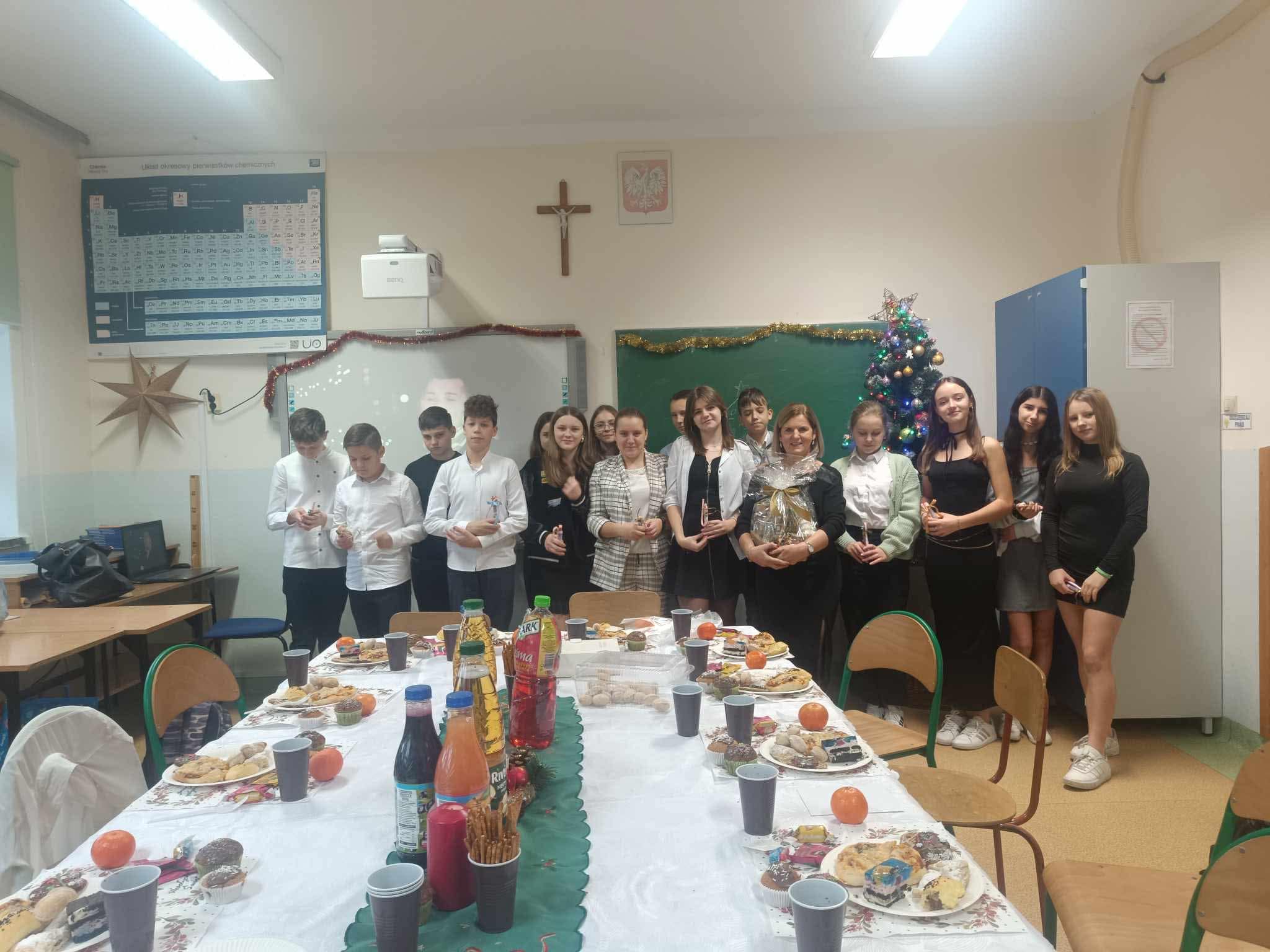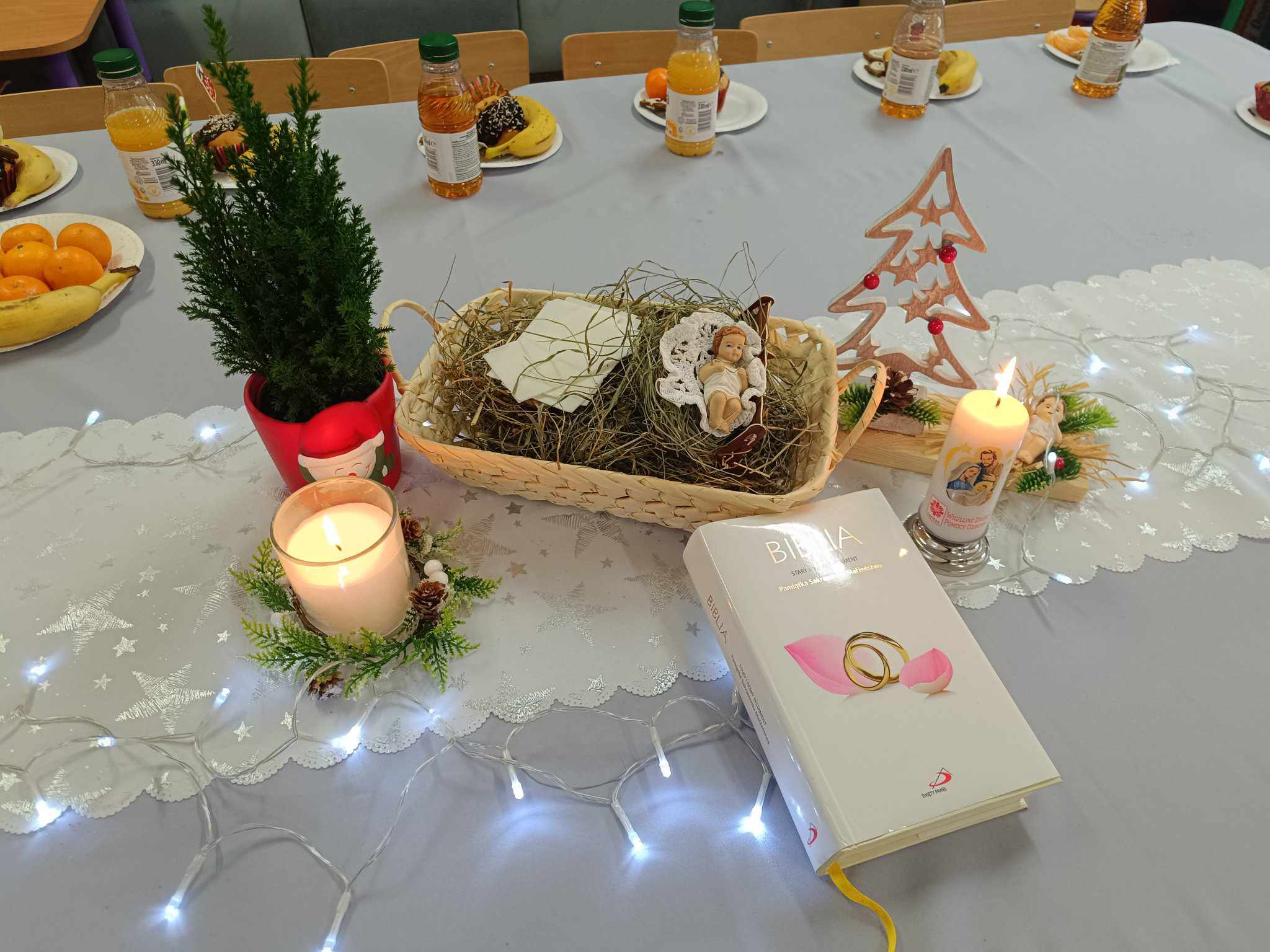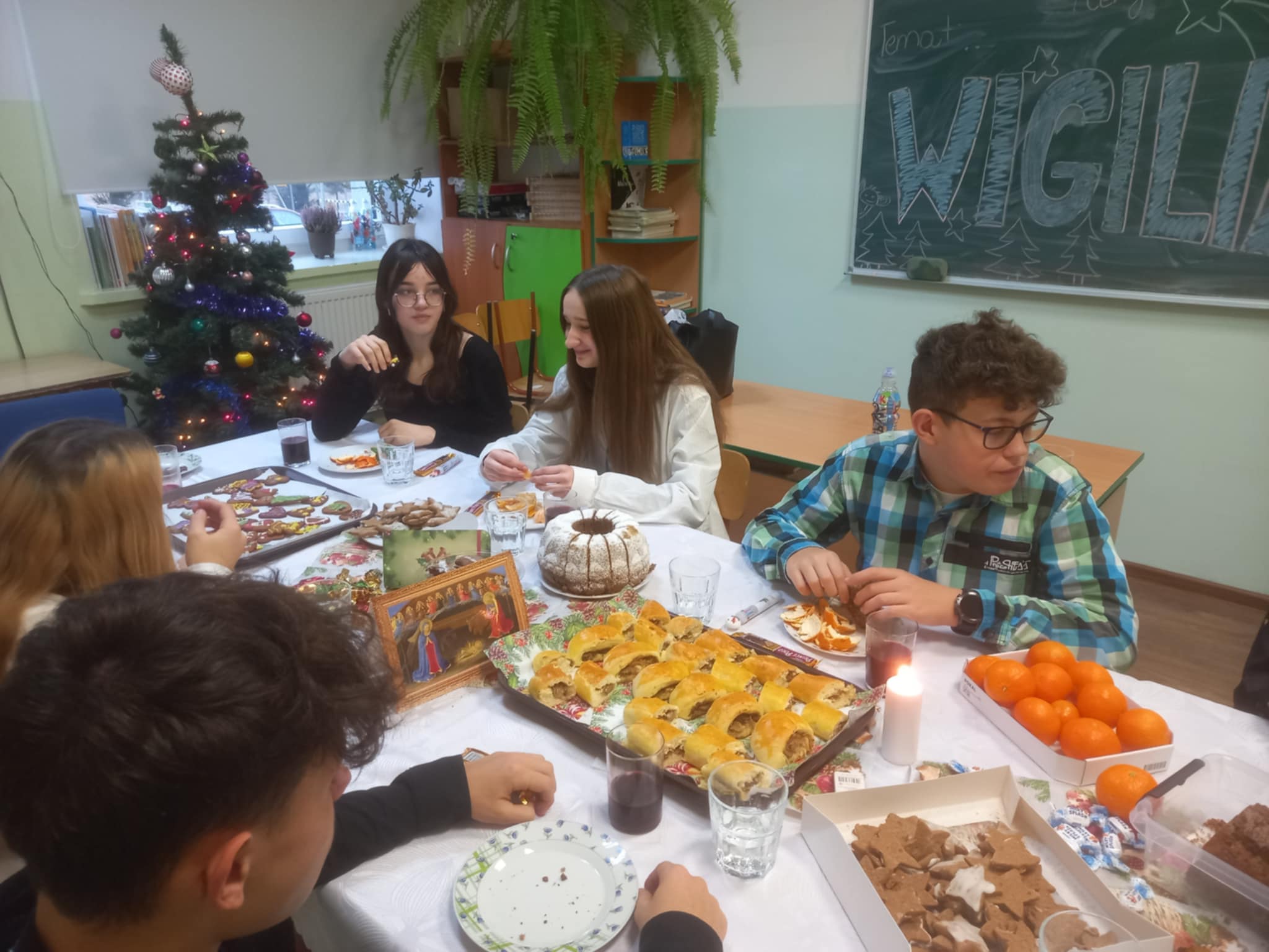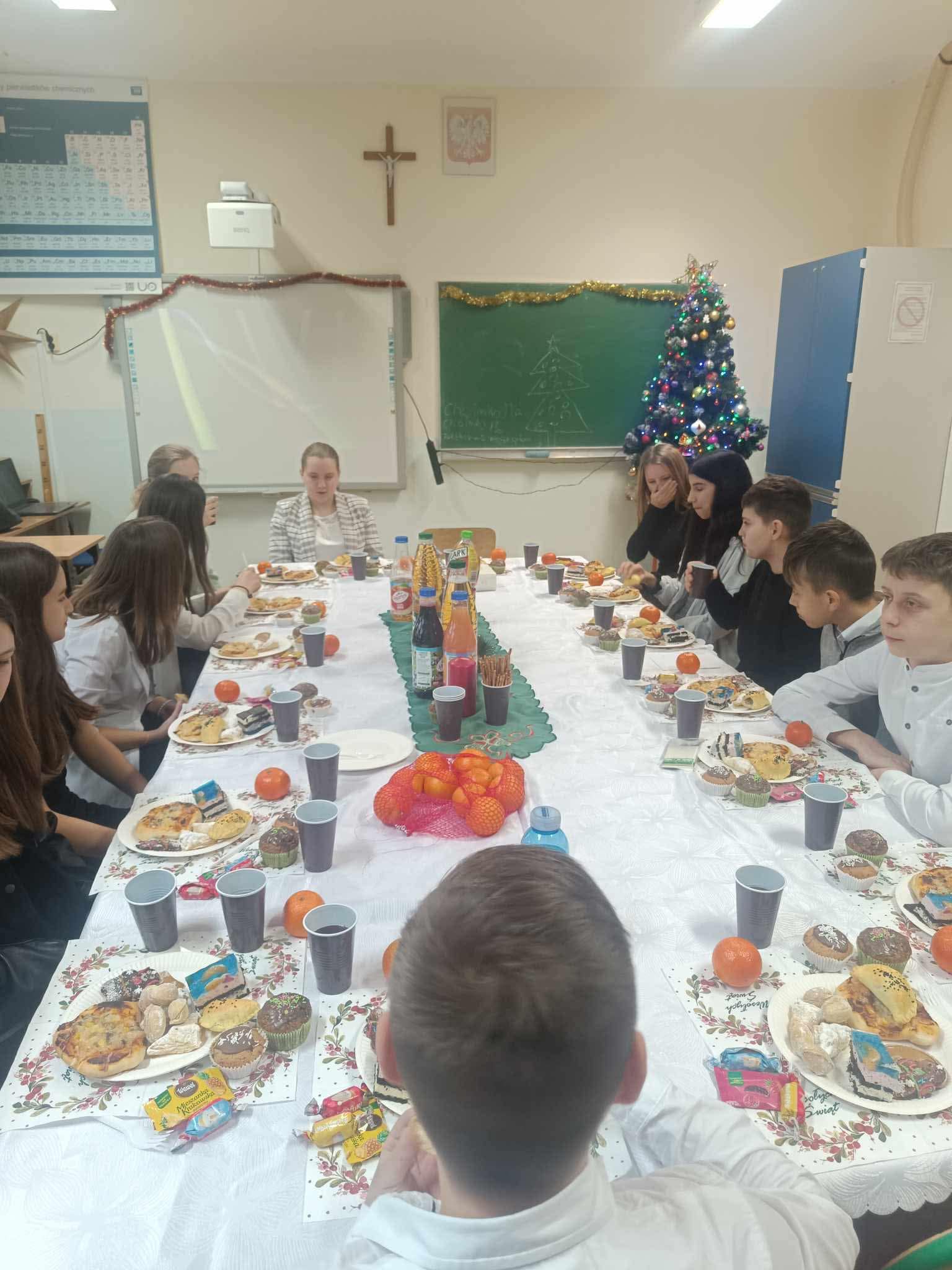 Miniony piątek był w naszej szkole inny niż na co dzień, niezwykły i wyjątkowy. Ponieważ piękne, długo wyczekiwane ŚWIĘTA BOŻEGO NARODZENIA tuż, tuż odbył się uroczysty apel bożonarodzeniowy oraz wigilie klasowe. Wesoły nastrój było czuć już od samego rana. Uczniowie, nauczyciele i rodzice ochoczo przygotowywali sale do spotkań opłatkowych. Zapach pierniczków, pomarańczy oraz choinki poprawiał każdemu nastrój w ten pochmurny dzień. Kiedy już wszystkie klasy zakończyły radosne biesiadowanie rozpoczęły się tradycyjne JASEŁKA. Uczniowie klasy drugiej i trzeciej pod opieką Pani Kingi Stabrawy przedstawiły widowisko słowno- muzyczne „Historia Cudownej Nocy”. Akcja rozgrywała się dwutorowo (współczesność i czasy narodzenia Chrystusa). Sceny związane z domowymi przygotowaniami do wieczerzy wigilijnej miały na celu wprowadzenie świątecznej atmosfery, przypomnienie tradycji i zwyczajów związanych z obchodami Bożego Narodzenia. Pokazywały także wspaniałą relację matki z córką. Występowali: mama i córka, Maryja i Józef, aniołowie, pastuszkowie, królowie i narratorzy. Oczywiście nie zabrakło pięknej dekoracji, świetnie dopracowanych strojów i rekwizytów, a cudnym podsumowaniem wspólnego świętowania był śpiew znanym wszystkim kolęd i pastorałek. Na koniec apelu Pani Dyrektor złożyła wszystkim nauczycielom, pracownikom szkoły i uczniom najserdeczniejsze świąteczne życzenia. Przedstawiciele Samorządu Uczniowskiego również tradycyjnie skierowali słowa życzeń oraz upominki dla pedagogów i pracowników obsługi.