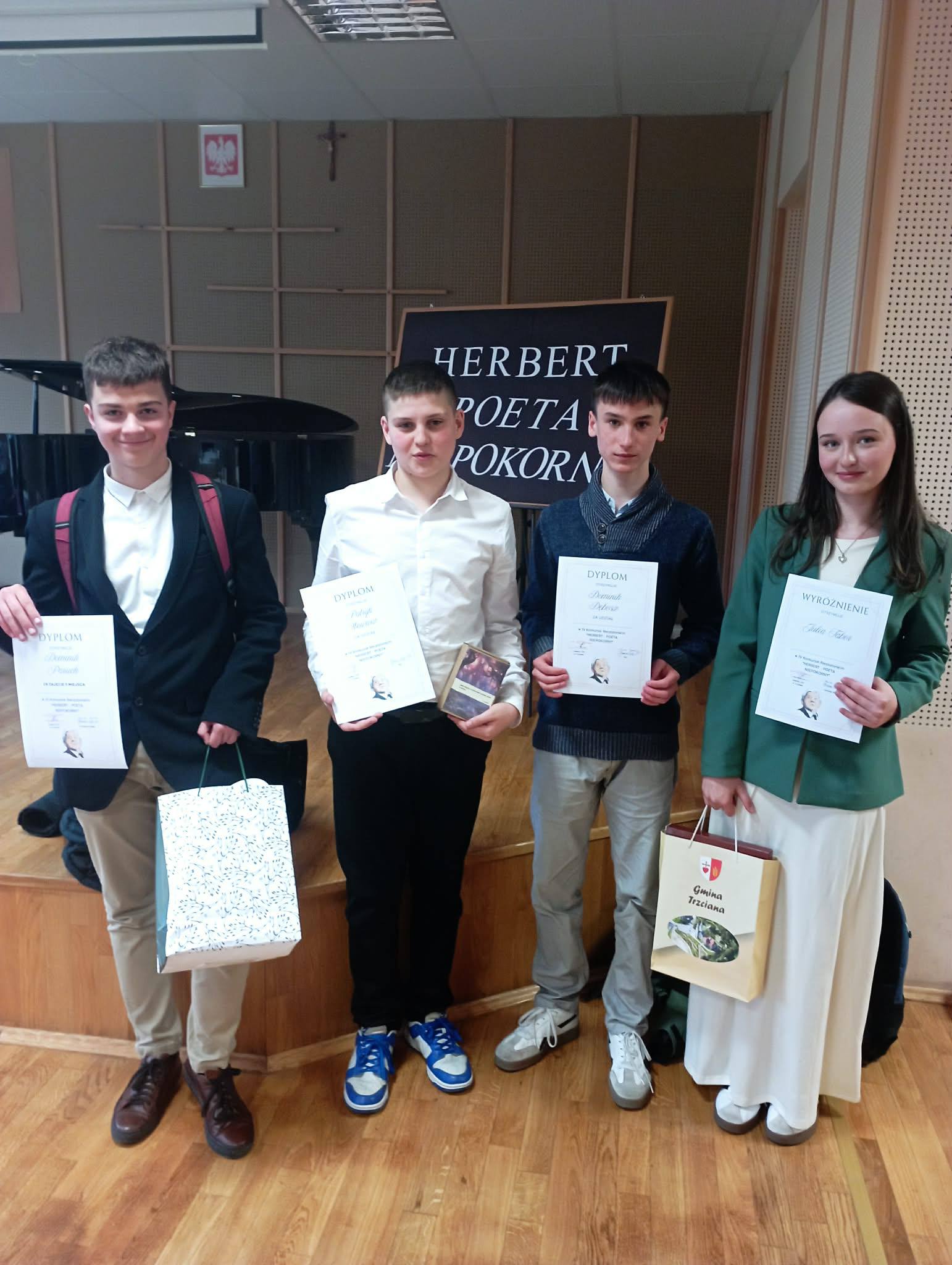 27 marca czworo uczniów z naszej szkoły wzięło udział w Gminnym Konkursie Recytatorskim „Herbert – poeta niepokorny”. Wydarzenie to było poświęcone twórczości Zbigniewa Herberta, jednego z najwybitniejszych polskich poetów, którego utwory skłaniają do refleksji nad wartościami, historią i moralnością.