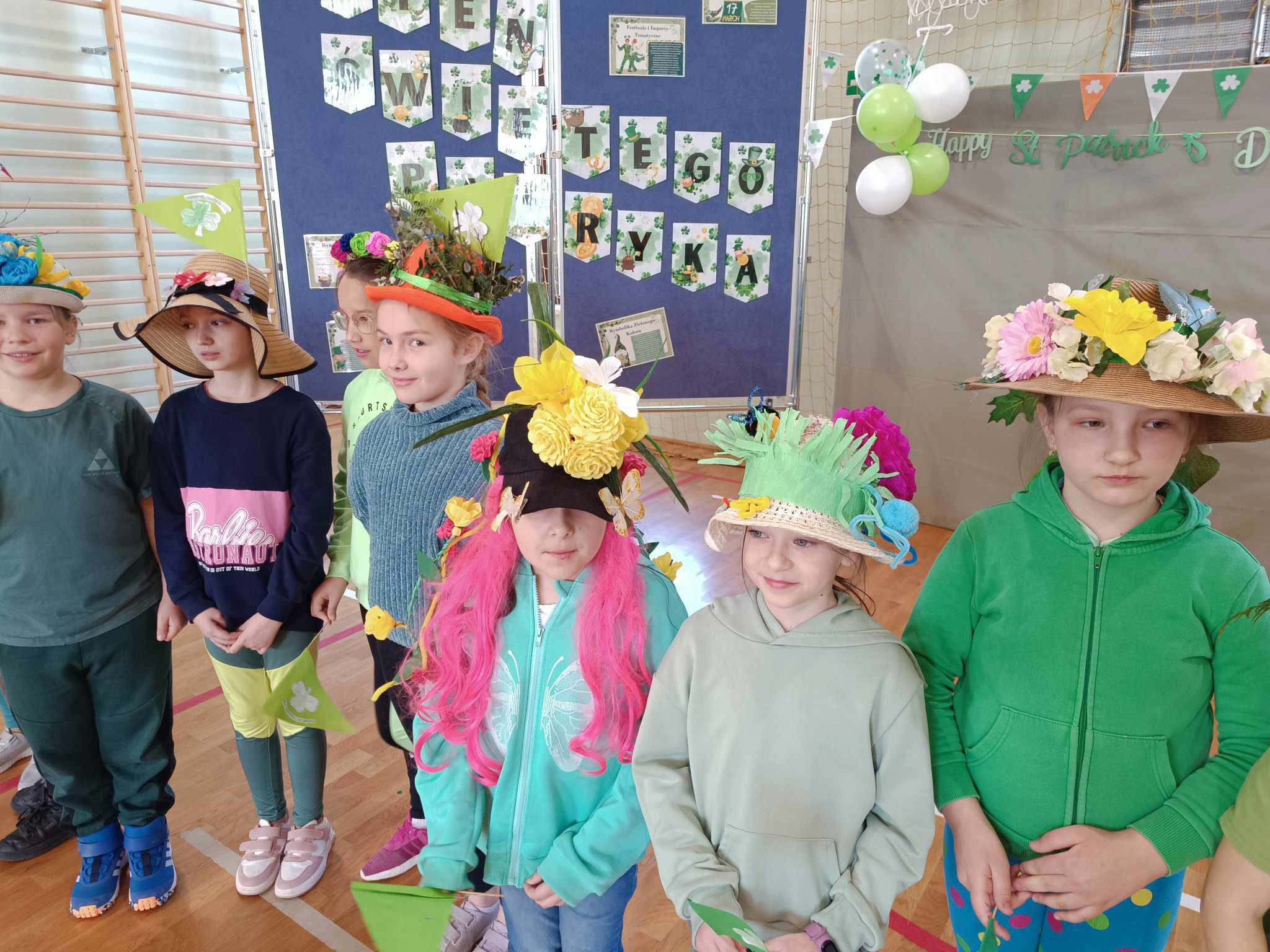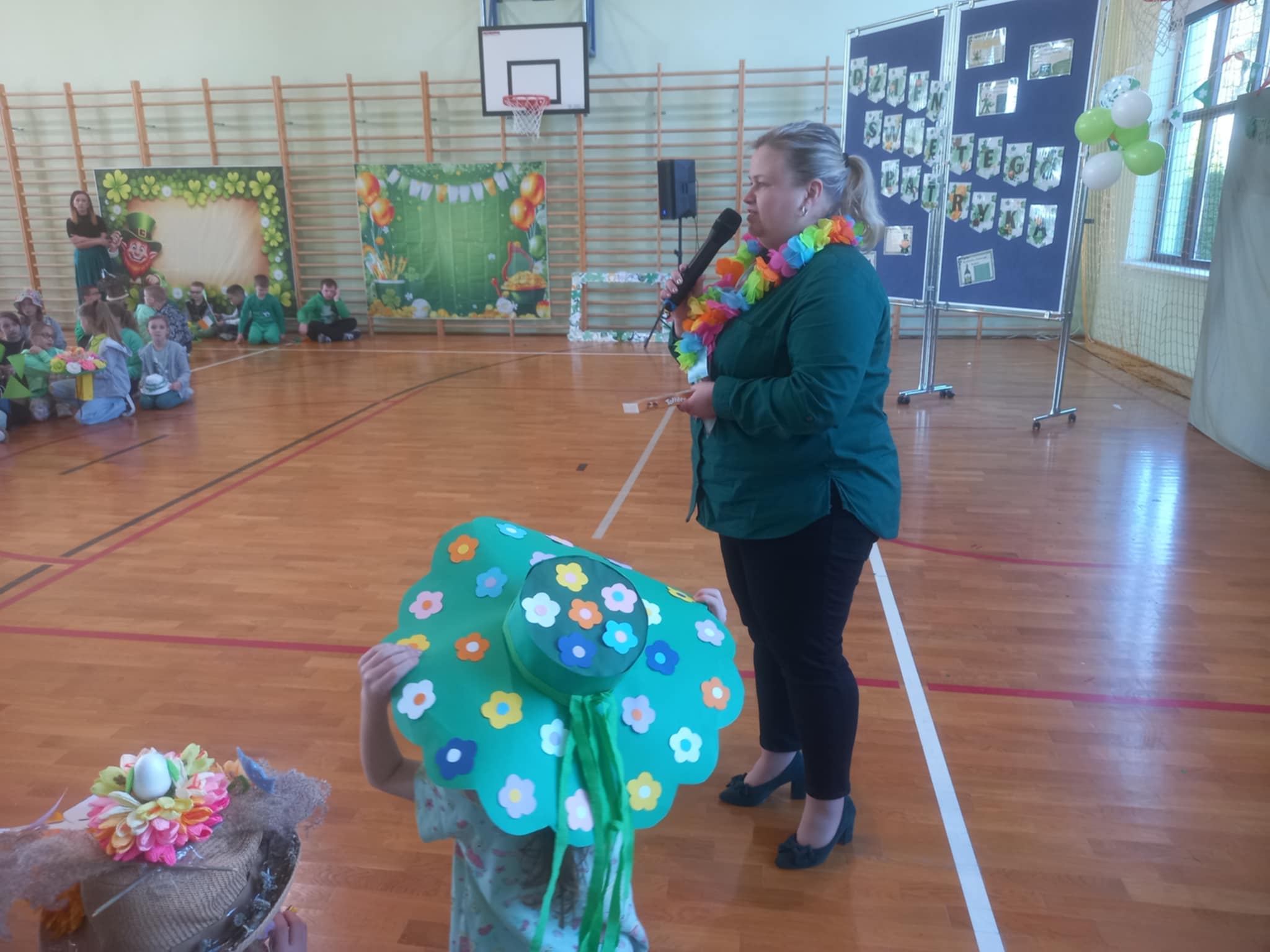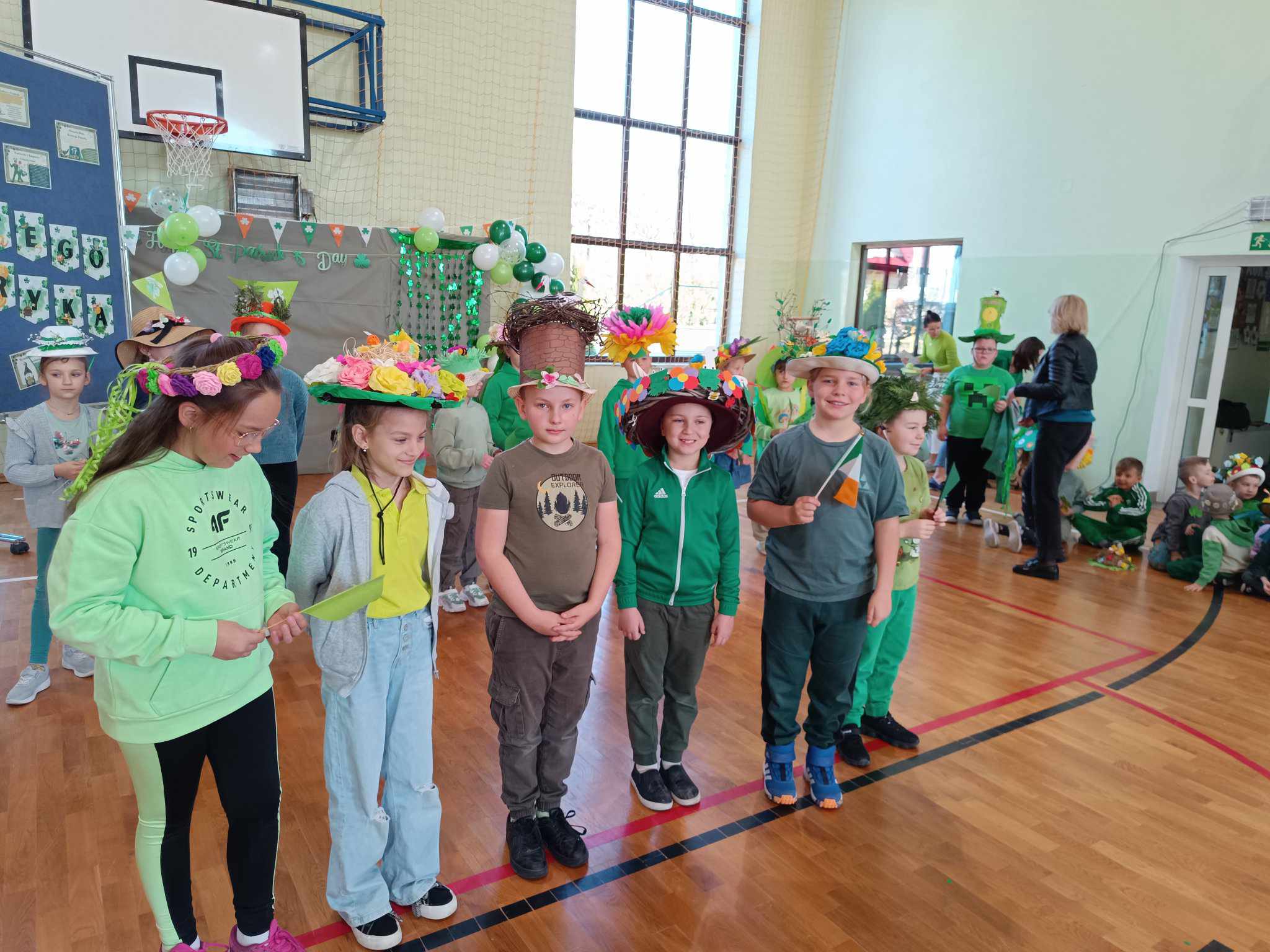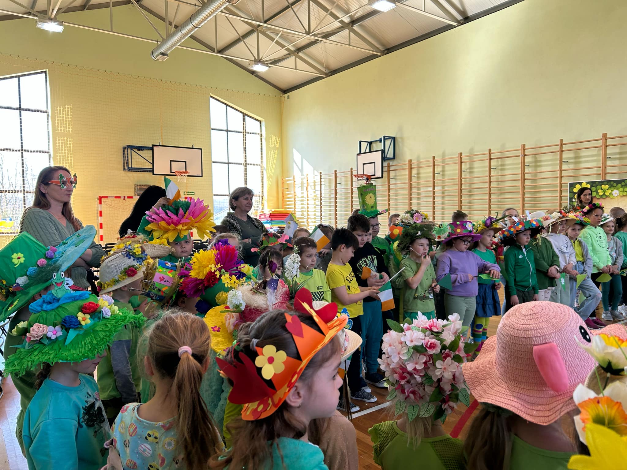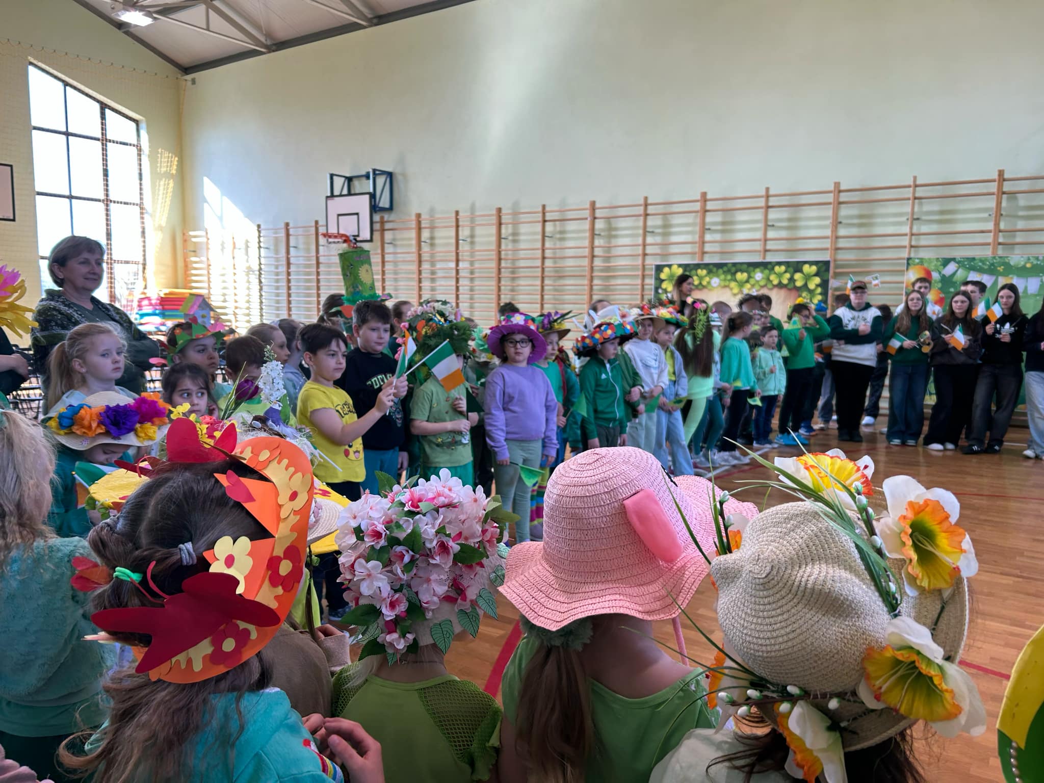 21 marca w naszej szkole obchodziliśmy dwie uroczystości. Pierwszą z nich był Dzień Świętego Patryka a druga to oczywiście PIERWSZY DZIEŃ WIOSNY. Ubrani na zielono, z oryginalnymi nakryciami głowy wszyscy zgromadzili się na sali gimnastycznej. Na początku uczennice klasy V przybliżyły wszystkim postać świętego Patryka, z tej okazji zostały też wykonane okolicznościowe plakaty. Część sali została zastawiona dekoracjami irlandzkimi, na tle których wszyscy chętnie się fotografowali z odpowiednimi gadżetami, rzecz jasna. Został też rozstrzygnięty konkurs ogłoszony przez Samorząd Uczniowski na najbardziej oryginalne nakrycie głowy z akcentem wiosennym. Oj, zaroiło się w naszej szkole od szykownych kapeluszy i czapeczek. Trudny orzech do zgryzienia miały też komisje konkursowe. Odznaczona kwiatowym medalem została odznaczona również nasza Pani Dyrektor, która będzie prowadzić naszą szkołę przez następne kilka lat