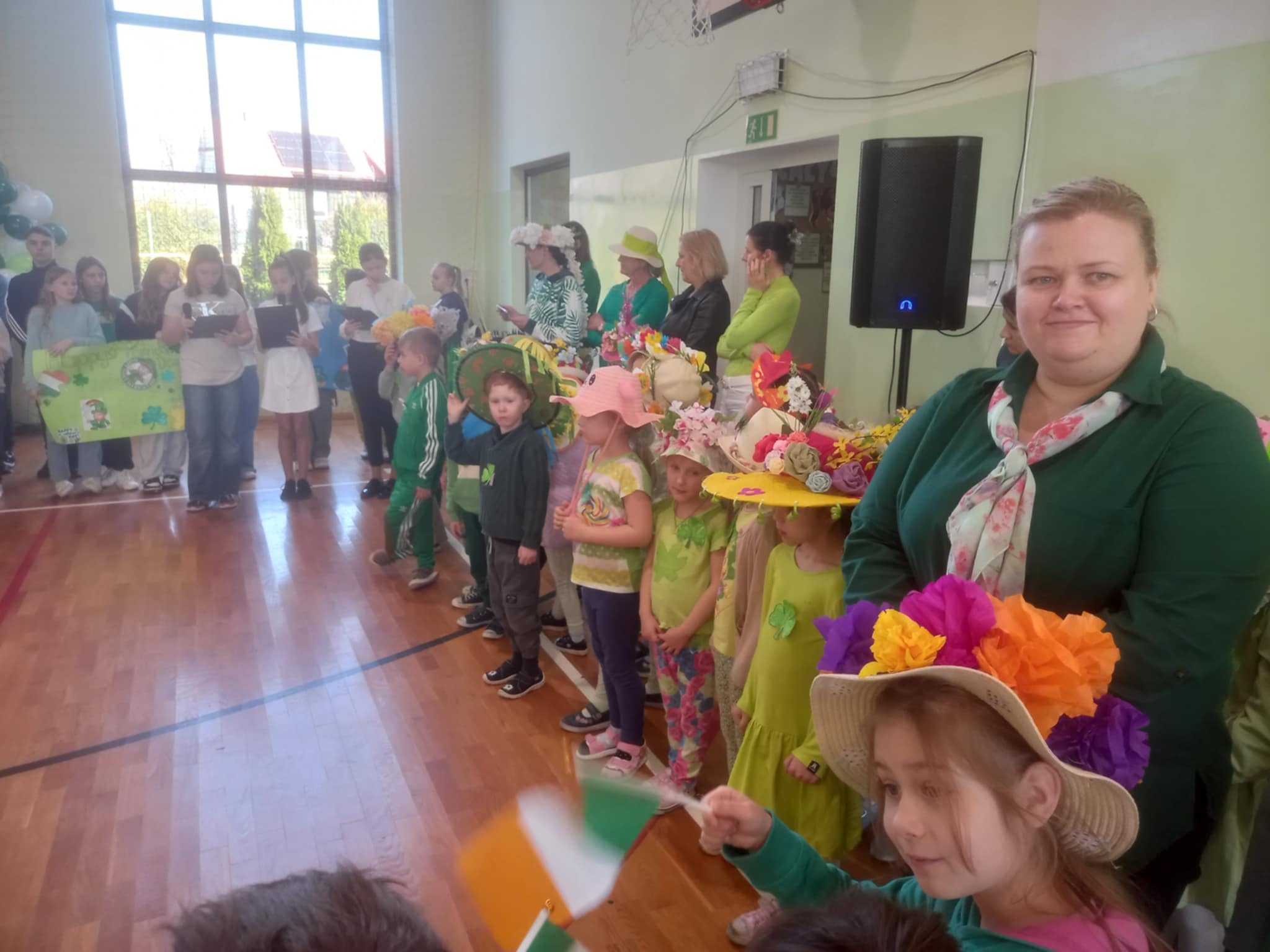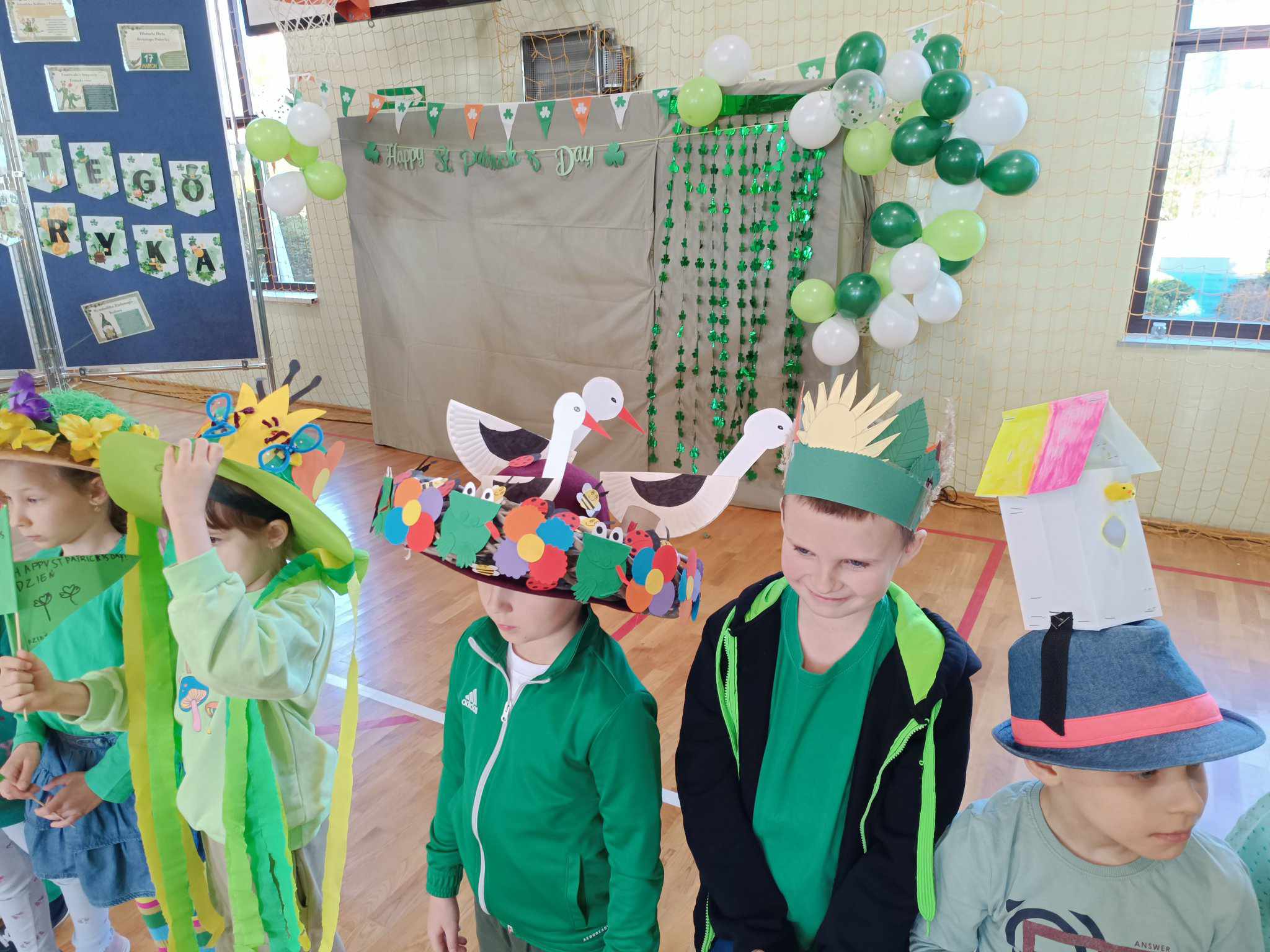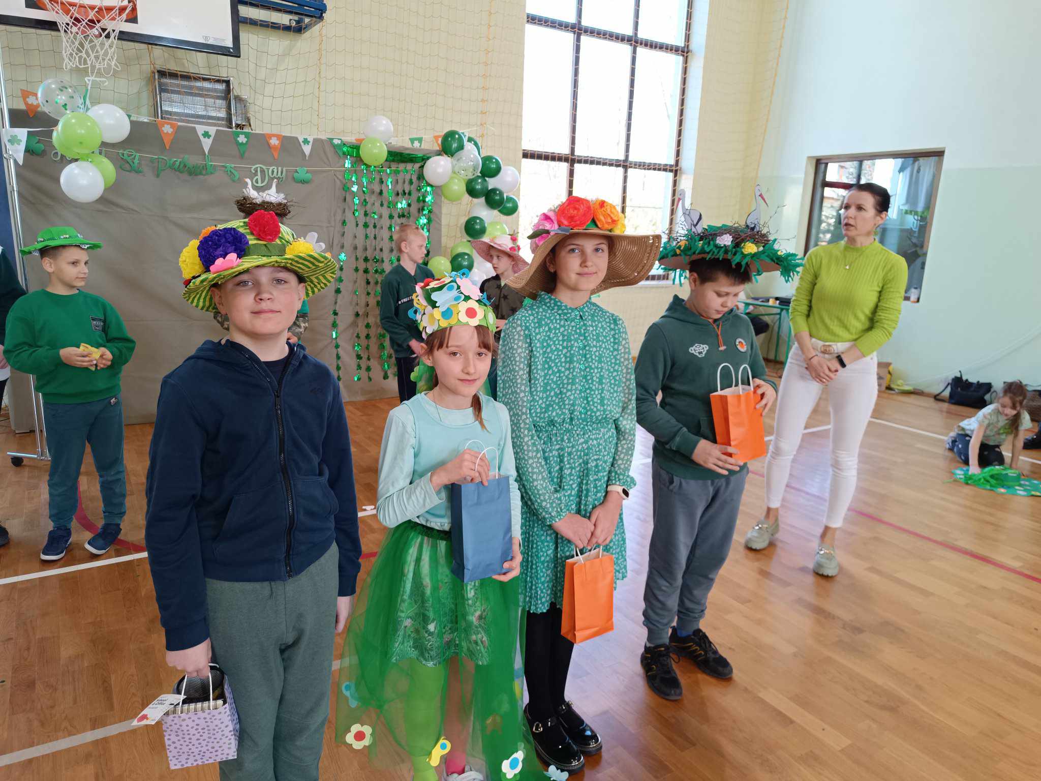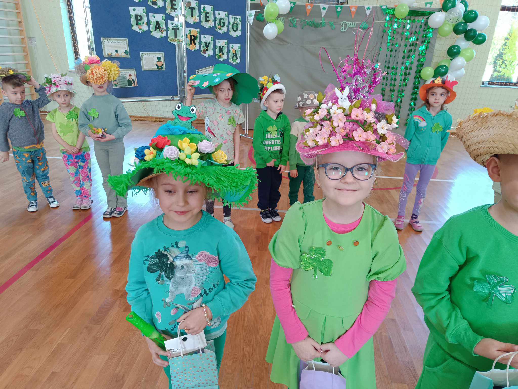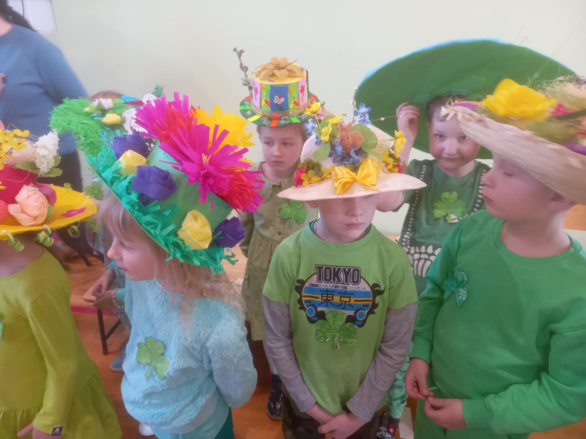 21 marca w naszej szkole obchodziliśmy dwie uroczystości. Pierwszą z nich był Dzień Świętego Patryka a druga to oczywiście PIERWSZY DZIEŃ WIOSNY. Ubrani na zielono, z oryginalnymi nakryciami głowy wszyscy zgromadzili się na sali gimnastycznej. Na początku uczennice klasy V przybliżyły wszystkim postać świętego Patryka, z tej okazji zostały też wykonane okolicznościowe plakaty. Część sali została zastawiona dekoracjami irlandzkimi, na tle których wszyscy chętnie się fotografowali z odpowiednimi gadżetami, rzecz jasna. Został też rozstrzygnięty konkurs ogłoszony przez Samorząd Uczniowski na najbardziej oryginalne nakrycie głowy z akcentem wiosennym. Oj, zaroiło się w naszej szkole od szykownych kapeluszy i czapeczek. Trudny orzech do zgryzienia miały też komisje konkursowe. Odznaczona kwiatowym medalem została odznaczona również nasza Pani Dyrektor, która będzie prowadzić naszą szkołę przez następne kilka lat