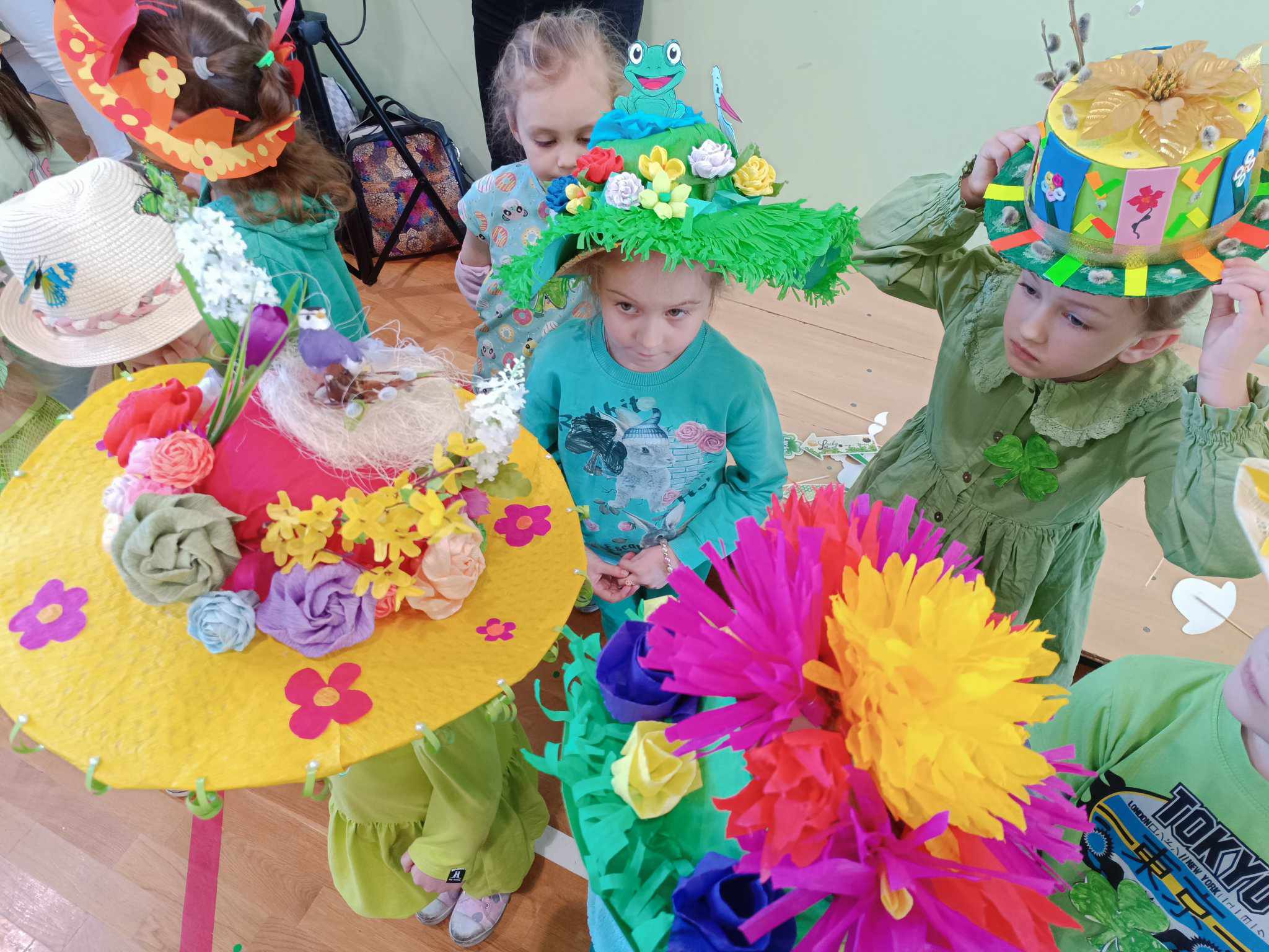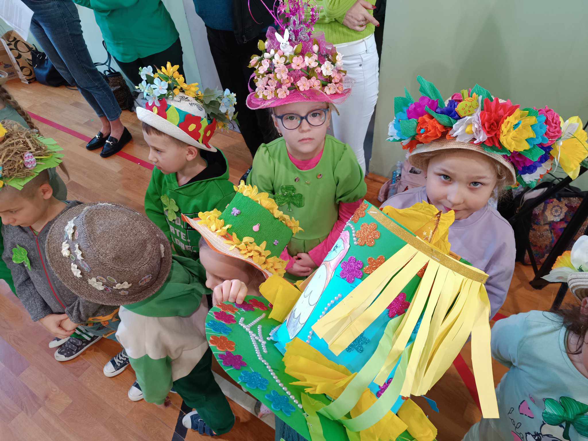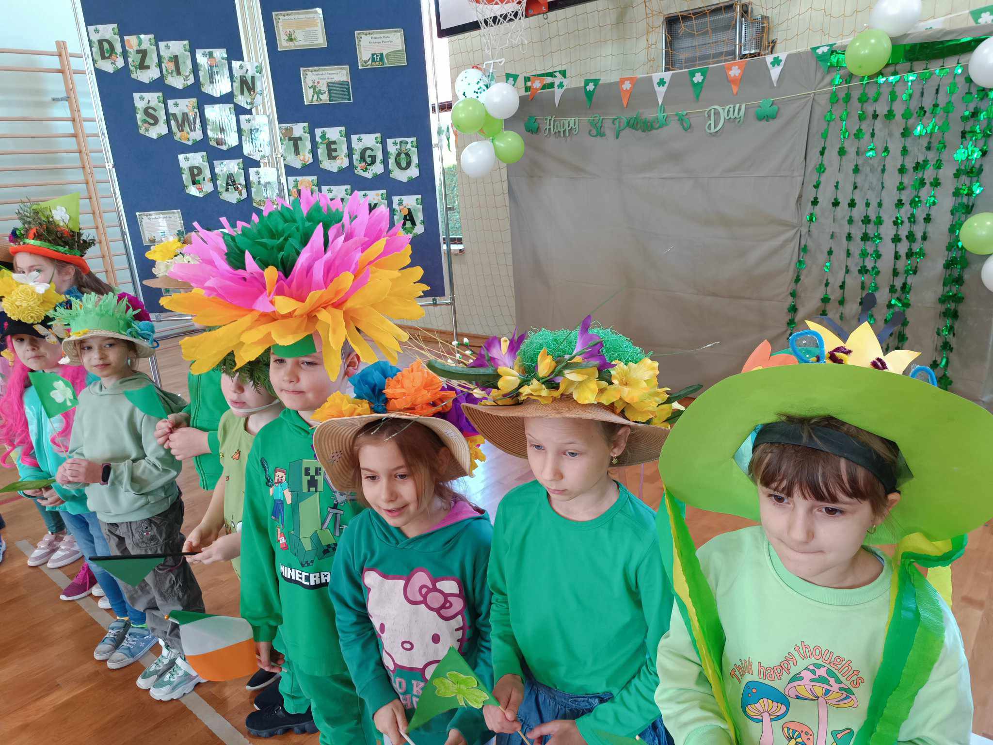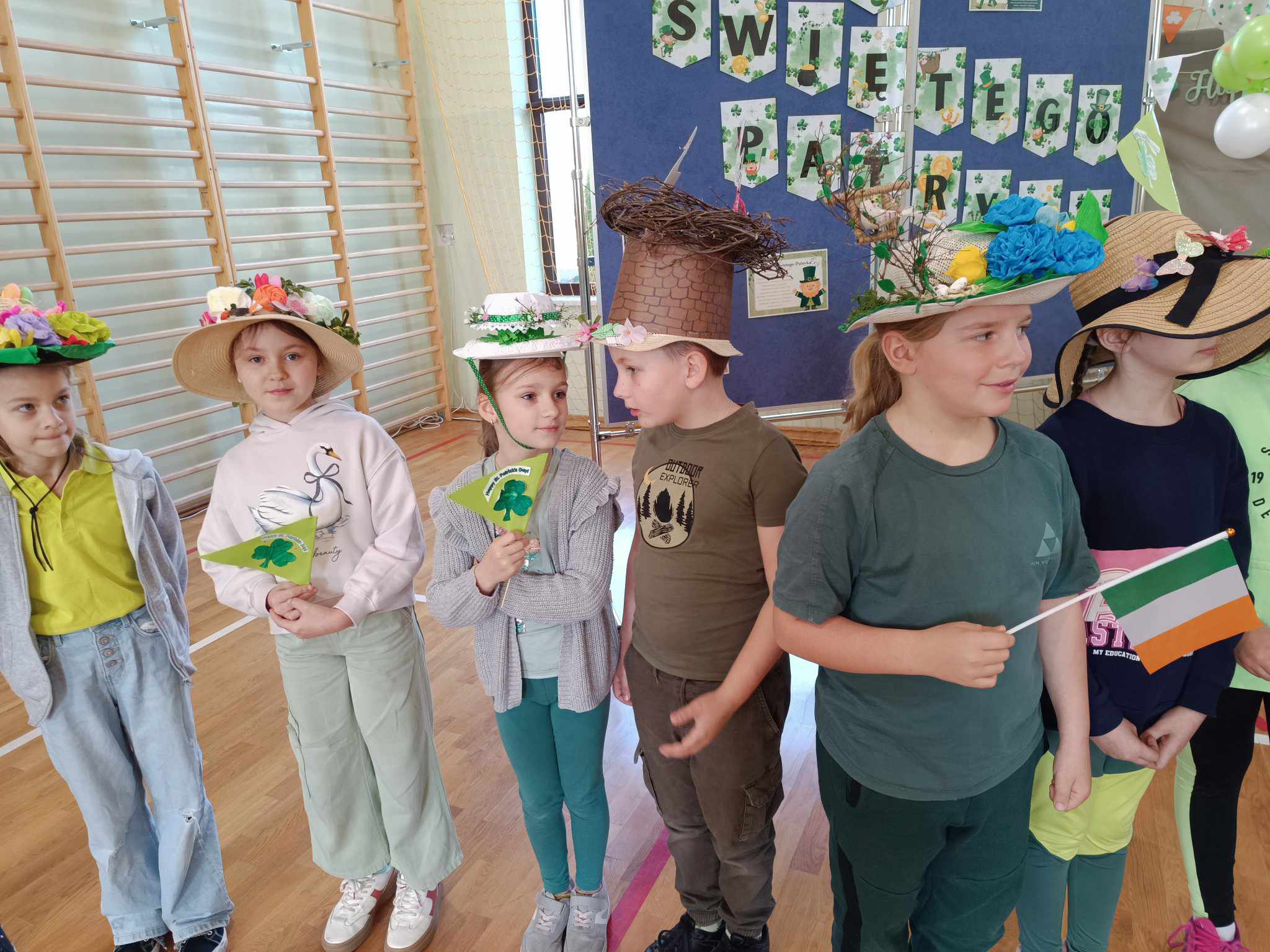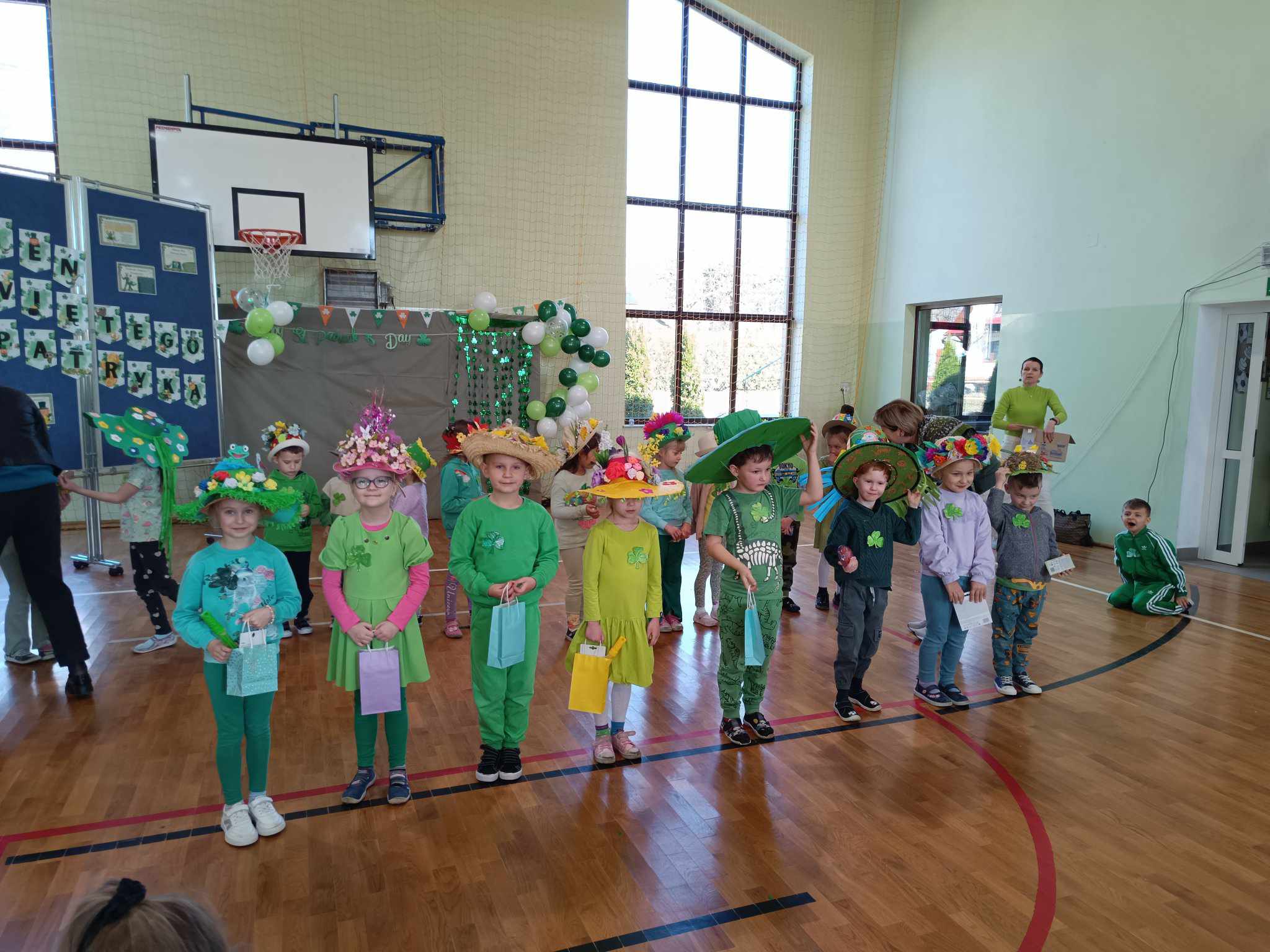 21 marca w naszej szkole obchodziliśmy dwie uroczystości. Pierwszą z nich był Dzień Świętego Patryka a druga to oczywiście PIERWSZY DZIEŃ WIOSNY. Ubrani na zielono, z oryginalnymi nakryciami głowy wszyscy zgromadzili się na sali gimnastycznej. Na początku uczennice klasy V przybliżyły wszystkim postać świętego Patryka, z tej okazji zostały też wykonane okolicznościowe plakaty. Część sali została zastawiona dekoracjami irlandzkimi, na tle których wszyscy chętnie się fotografowali z odpowiednimi gadżetami, rzecz jasna. Został też rozstrzygnięty konkurs ogłoszony przez Samorząd Uczniowski na najbardziej oryginalne nakrycie głowy z akcentem wiosennym. Oj, zaroiło się w naszej szkole od szykownych kapeluszy i czapeczek. Trudny orzech do zgryzienia miały też komisje konkursowe. Odznaczona kwiatowym medalem została odznaczona również nasza Pani Dyrektor, która będzie prowadzić naszą szkołę przez następne kilka lat