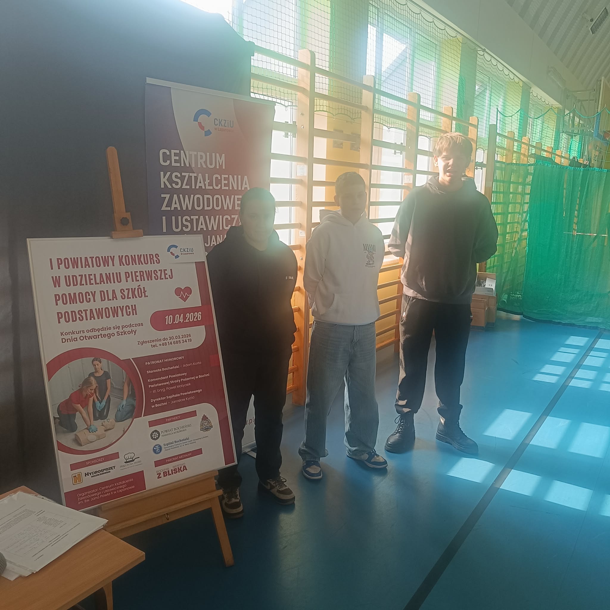 W dniu dzisiejszym 10.04.2026 podczas dni otwartych w CKZi U w Łapanowie uczniowie naszej szkoły z kl VIII Alicja Marzec, Szymon Burkowicz, Patryk Stawarz brali udział w I Powiatowym Konkursie Udzielania I Pomocy. Wykazali się znakomitą wiedzą teoretyczną i praktyczną zajmując III miejsce- wielkie brawa dla uczestników .