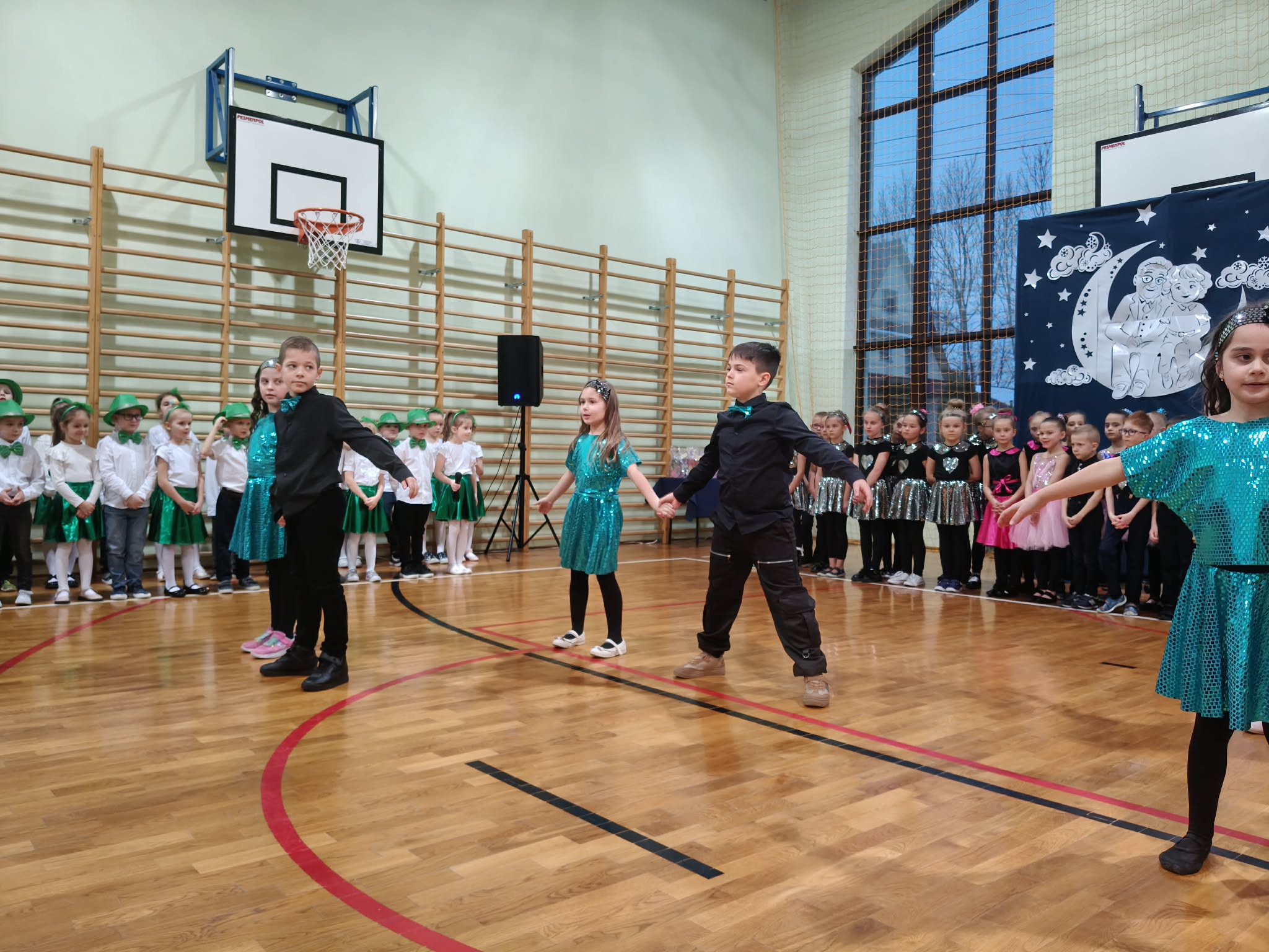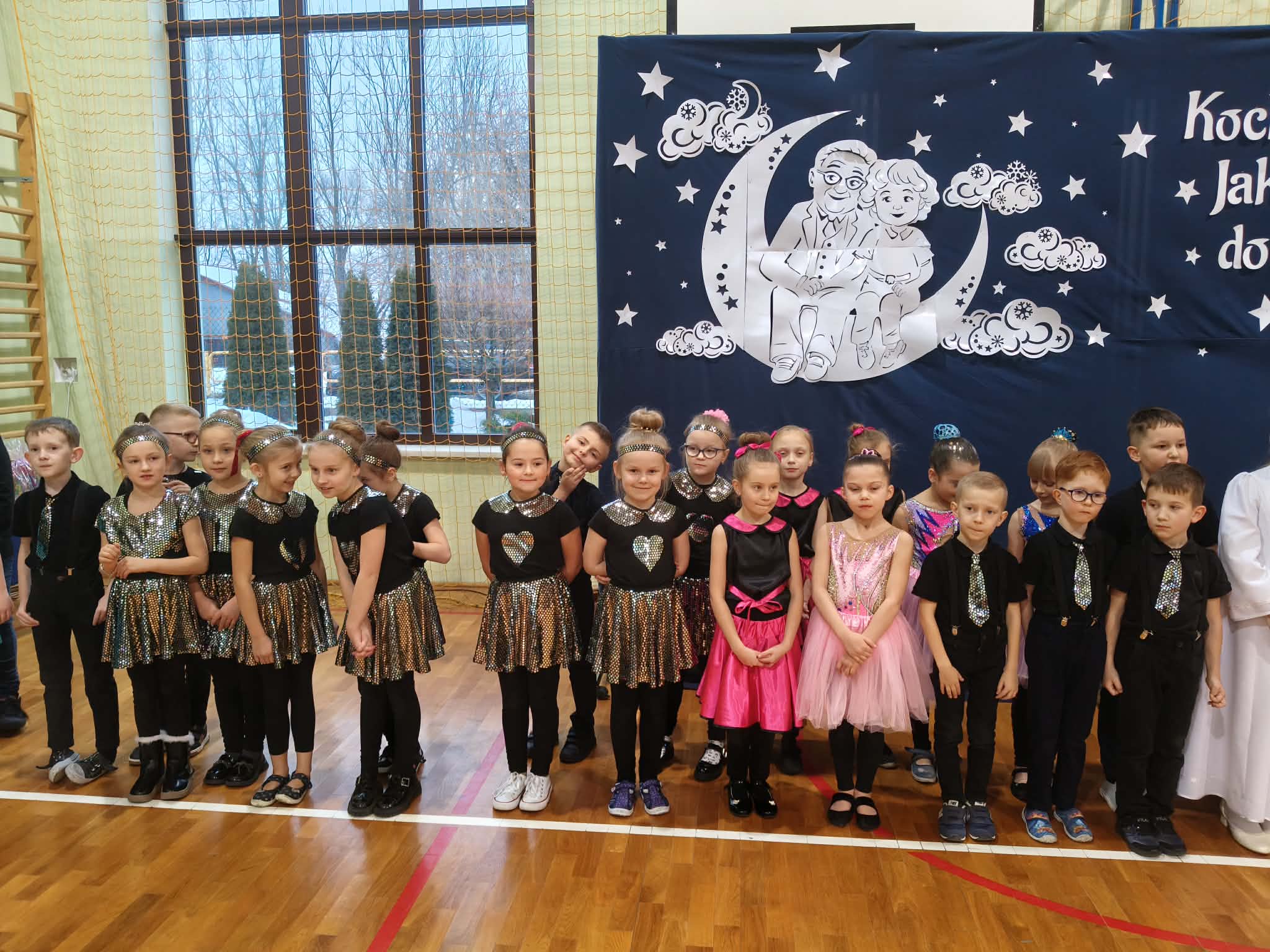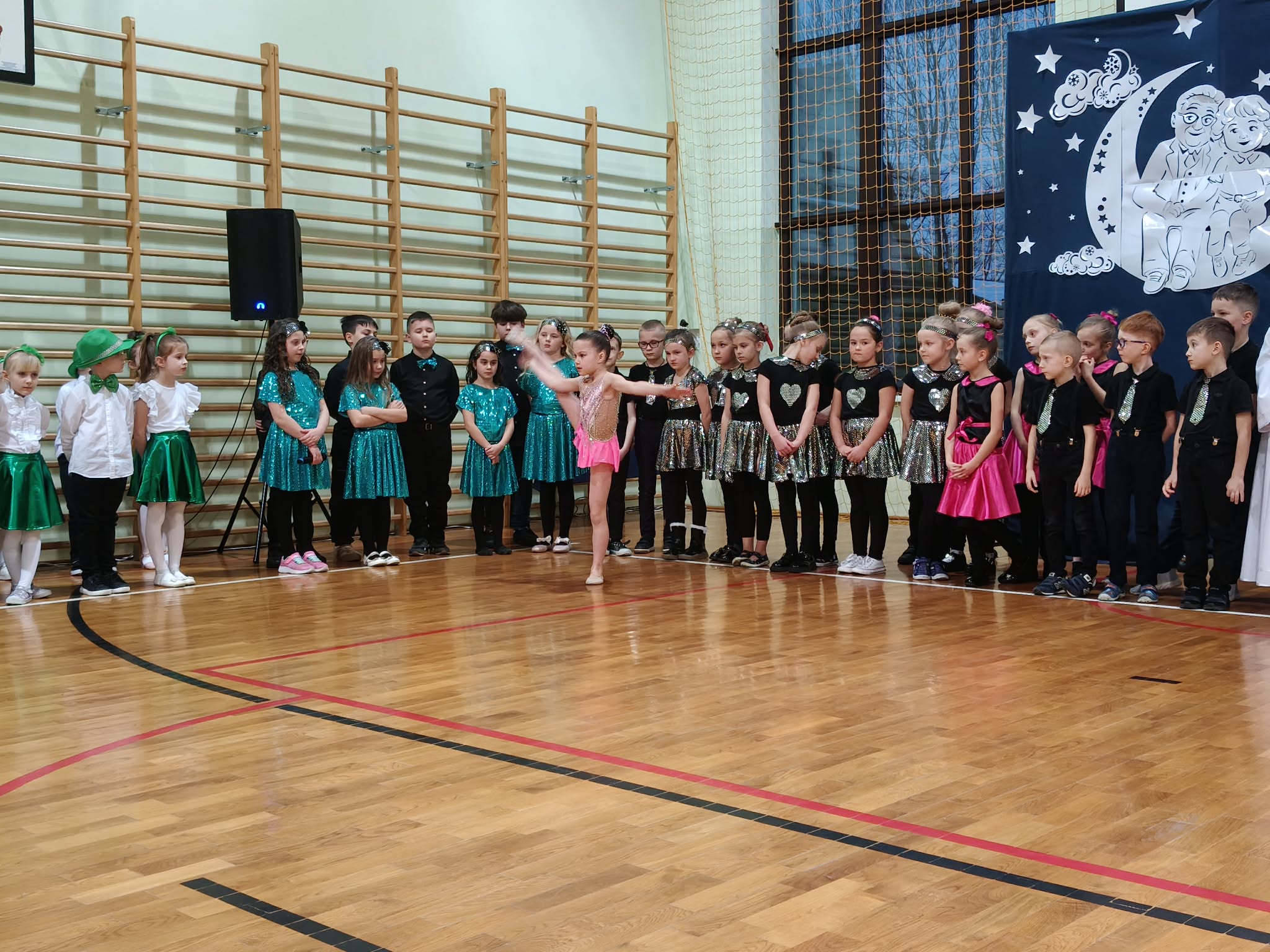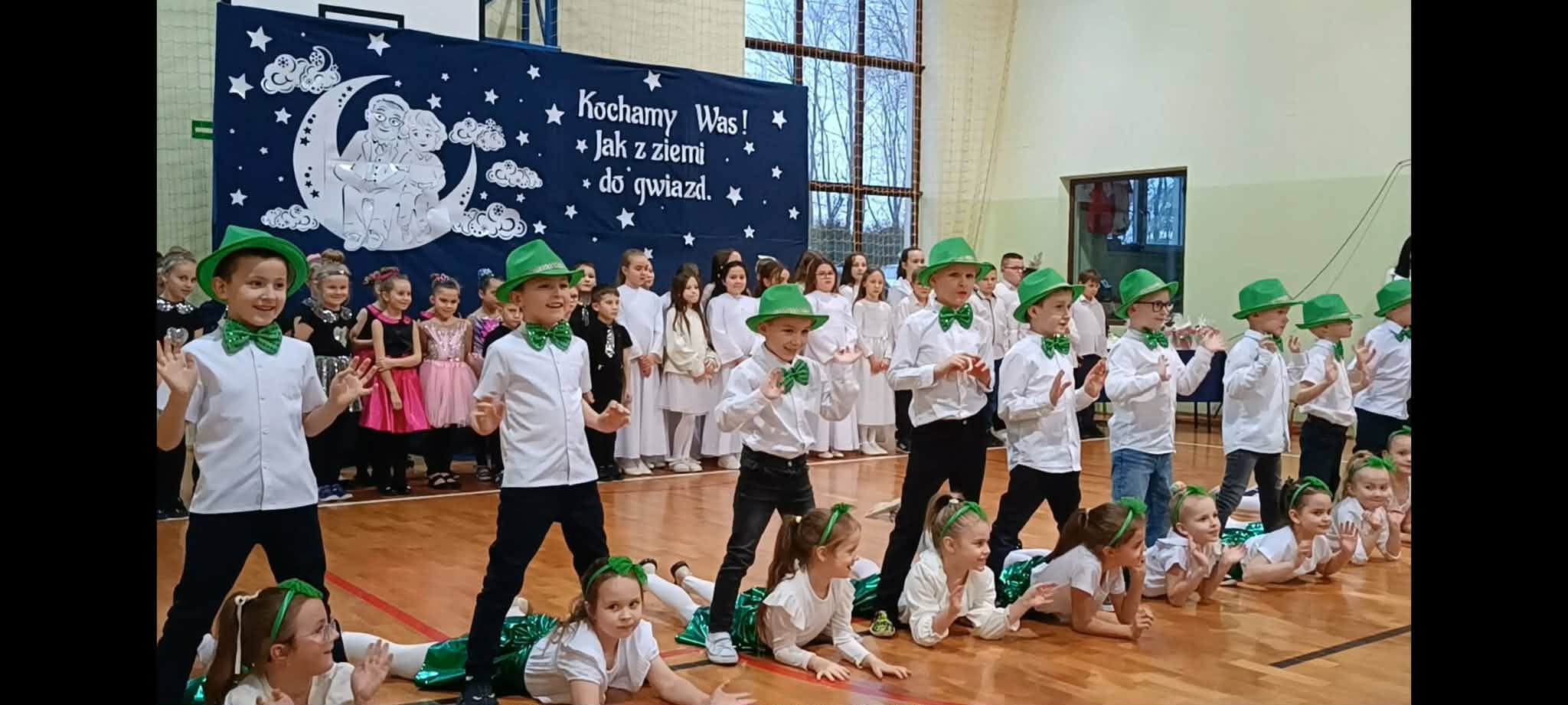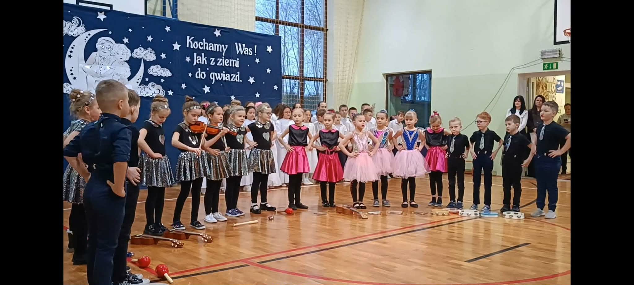 Następnie uczniowie klas 0-III przedstawili program artystyczny, który przygotowali pod opieką swoich wychowawców. Oczywiście musiało być wesoło, skocznie, bardzo rytmicznie i kolorowo. Na scenie pojawili się „profesjonalni” tancerze prezentujący skocznego jivea i rocka, radosna orkiestra z wieloma instrumentami, wierszyki, sentencje, wiele pięknych słów. Nie zabrakło kolorowych strojów i gadżetów. W tym roku przewagę wśród garderoby zdobyły karnawałowe błyskotki i cekiny. Z głośników zabrzmiały porywające do tańca przeboje oraz wzruszające piosenki wyrażające miłość i wdzięczność wnucząt. Pozostając w klimacie bożonarodzeniowym klasa III zatańczyła taniec „Noel”. Utalentowane uczennice klasy I wykonały zachwycający pokaz gimnastyki artystycznej. Był też czas na serdeczne, płynące prosto z serc życzenia i gromkie STO LAT! Występy dzieci zachwyciły publiczność, a każdy artystyczny akcent nagradzano gromkimi brawami.