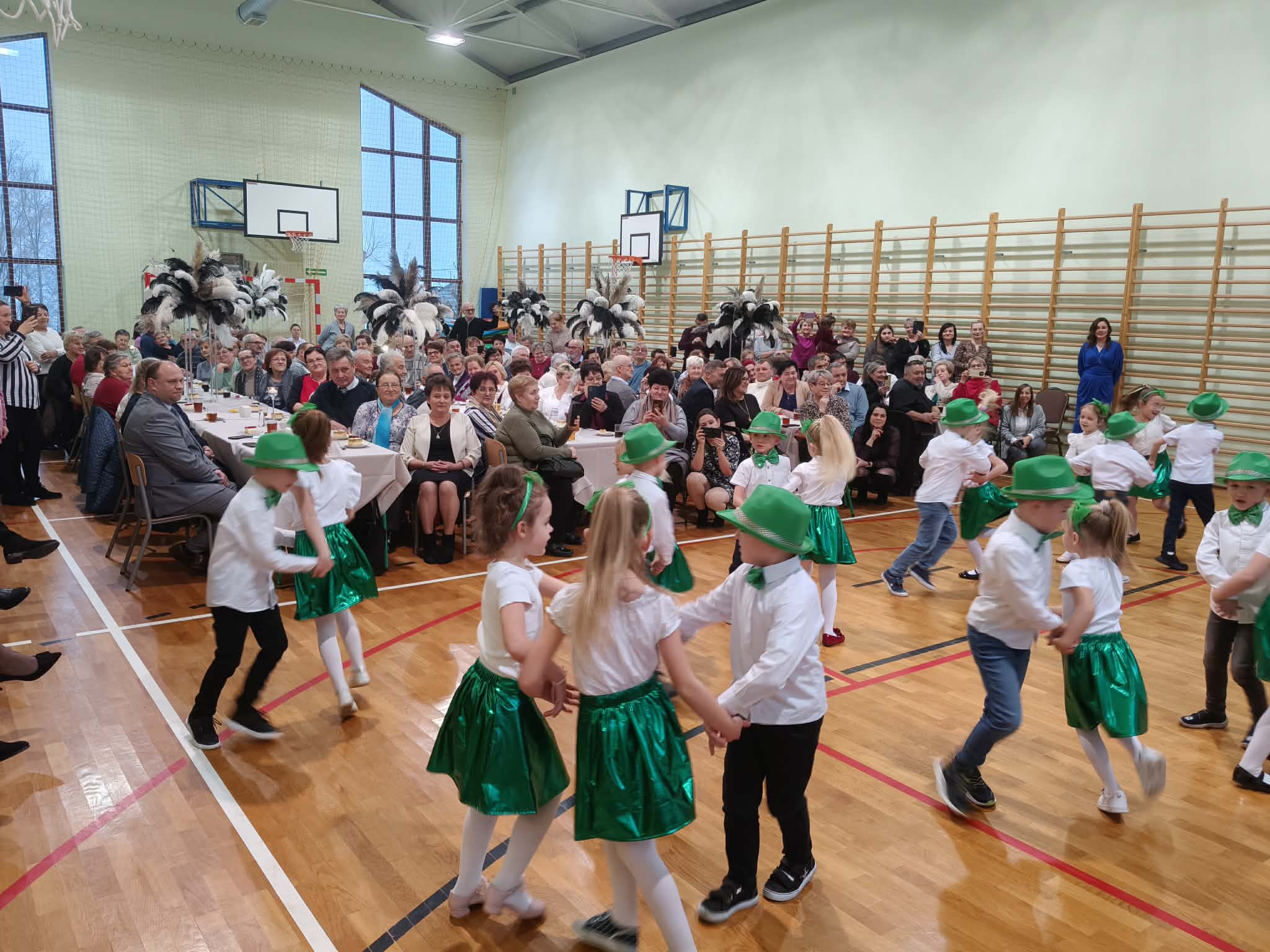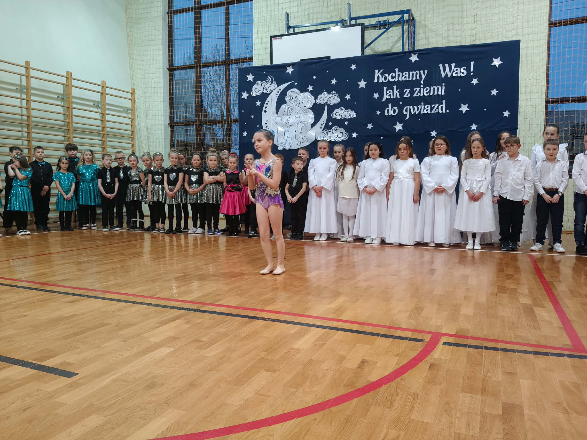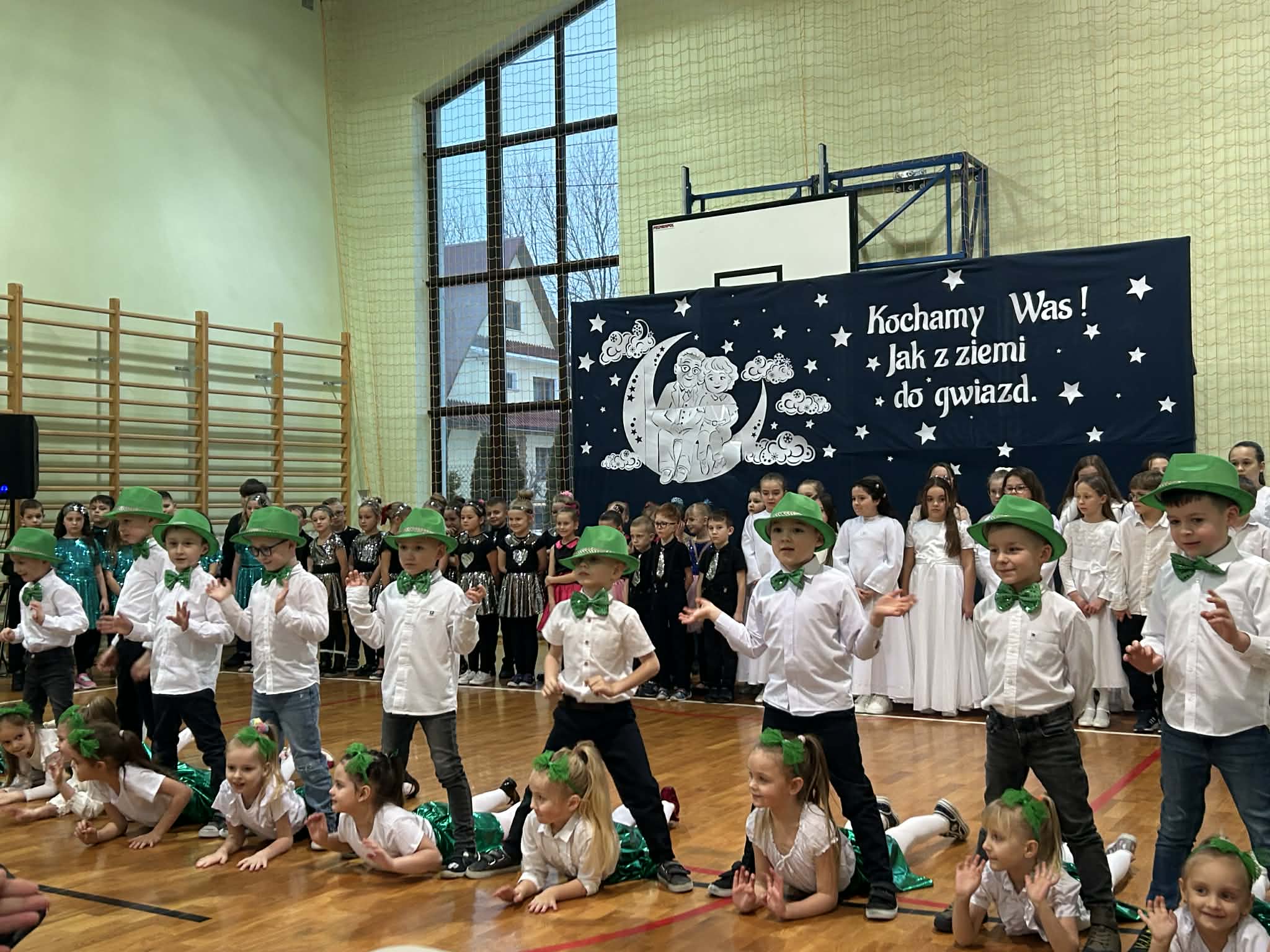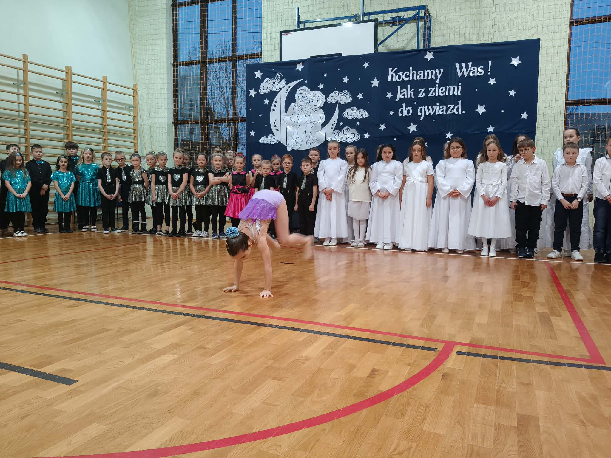 Następnie uczniowie klas 0-III przedstawili program artystyczny, który przygotowali pod opieką swoich wychowawców. Oczywiście musiało być wesoło, skocznie, bardzo rytmicznie i kolorowo. Na scenie pojawili się „profesjonalni” tancerze prezentujący skocznego jivea i rocka, radosna orkiestra z wieloma instrumentami, wierszyki, sentencje, wiele pięknych słów. Nie zabrakło kolorowych strojów i gadżetów. W tym roku przewagę wśród garderoby zdobyły karnawałowe błyskotki i cekiny. Z głośników zabrzmiały porywające do tańca przeboje oraz wzruszające piosenki wyrażające miłość i wdzięczność wnucząt. Pozostając w klimacie bożonarodzeniowym klasa III zatańczyła taniec „Noel”. Utalentowane uczennice klasy I wykonały zachwycający pokaz gimnastyki artystycznej. Był też czas na serdeczne, płynące prosto z serc życzenia i gromkie STO LAT! Występy dzieci zachwyciły publiczność, a każdy artystyczny akcent nagradzano gromkimi brawami.