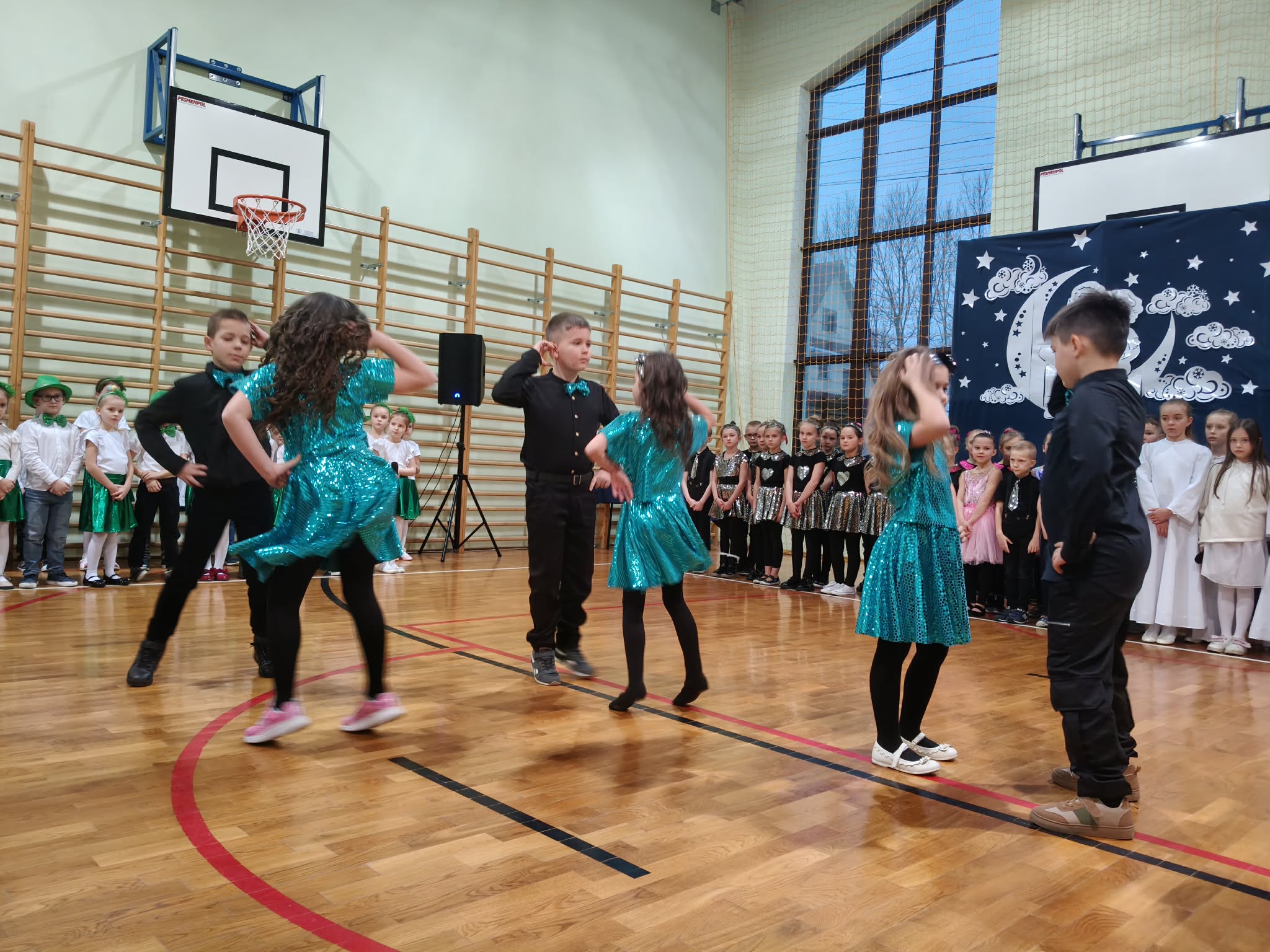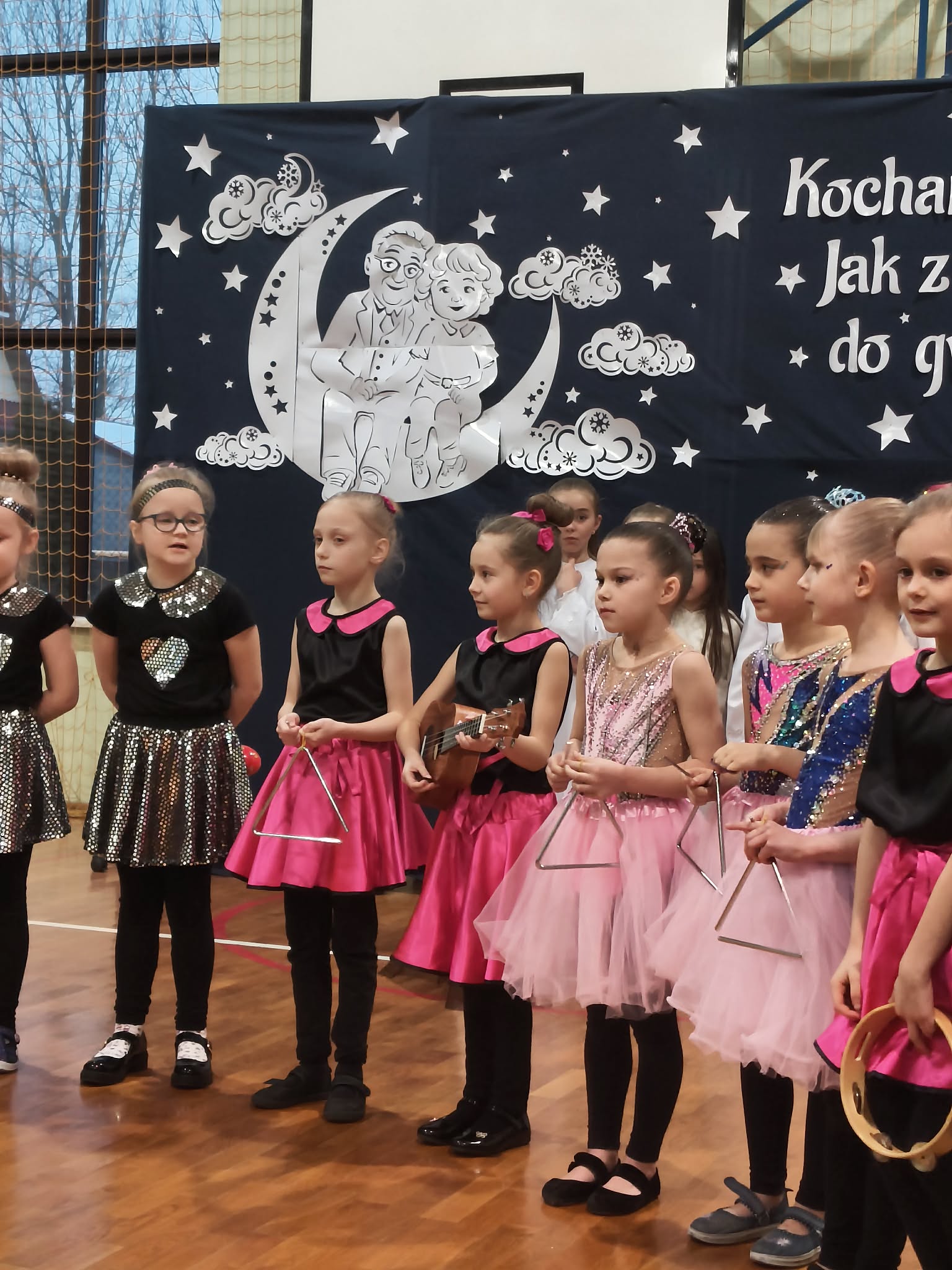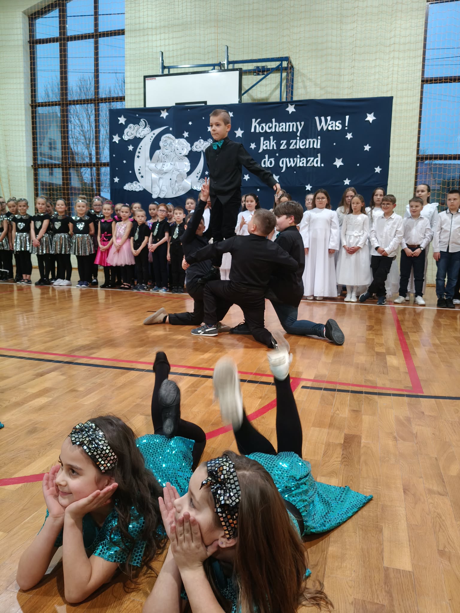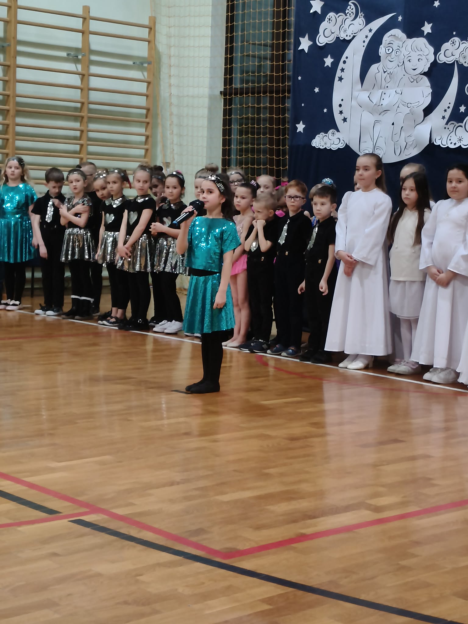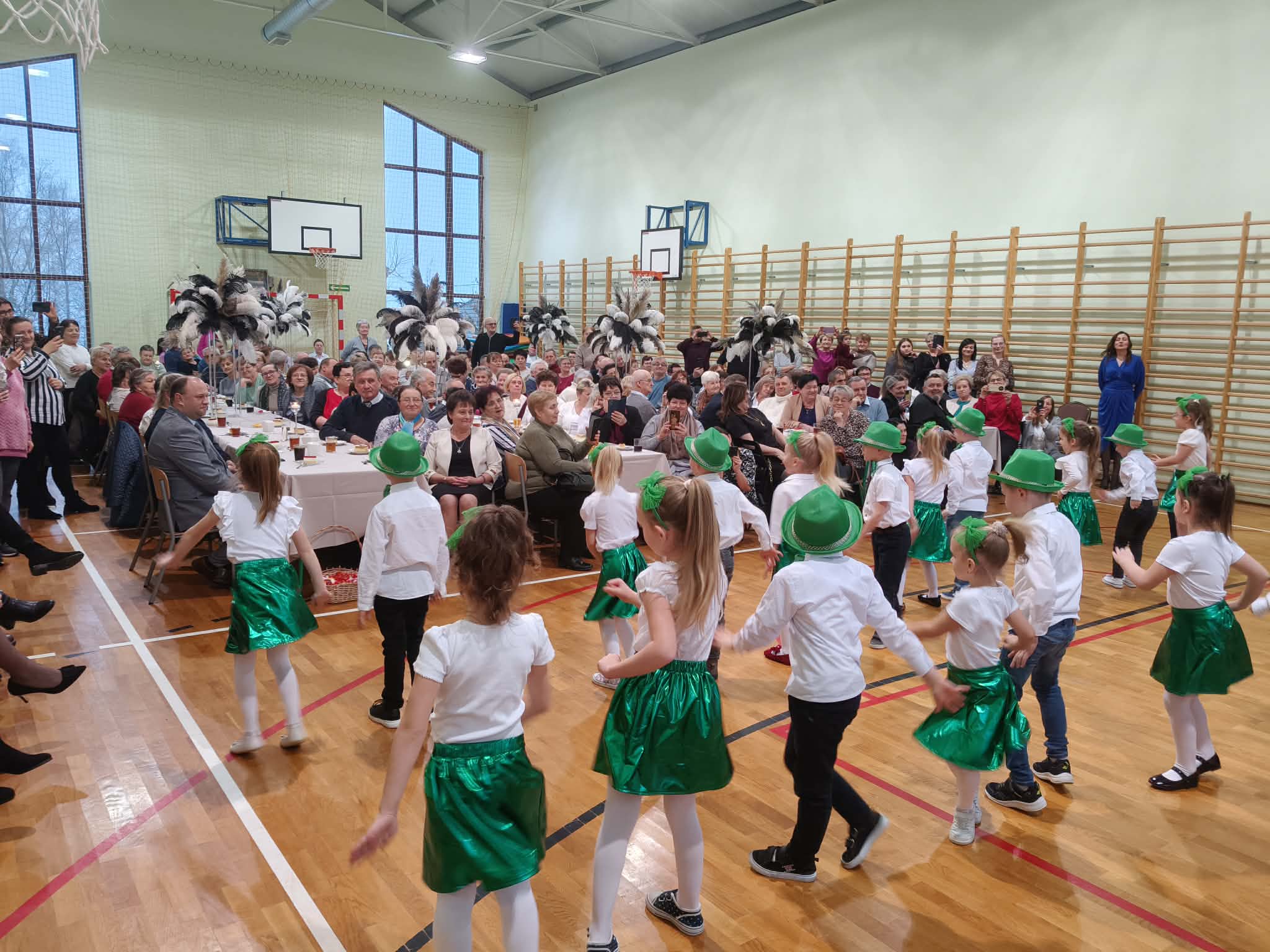 Następnie uczniowie klas 0-III przedstawili program artystyczny, który przygotowali pod opieką swoich wychowawców. Oczywiście musiało być wesoło, skocznie, bardzo rytmicznie i kolorowo. Na scenie pojawili się „profesjonalni” tancerze prezentujący skocznego jivea i rocka, radosna orkiestra z wieloma instrumentami, wierszyki, sentencje, wiele pięknych słów. Nie zabrakło kolorowych strojów i gadżetów. W tym roku przewagę wśród garderoby zdobyły karnawałowe błyskotki i cekiny. Z głośników zabrzmiały porywające do tańca przeboje oraz wzruszające piosenki wyrażające miłość i wdzięczność wnucząt. Pozostając w klimacie bożonarodzeniowym klasa III zatańczyła taniec „Noel”. Utalentowane uczennice klasy I wykonały zachwycający pokaz gimnastyki artystycznej. Był też czas na serdeczne, płynące prosto z serc życzenia i gromkie STO LAT! Występy dzieci zachwyciły publiczność, a każdy artystyczny akcent nagradzano gromkimi brawami.