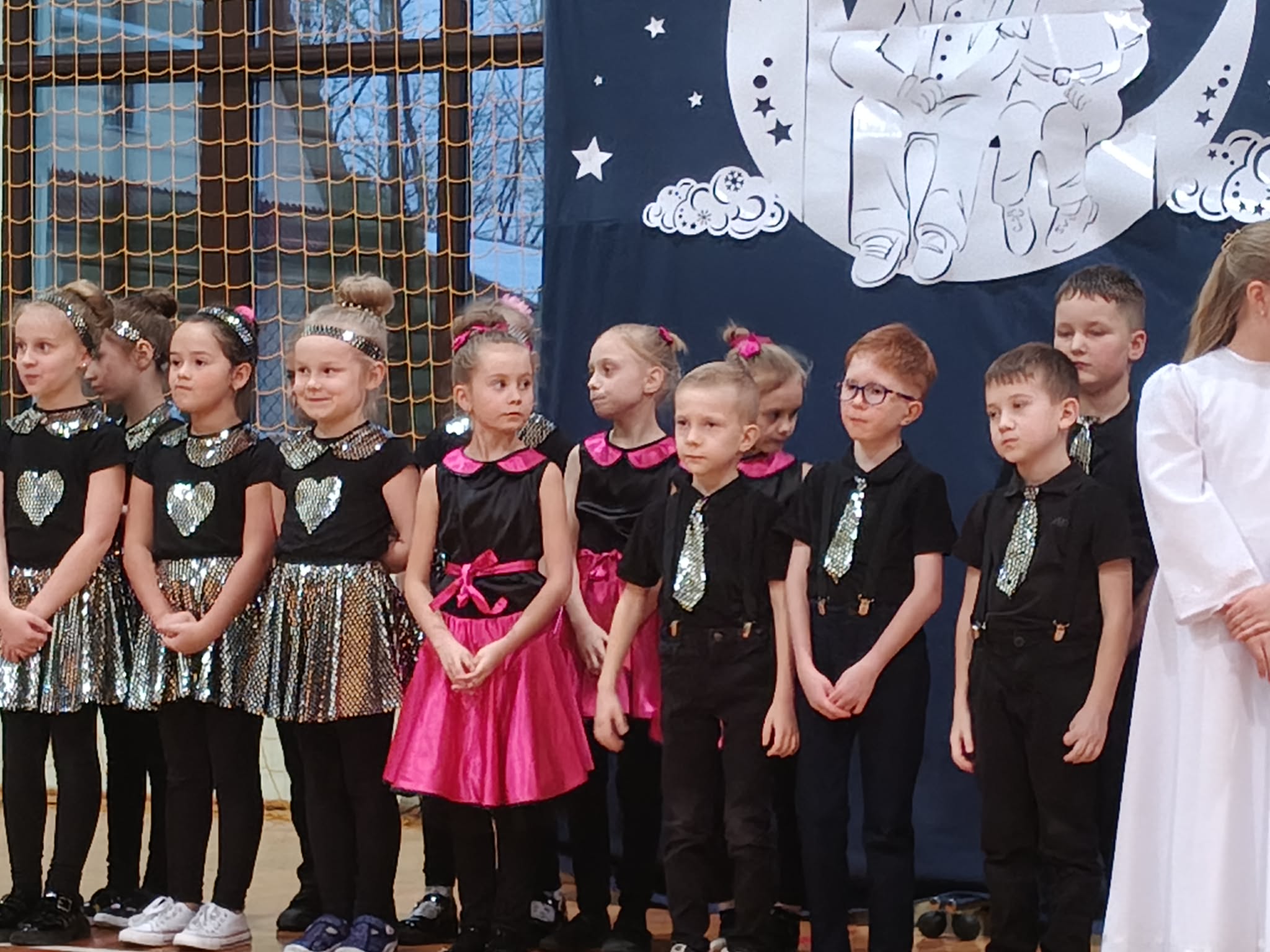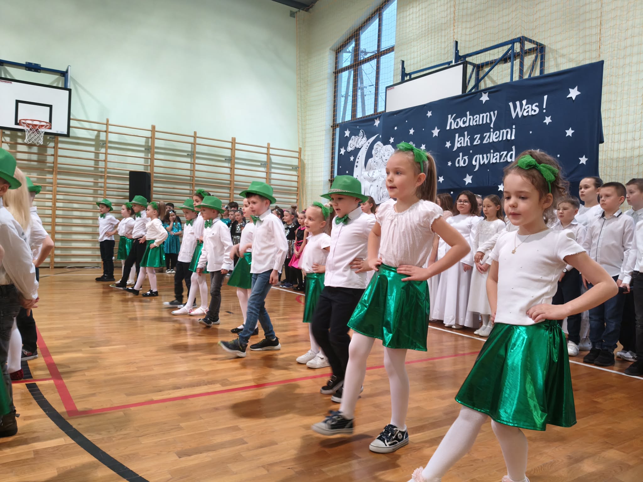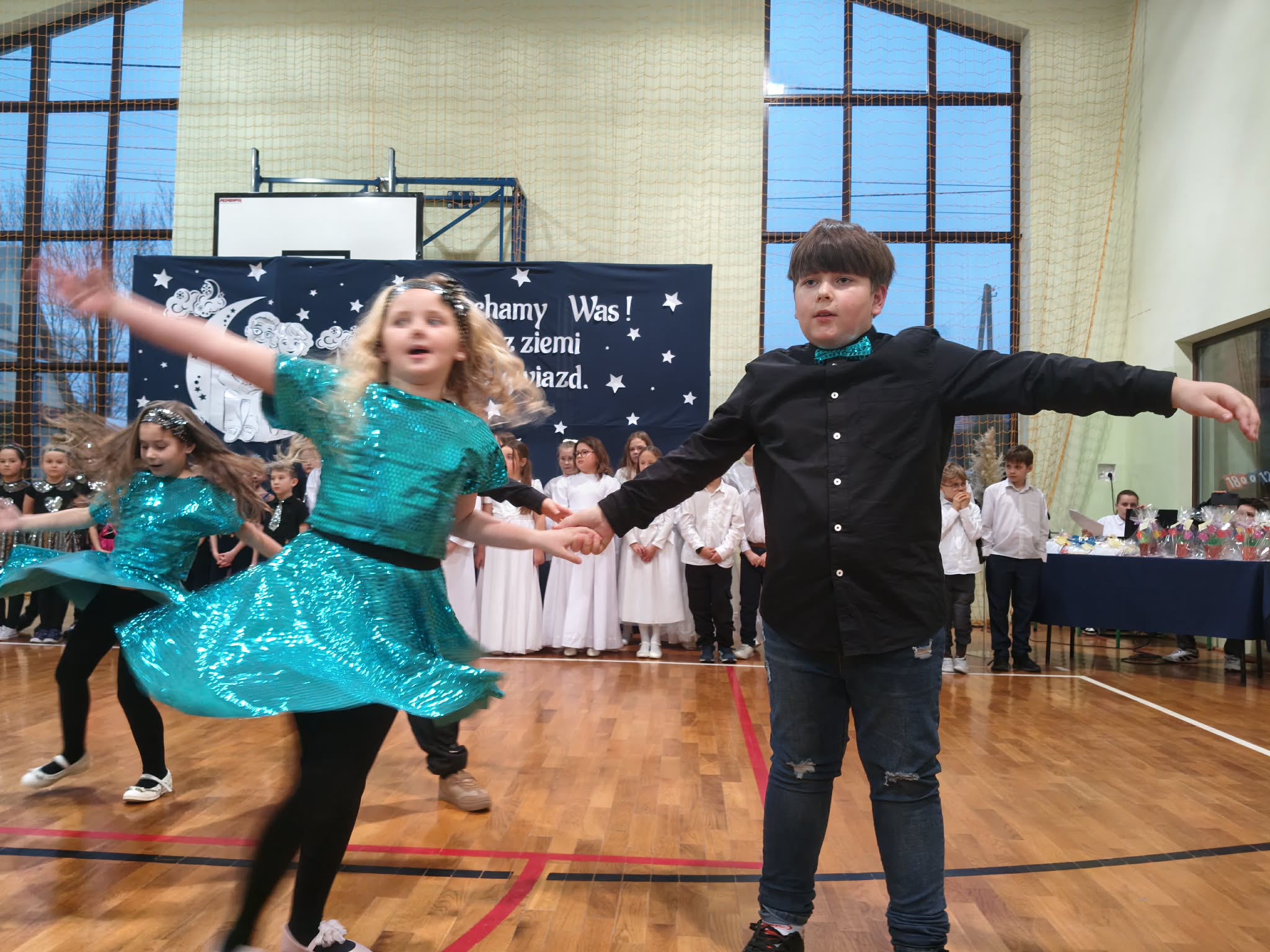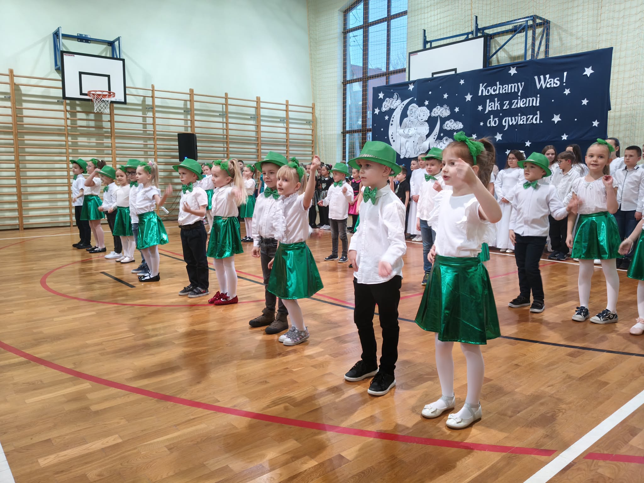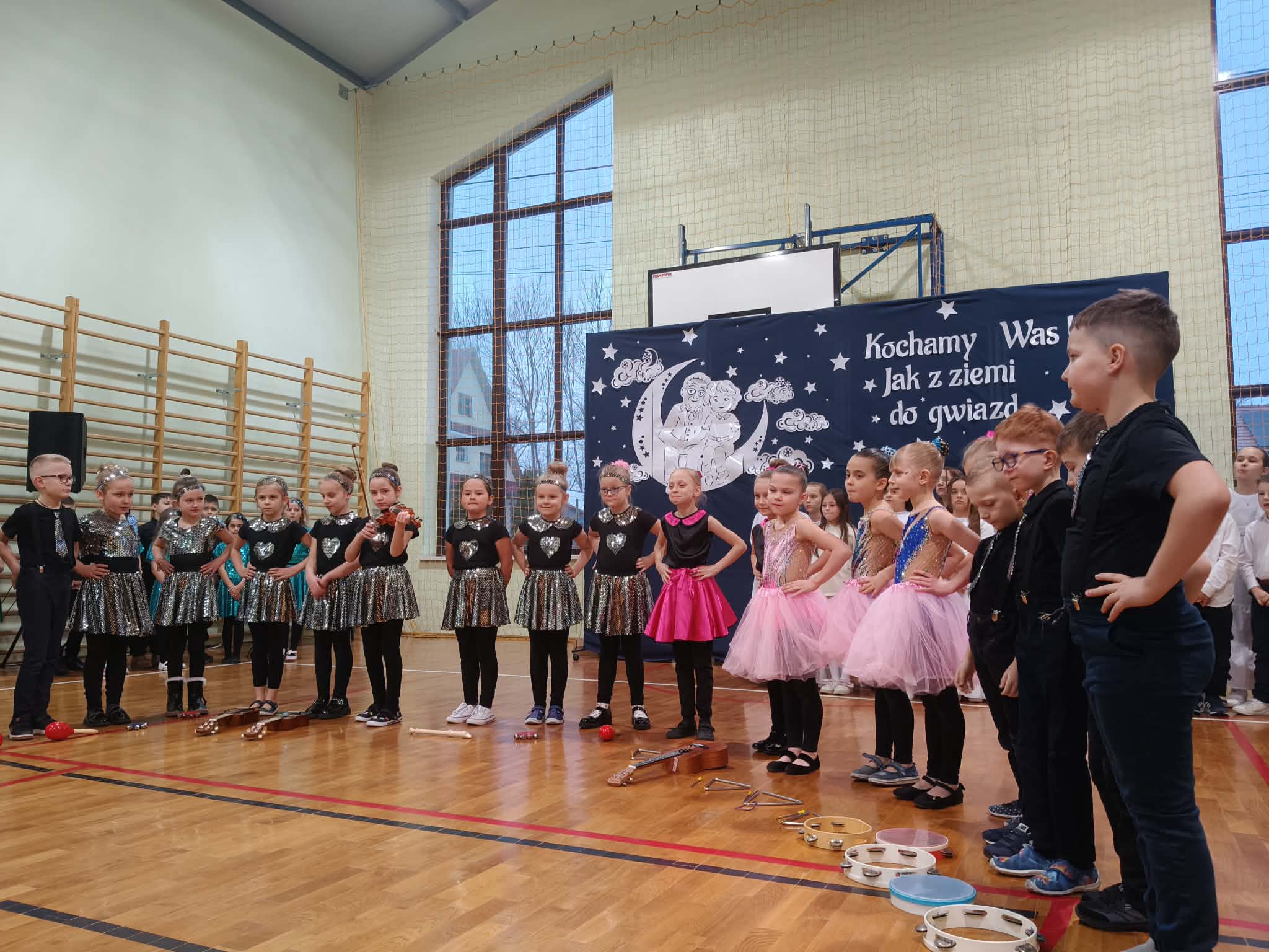 Następnie uczniowie klas 0-III przedstawili program artystyczny, który przygotowali pod opieką swoich wychowawców. Oczywiście musiało być wesoło, skocznie, bardzo rytmicznie i kolorowo. Na scenie pojawili się „profesjonalni” tancerze prezentujący skocznego jivea i rocka, radosna orkiestra z wieloma instrumentami, wierszyki, sentencje, wiele pięknych słów. Nie zabrakło kolorowych strojów i gadżetów. W tym roku przewagę wśród garderoby zdobyły karnawałowe błyskotki i cekiny. Z głośników zabrzmiały porywające do tańca przeboje oraz wzruszające piosenki wyrażające miłość i wdzięczność wnucząt. Pozostając w klimacie bożonarodzeniowym klasa III zatańczyła taniec „Noel”. Utalentowane uczennice klasy I wykonały zachwycający pokaz gimnastyki artystycznej. Był też czas na serdeczne, płynące prosto z serc życzenia i gromkie STO LAT! Występy dzieci zachwyciły publiczność, a każdy artystyczny akcent nagradzano gromkimi brawami.