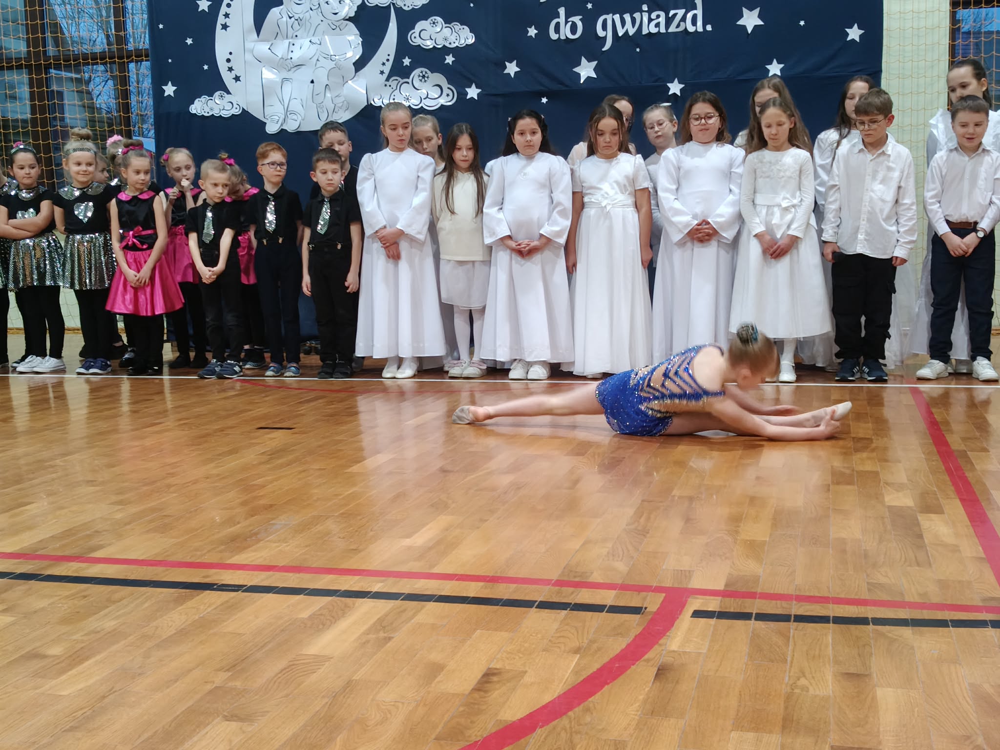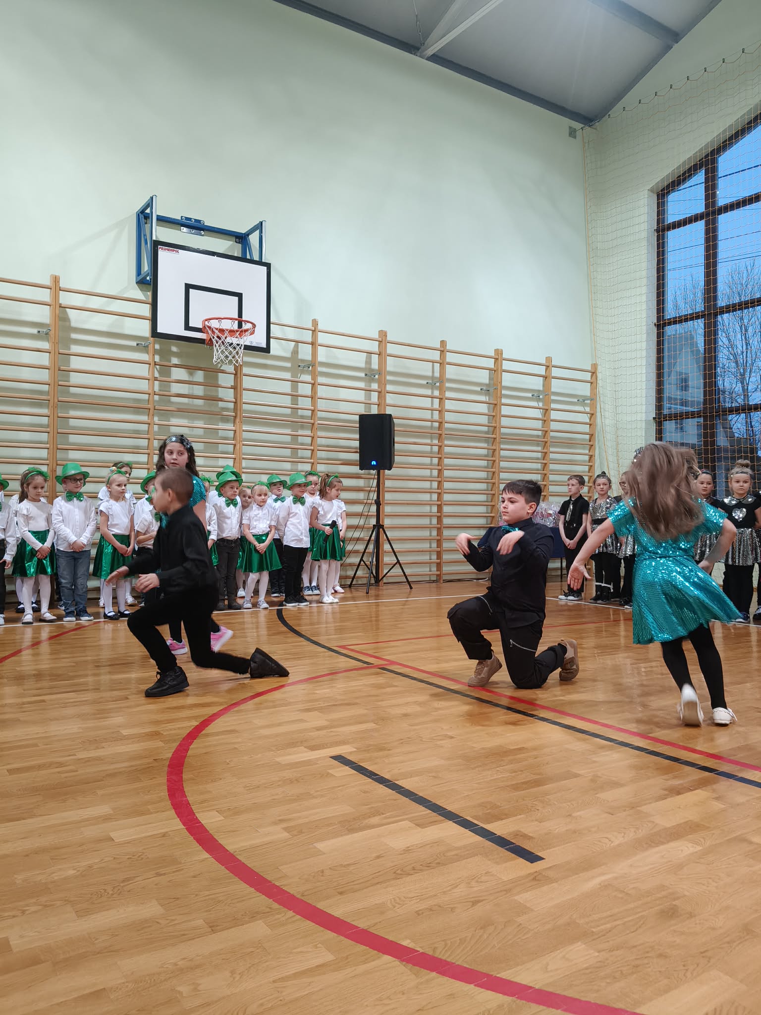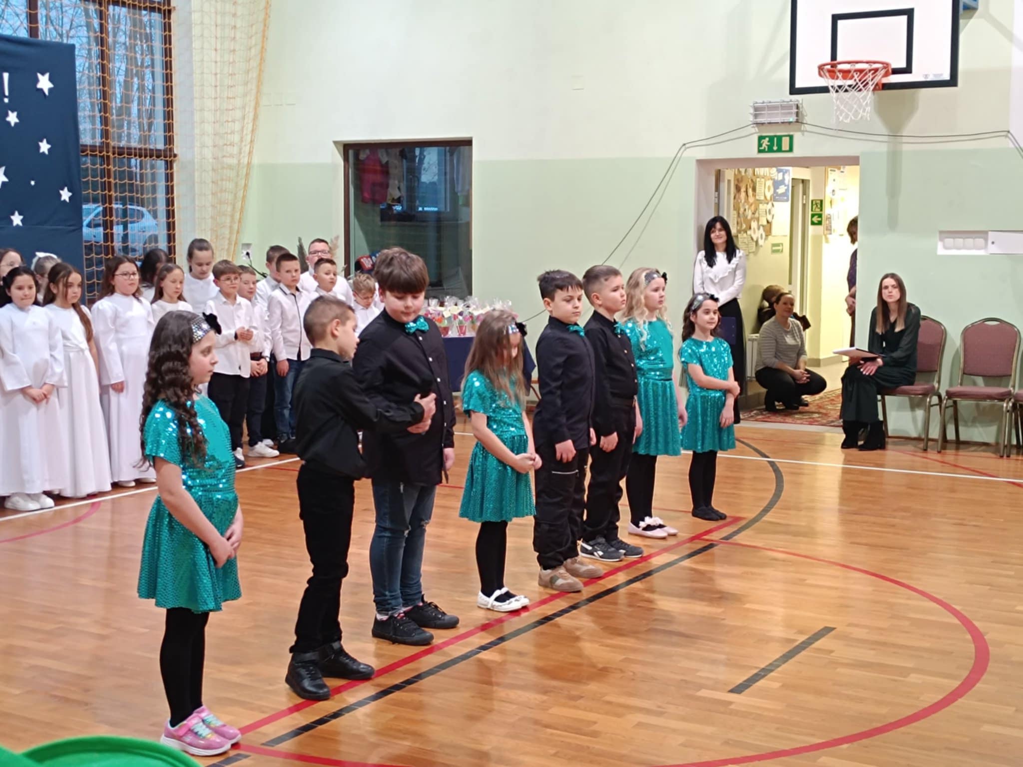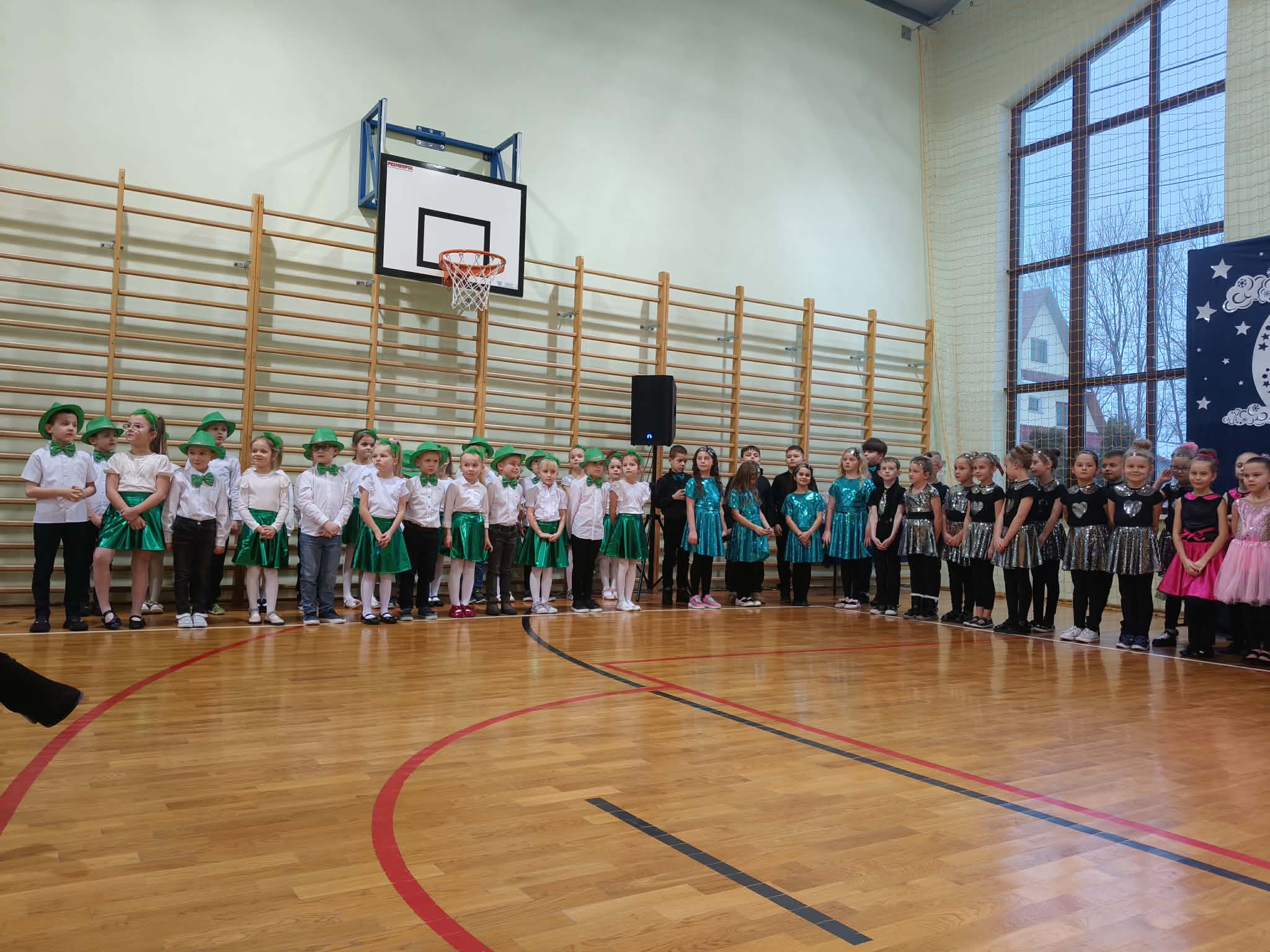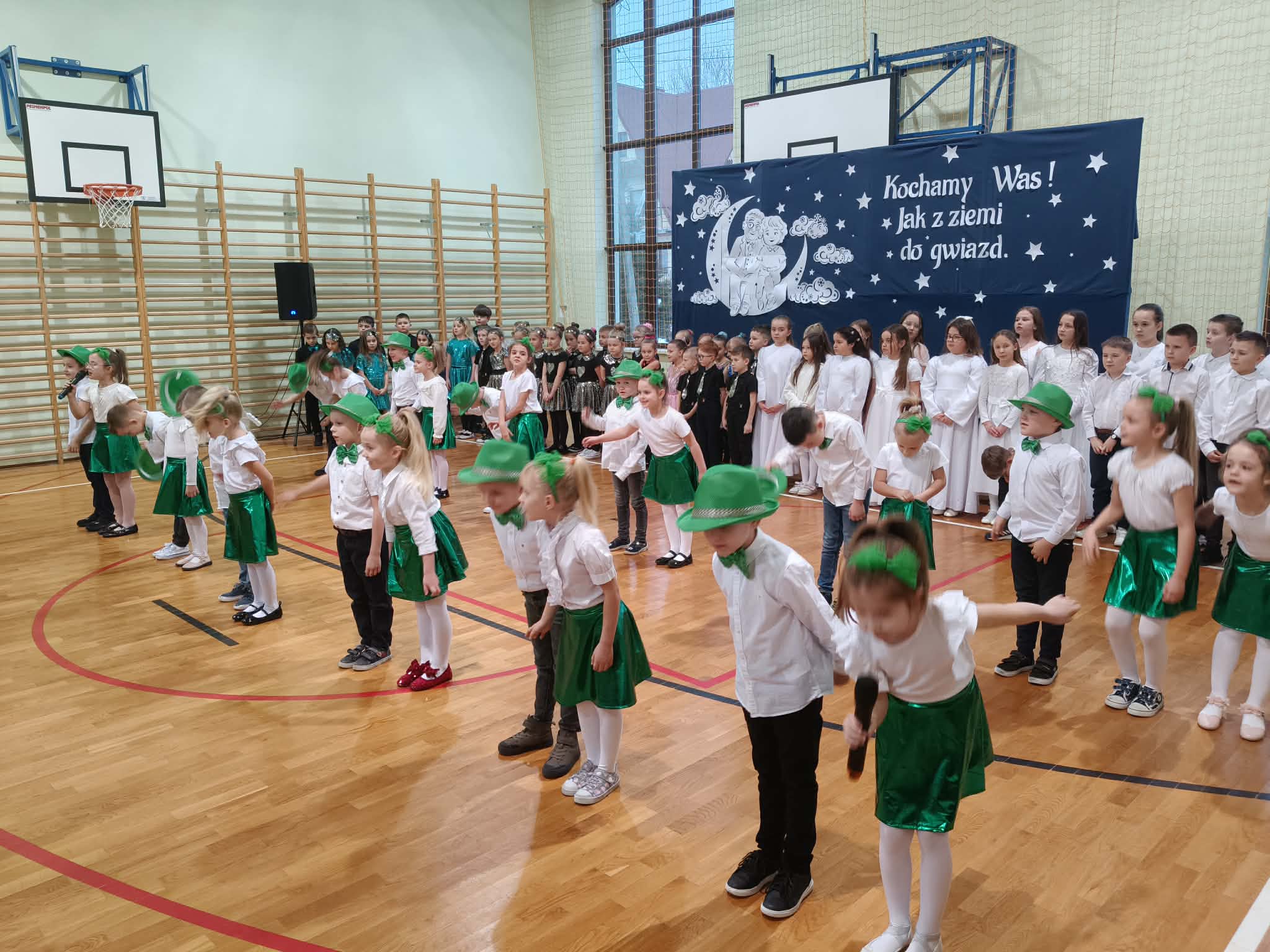 Następnie uczniowie klas 0-III przedstawili program artystyczny, który przygotowali pod opieką swoich wychowawców. Oczywiście musiało być wesoło, skocznie, bardzo rytmicznie i kolorowo. Na scenie pojawili się „profesjonalni” tancerze prezentujący skocznego jivea i rocka, radosna orkiestra z wieloma instrumentami, wierszyki, sentencje, wiele pięknych słów. Nie zabrakło kolorowych strojów i gadżetów. W tym roku przewagę wśród garderoby zdobyły karnawałowe błyskotki i cekiny. Z głośników zabrzmiały porywające do tańca przeboje oraz wzruszające piosenki wyrażające miłość i wdzięczność wnucząt. Pozostając w klimacie bożonarodzeniowym klasa III zatańczyła taniec „Noel”. Utalentowane uczennice klasy I wykonały zachwycający pokaz gimnastyki artystycznej. Był też czas na serdeczne, płynące prosto z serc życzenia i gromkie STO LAT! Występy dzieci zachwyciły publiczność, a każdy artystyczny akcent nagradzano gromkimi brawami.