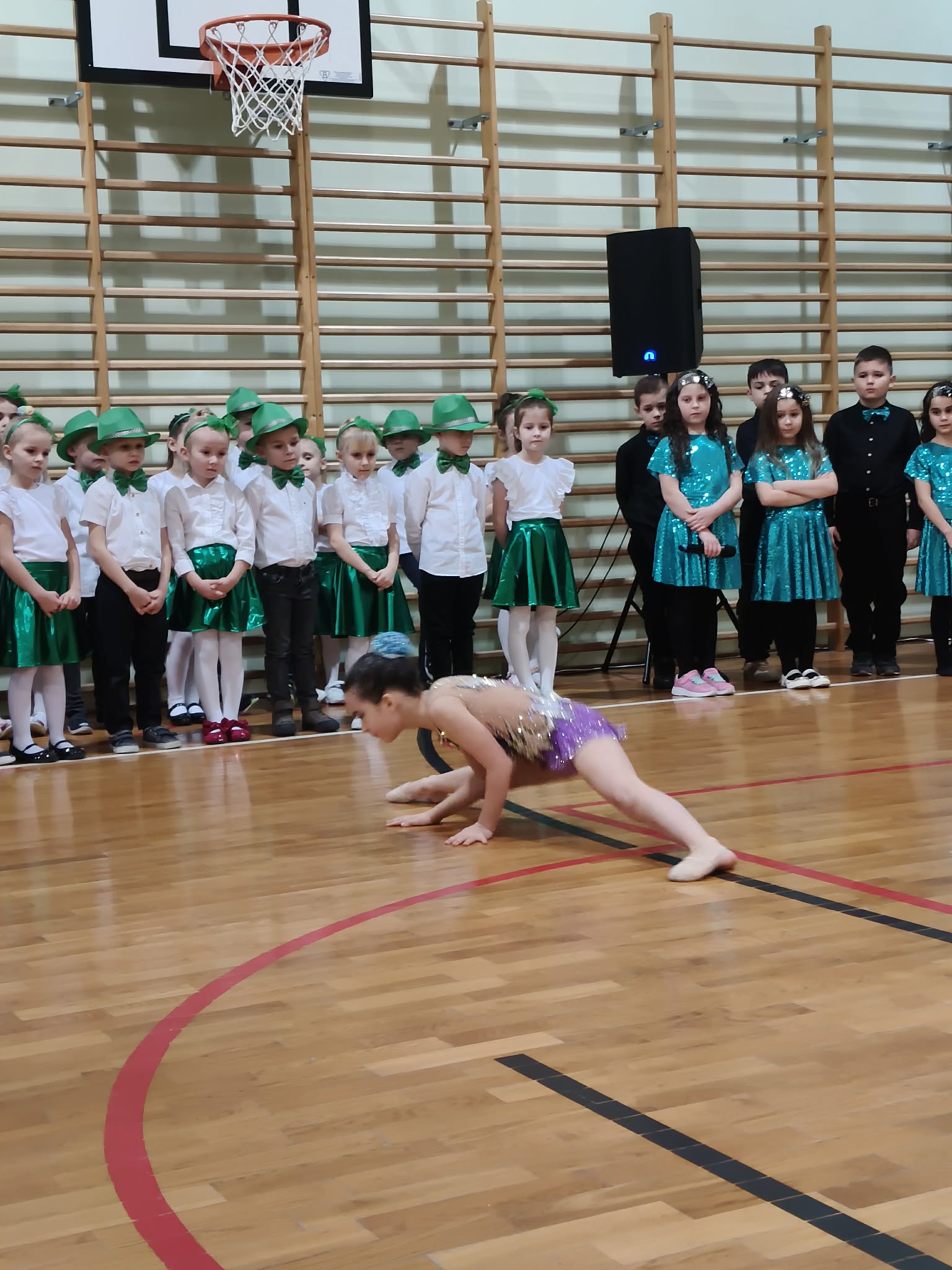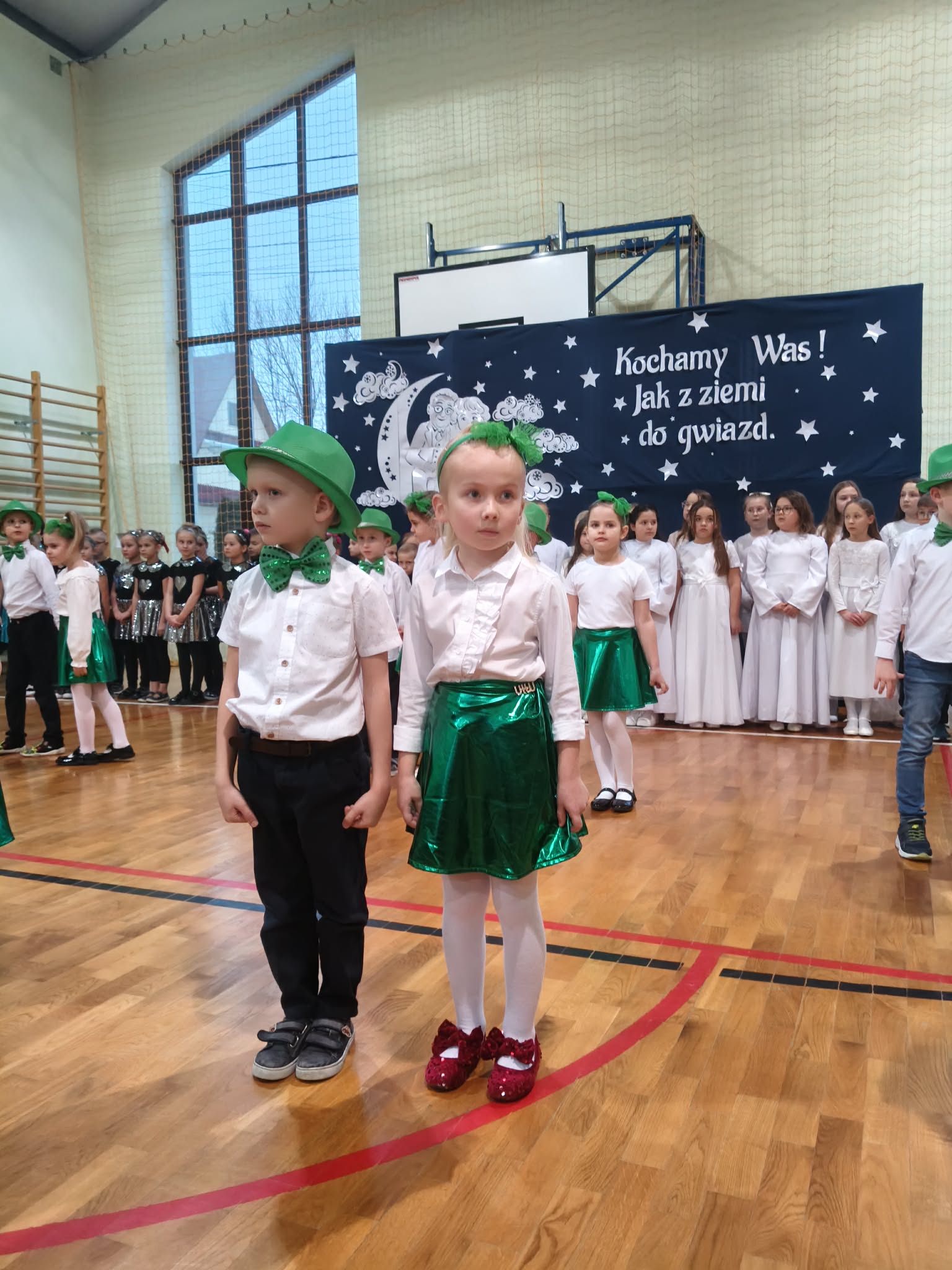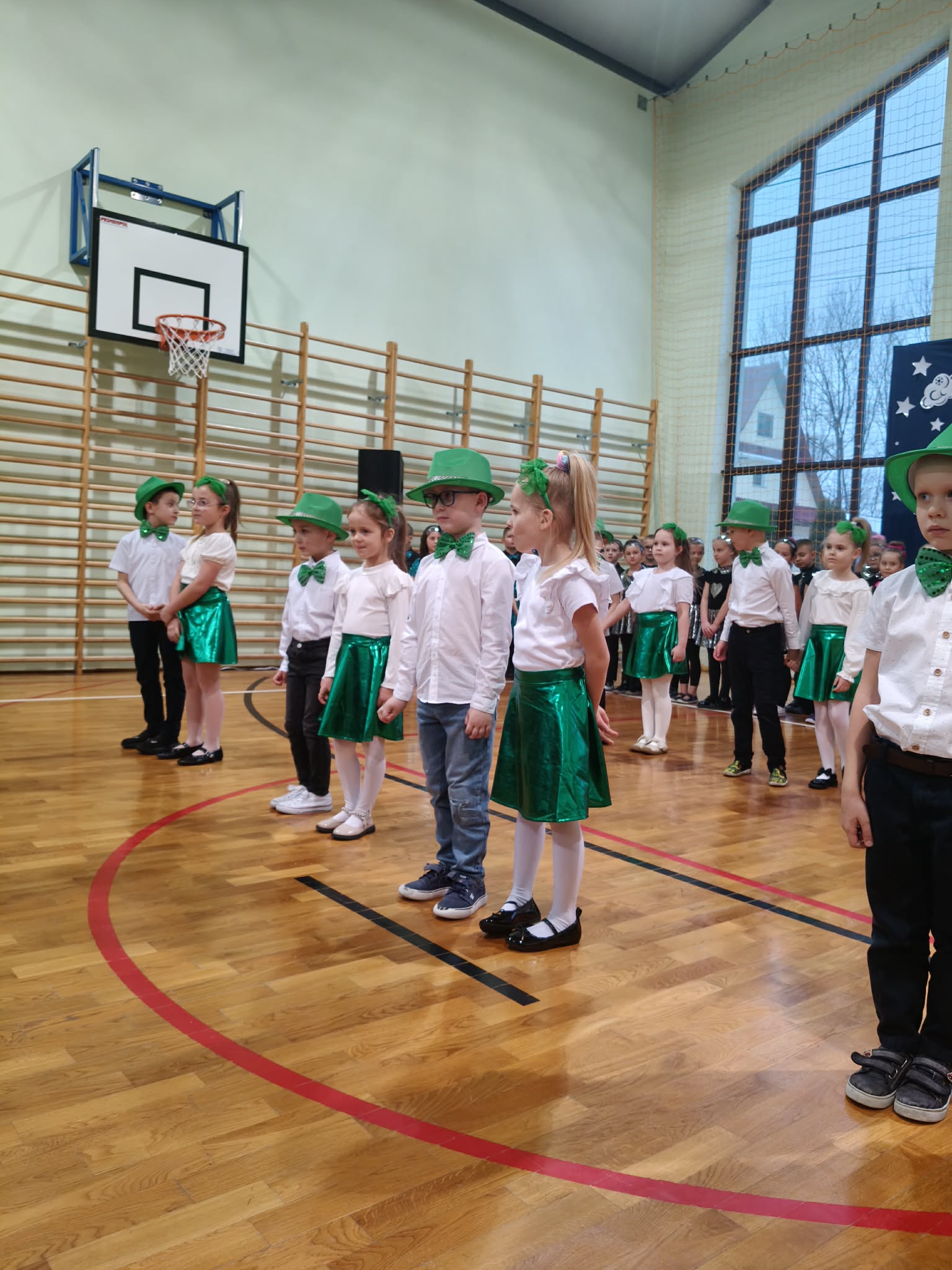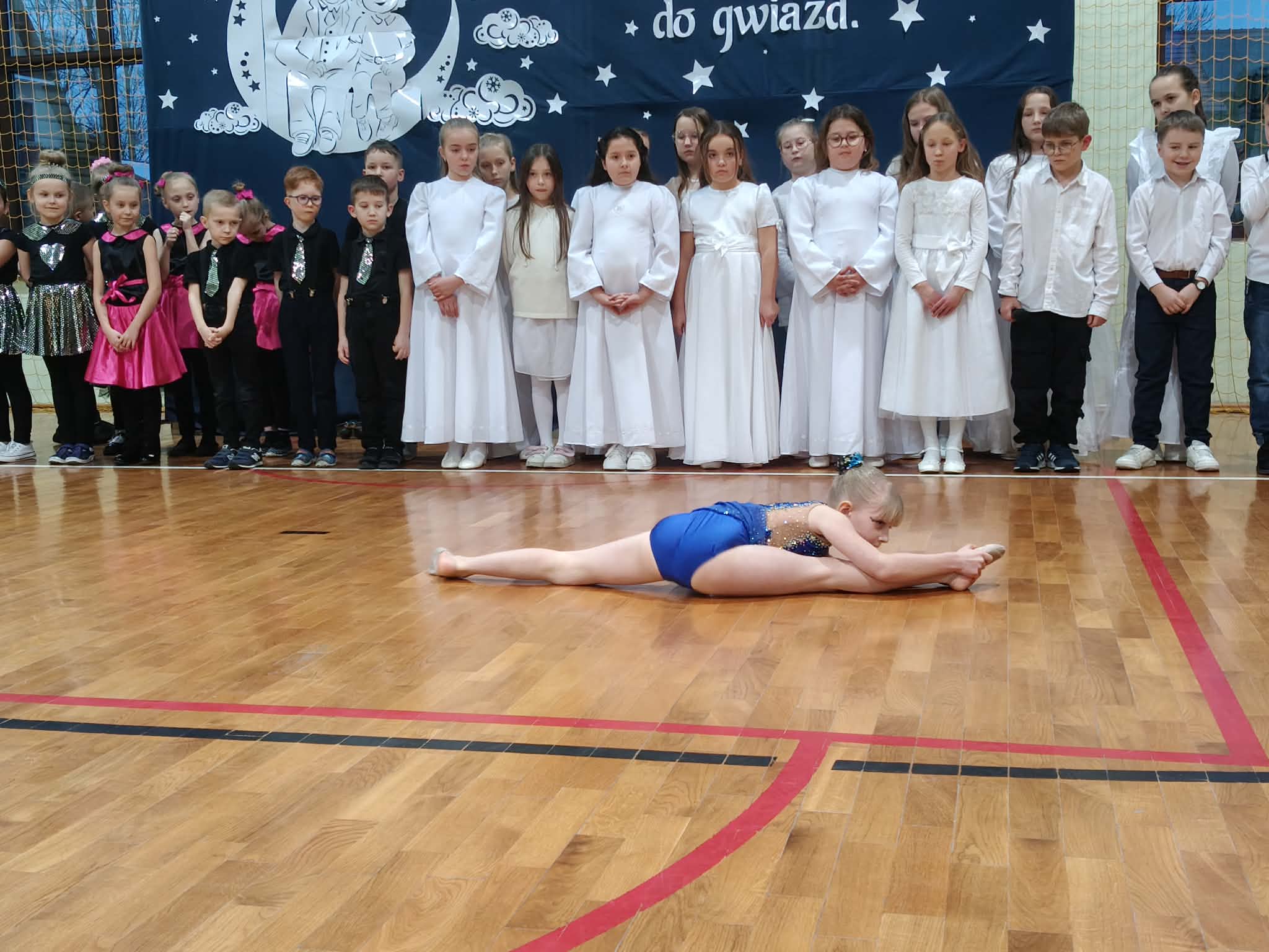 Następnie uczniowie klas 0-III przedstawili program artystyczny, który przygotowali pod opieką swoich wychowawców. Oczywiście musiało być wesoło, skocznie, bardzo rytmicznie i kolorowo. Na scenie pojawili się „profesjonalni” tancerze prezentujący skocznego jivea i rocka, radosna orkiestra z wieloma instrumentami, wierszyki, sentencje, wiele pięknych słów. Nie zabrakło kolorowych strojów i gadżetów. W tym roku przewagę wśród garderoby zdobyły karnawałowe błyskotki i cekiny. Z głośników zabrzmiały porywające do tańca przeboje oraz wzruszające piosenki wyrażające miłość i wdzięczność wnucząt. Pozostając w klimacie bożonarodzeniowym klasa III zatańczyła taniec „Noel”. Utalentowane uczennice klasy I wykonały zachwycający pokaz gimnastyki artystycznej. Był też czas na serdeczne, płynące prosto z serc życzenia i gromkie STO LAT! Występy dzieci zachwyciły publiczność, a każdy artystyczny akcent nagradzano gromkimi brawami.