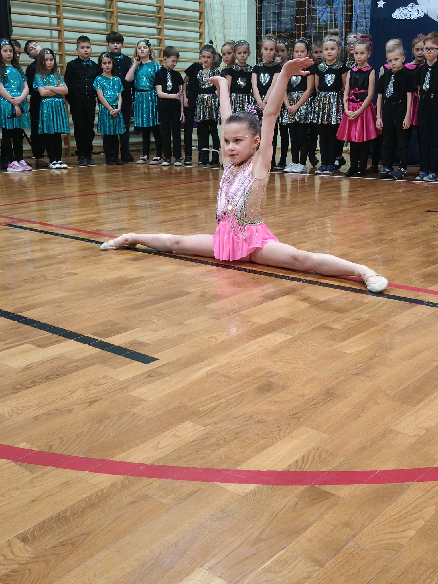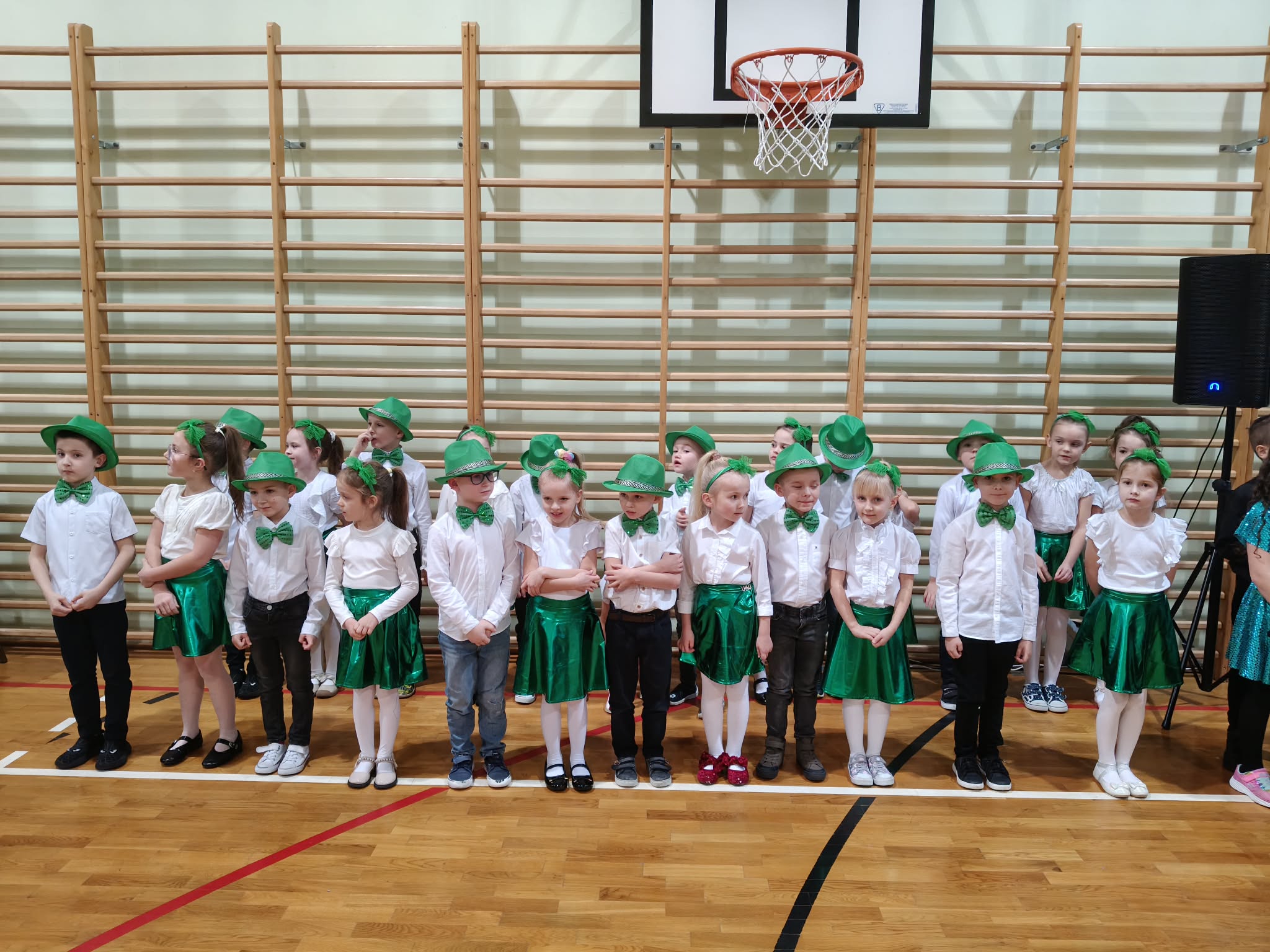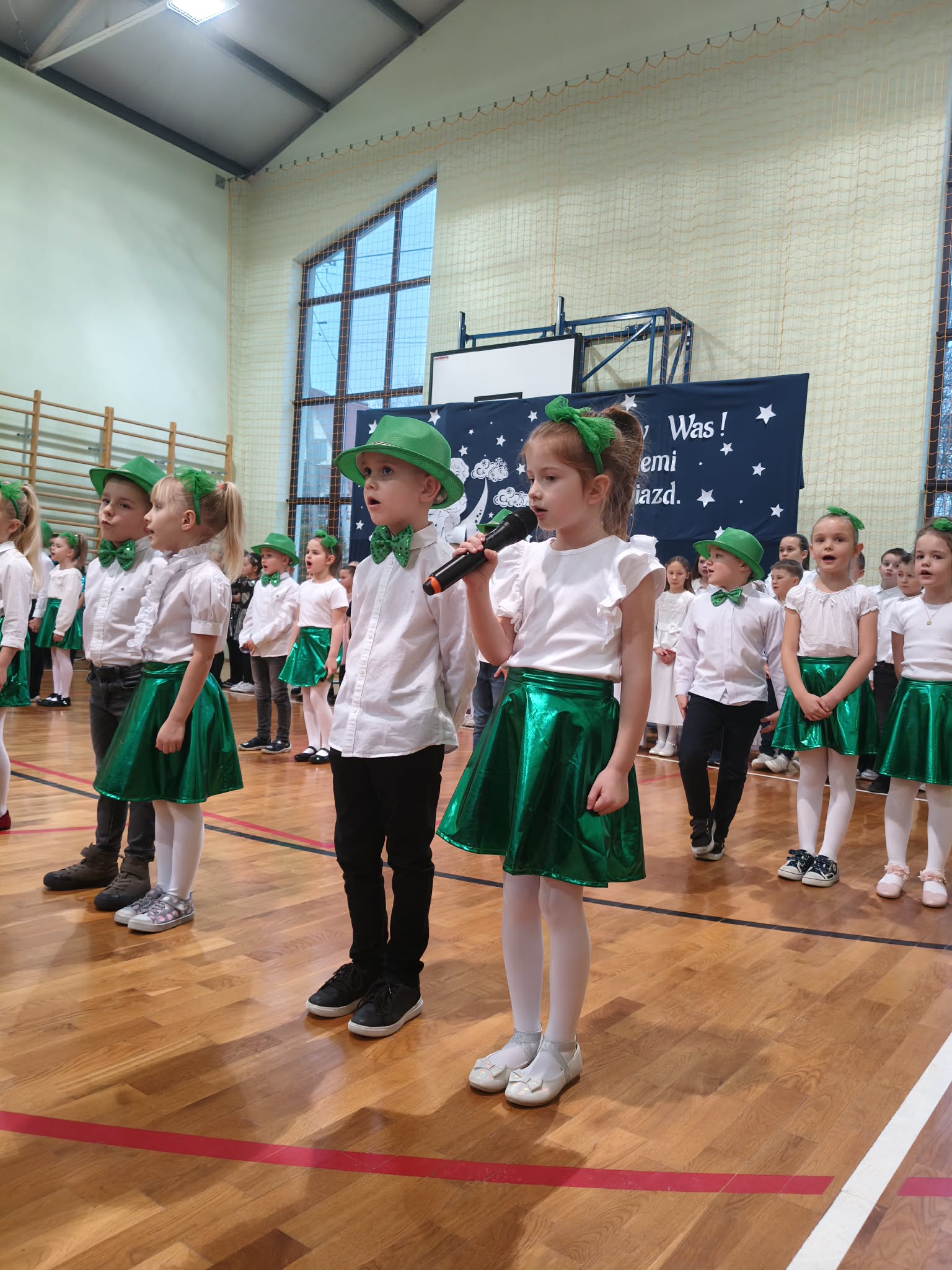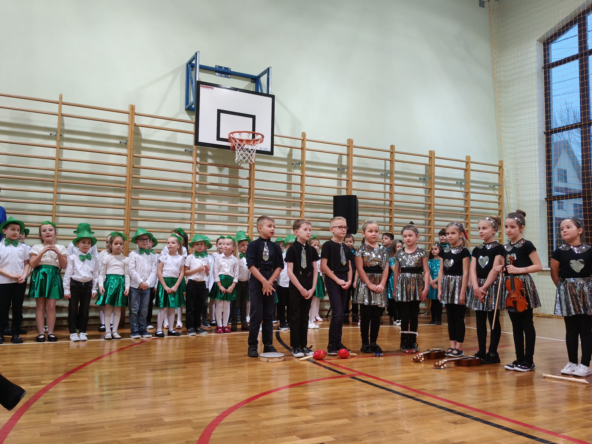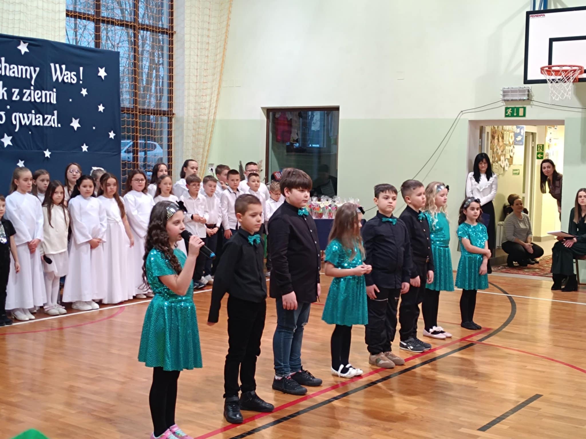 Następnie uczniowie klas 0-III przedstawili program artystyczny, który przygotowali pod opieką swoich wychowawców. Oczywiście musiało być wesoło, skocznie, bardzo rytmicznie i kolorowo. Na scenie pojawili się „profesjonalni” tancerze prezentujący skocznego jivea i rocka, radosna orkiestra z wieloma instrumentami, wierszyki, sentencje, wiele pięknych słów. Nie zabrakło kolorowych strojów i gadżetów. W tym roku przewagę wśród garderoby zdobyły karnawałowe błyskotki i cekiny. Z głośników zabrzmiały porywające do tańca przeboje oraz wzruszające piosenki wyrażające miłość i wdzięczność wnucząt. Pozostając w klimacie bożonarodzeniowym klasa III zatańczyła taniec „Noel”. Utalentowane uczennice klasy I wykonały zachwycający pokaz gimnastyki artystycznej. Był też czas na serdeczne, płynące prosto z serc życzenia i gromkie STO LAT! Występy dzieci zachwyciły publiczność, a każdy artystyczny akcent nagradzano gromkimi brawami.