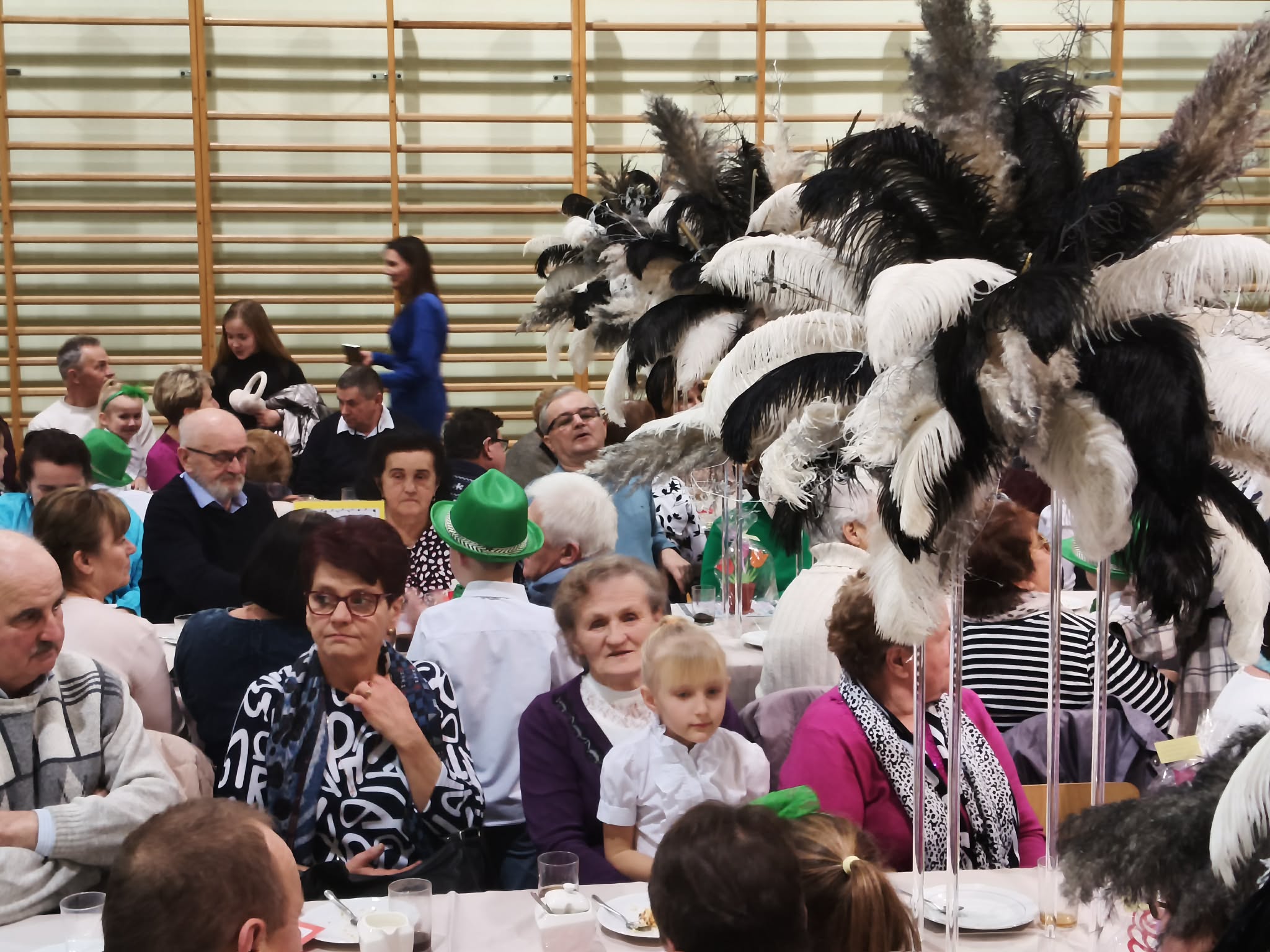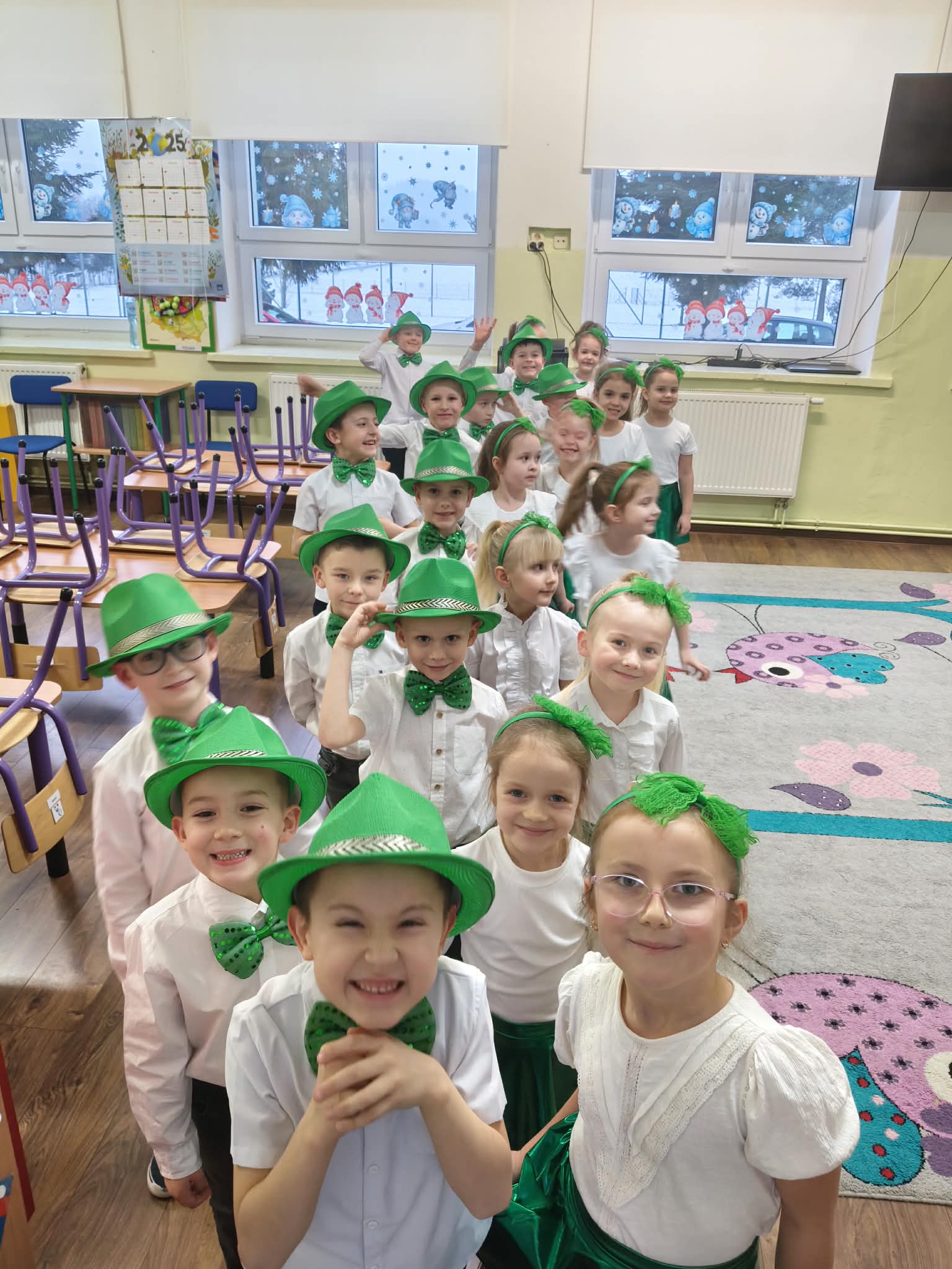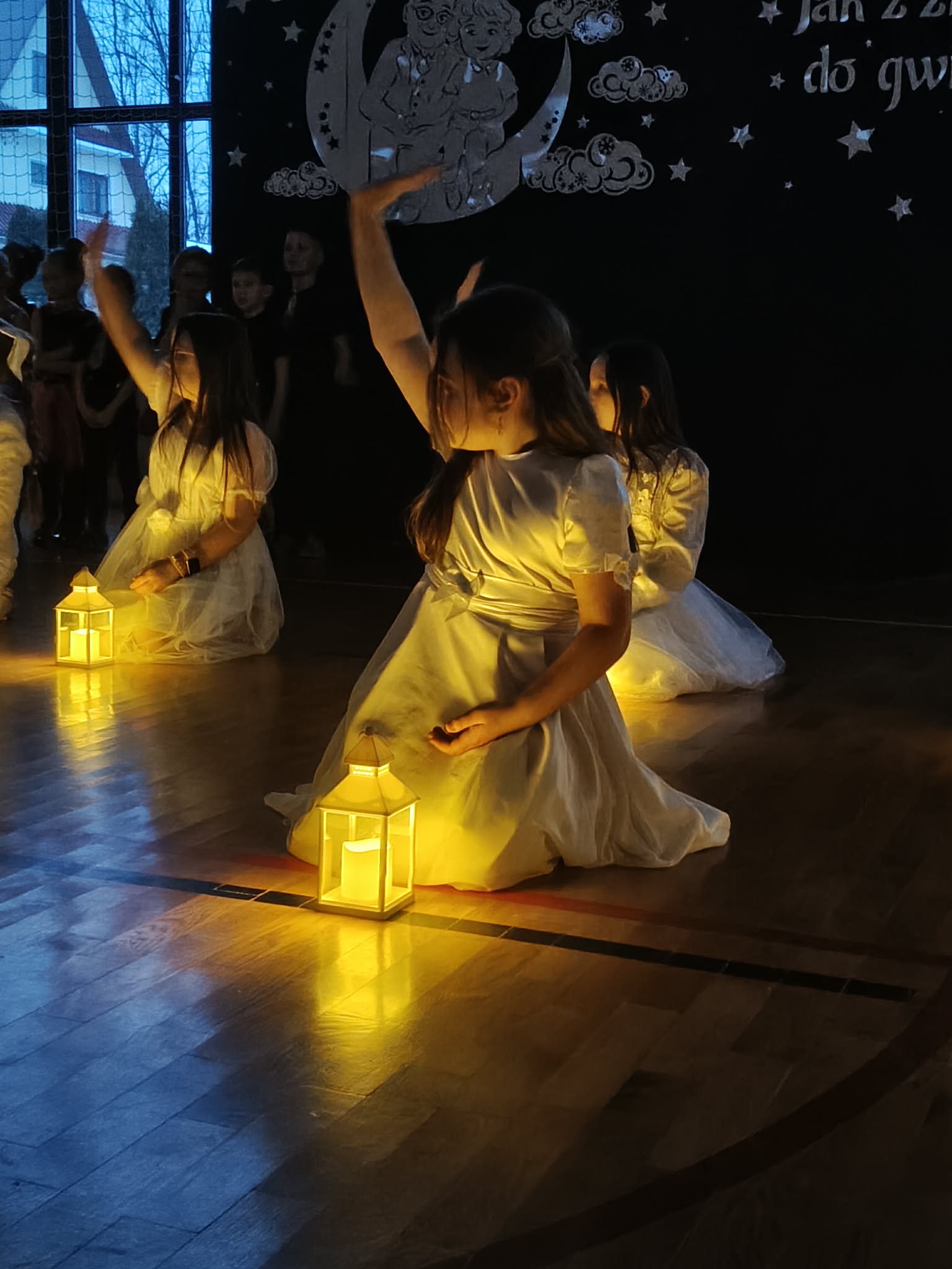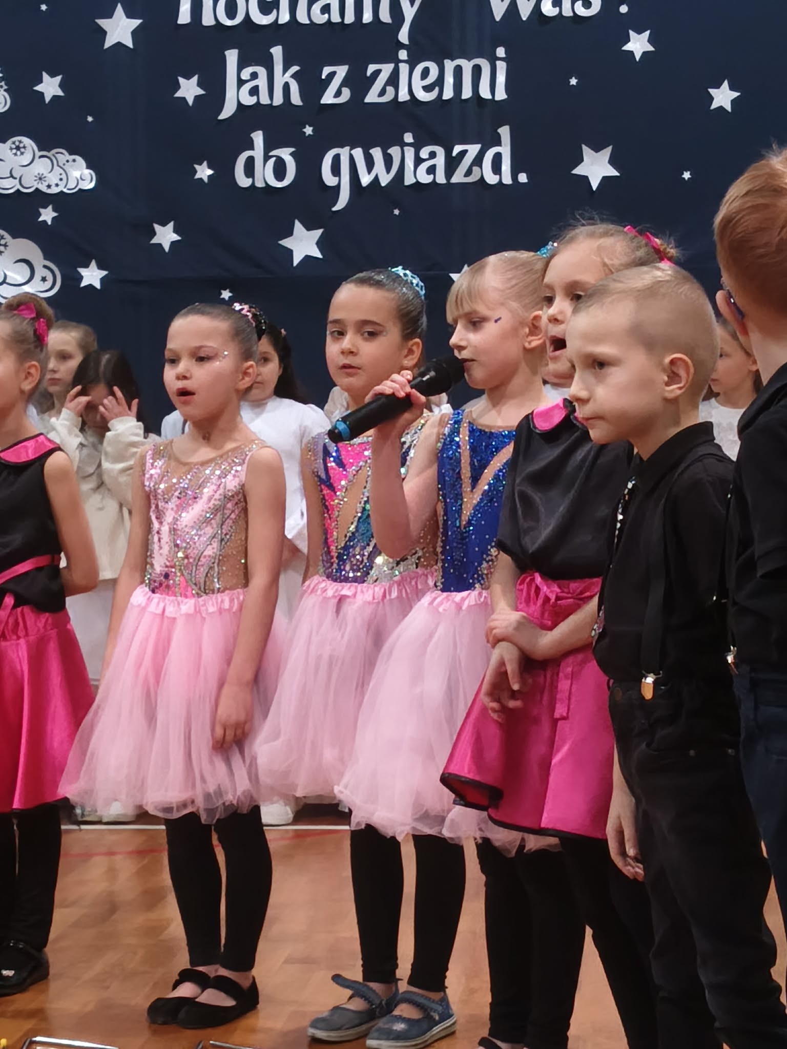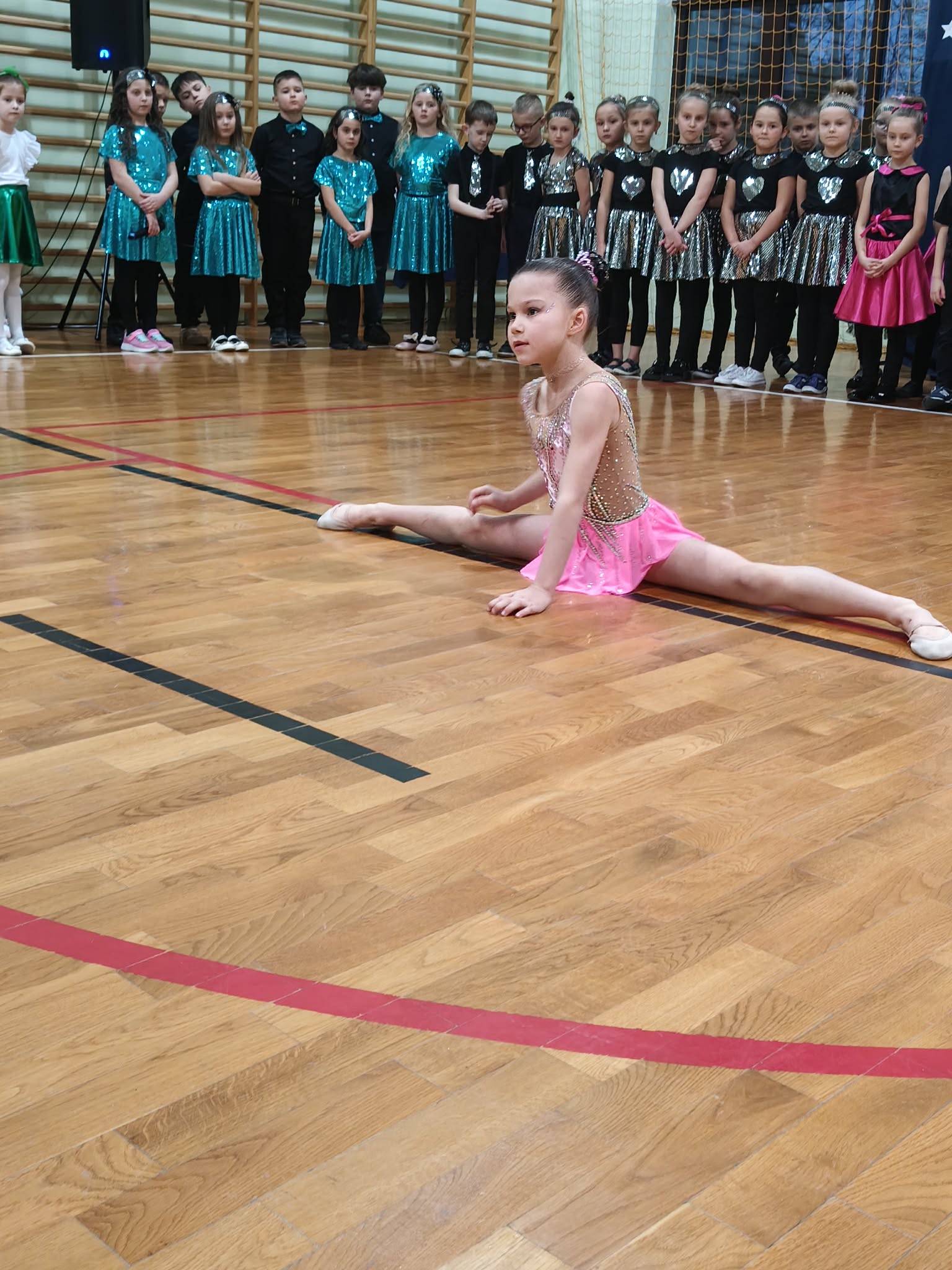 Następnie uczniowie klas 0-III przedstawili program artystyczny, który przygotowali pod opieką swoich wychowawców. Oczywiście musiało być wesoło, skocznie, bardzo rytmicznie i kolorowo. Na scenie pojawili się „profesjonalni” tancerze prezentujący skocznego jivea i rocka, radosna orkiestra z wieloma instrumentami, wierszyki, sentencje, wiele pięknych słów. Nie zabrakło kolorowych strojów i gadżetów. W tym roku przewagę wśród garderoby zdobyły karnawałowe błyskotki i cekiny. Z głośników zabrzmiały porywające do tańca przeboje oraz wzruszające piosenki wyrażające miłość i wdzięczność wnucząt. Pozostając w klimacie bożonarodzeniowym klasa III zatańczyła taniec „Noel”. Utalentowane uczennice klasy I wykonały zachwycający pokaz gimnastyki artystycznej. Był też czas na serdeczne, płynące prosto z serc życzenia i gromkie STO LAT! Występy dzieci zachwyciły publiczność, a każdy artystyczny akcent nagradzano gromkimi brawami.