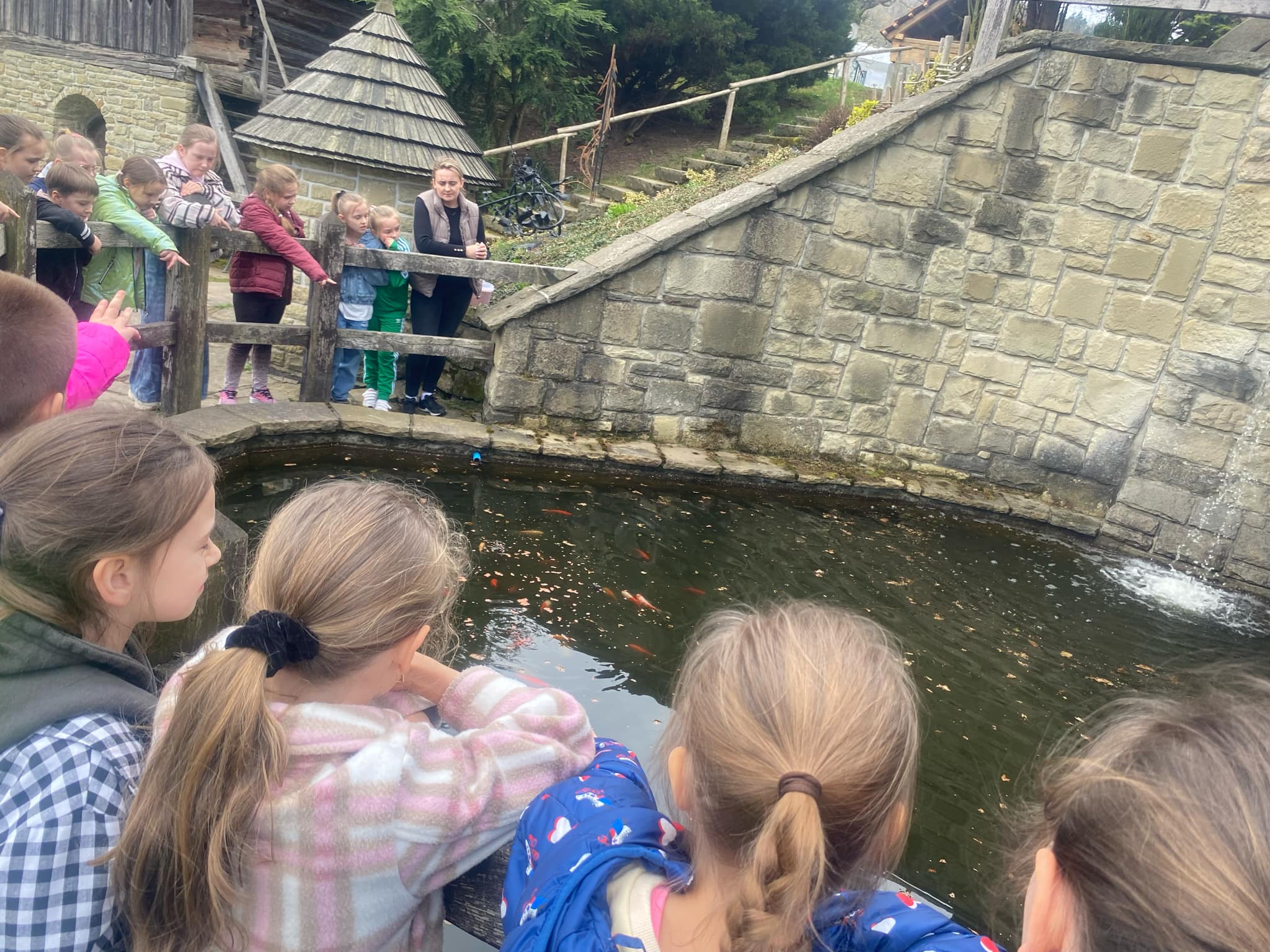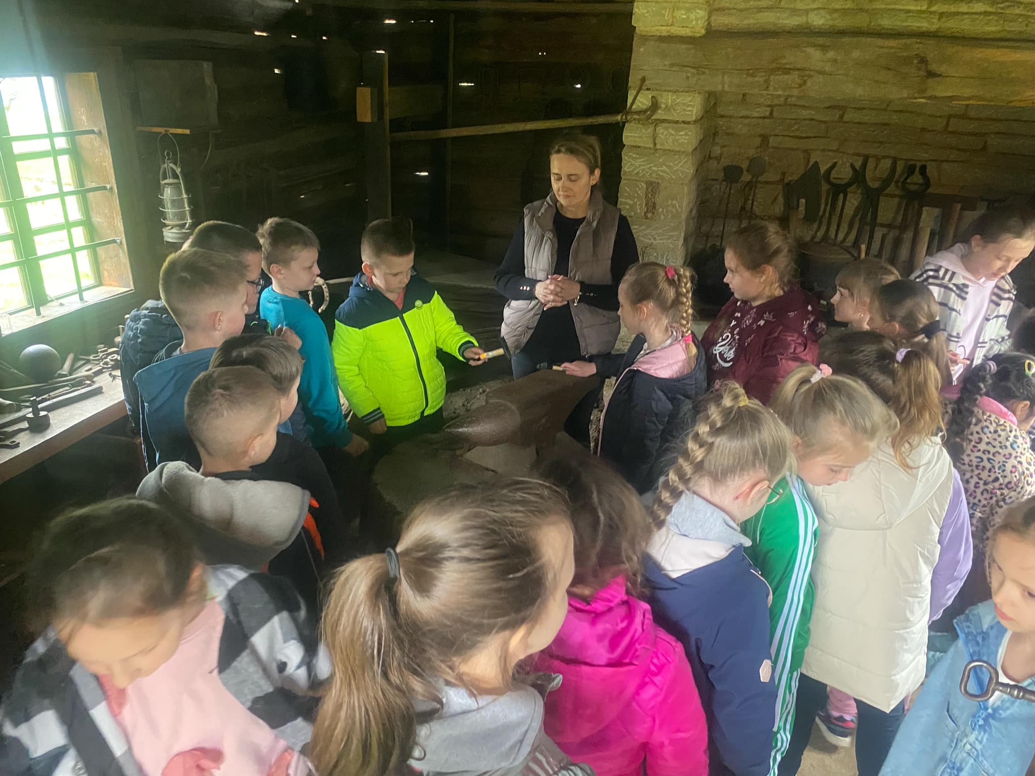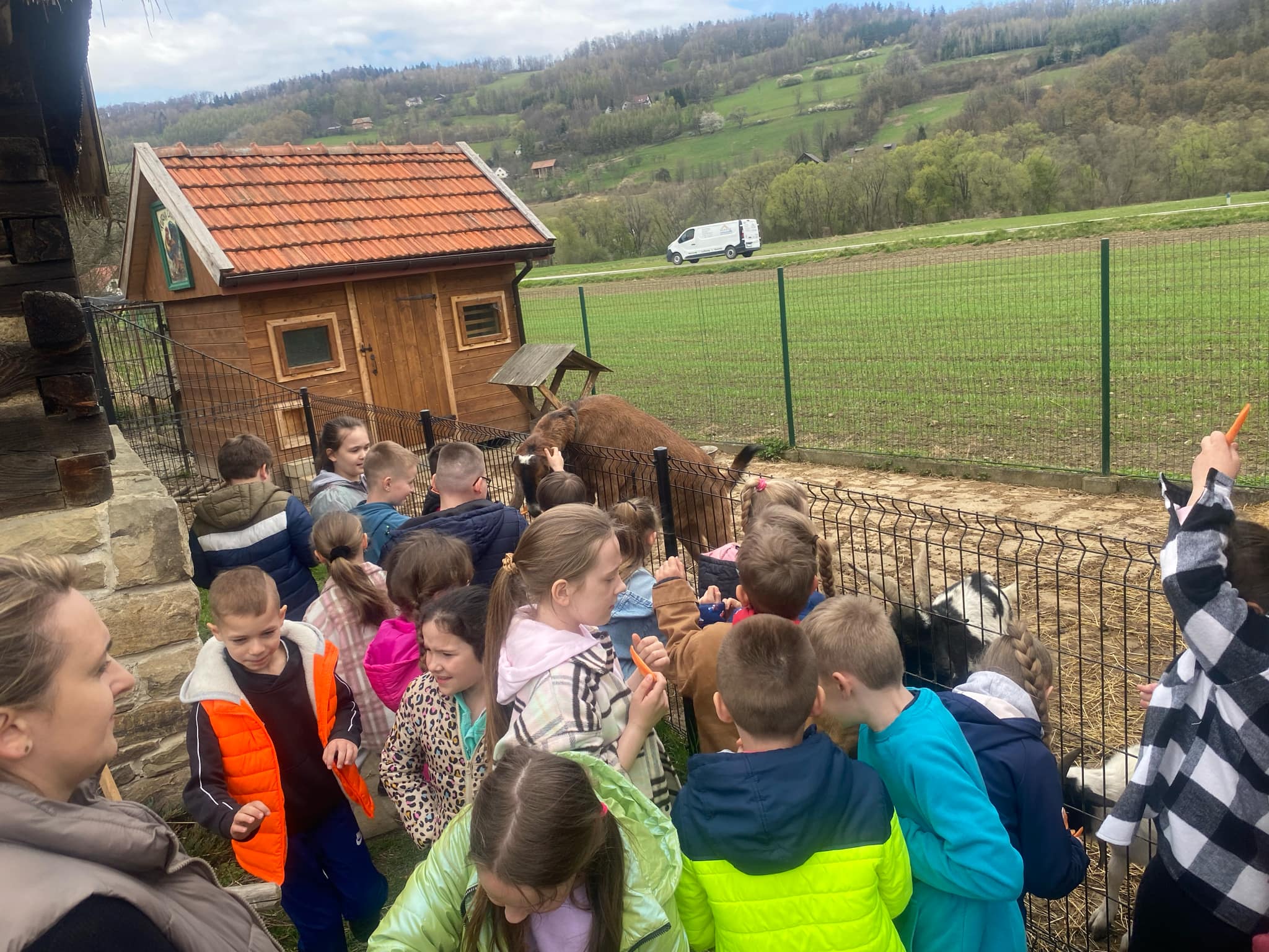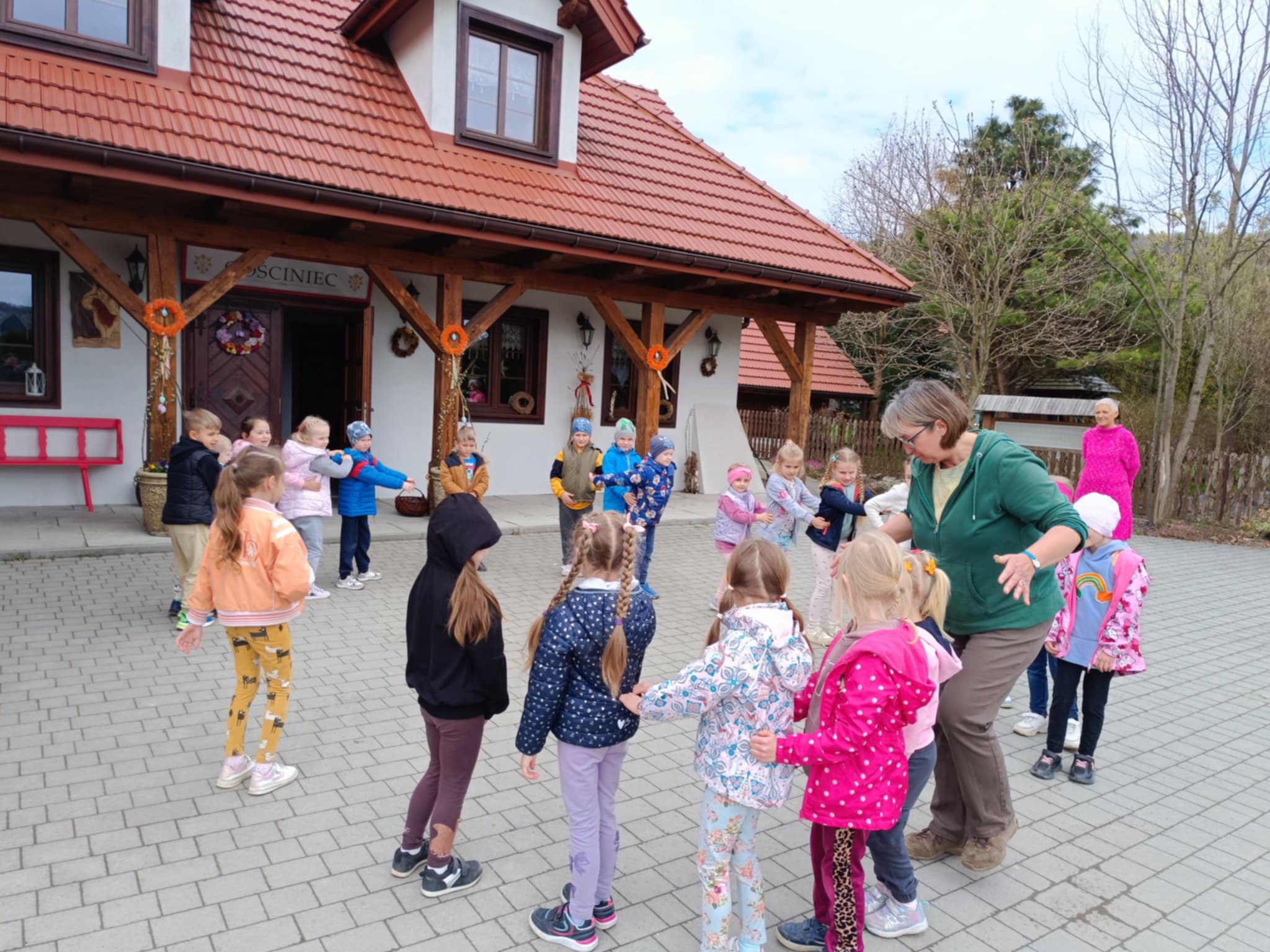 14 kwietnia dzieciaki z oddziału przedszkolnego oraz uczniowie klas I-III wybrali się do pobliskiej Laskowej, aby przeżyć radosną, wiosenną przygodę. Naszym celem był położony w malowniczej scenerii #SKANSENNAJĘDRZEJKÓWCE . Dzień rozpoczął się serdecznym przywitaniem z sympatycznymi animatorkami oraz pałaszowaniem słodkich racuszków. Po wspólnym śniadaniu był czas na zwiedzanie skansenu- zapoznanie się z architekturą dawnych wsi, warunkami życia oraz pracy ludzi na wsiach w dawnych czasach, oglądanie dawnych mebli, sprzętów domowych oraz sprzętów potrzebnych w każdym gospodarstwie. Każdy uczestnik wycieczki mógł się „przenieść w czasie„ wchodząc do starej chałupy ze stajenką i stodołą, zobaczyć młyn wodny, kuźnię i dawne narzędzia kowala, spichlerze, suszarnie do owoców czy pasiekę. Zważając na to, że w dawnych czasach rytm życia na wsi wyznaczały prace w polu i święta kościelne to z okazji zbliżającej się WIELKANOCY dzieciaki miały też okazję uczestniczyć w PLASTYCZNYCH WARSZTATACH WIELKANOCNYCH, gdzie wykonywały baranki z prawdziwej wełny oraz dowiedziały się jakie obrzędy i tradycje wielkanocne obowiązywały na dawnej wsi, jakie przetrwały do współczesności. Po zajęciach warsztatowych był czas na radosne podskoki na placu zabaw oraz karmienie zwierzaków na stałe mieszkających w ZAGRODZIE NA JĘDRZEJKÓWCE. Na zmęczonych harcami uczestników wyjazdu czekał również pyszny obiad, po którym musieliśmy wyruszyć w drogę powrotną do szkoły. Bardzo dziękujemy PANIOM ANIMATORKOM i obsłudze skansenu za bardzo miłe przyjęcie i super zabawę!!! Polecamy się na przyszłość
